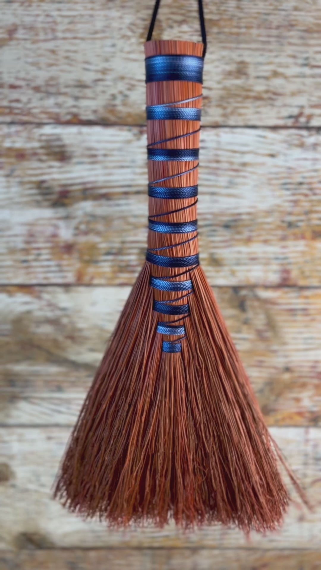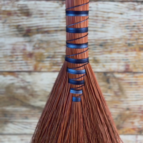 This handcrafted whisk stands at approximately 15 inches tall, shaped in the classic hawktail style with a wide, expressive fan. The bristles are dyed a vivid sunrise orange, creating a warm, fiery foundation that glows from top to bottom. The handle is wrapped in a smooth ombré blue thread that shifts from bright sky to deep twilight, adding depth, contrast, and a sense of movement. This whisk is a bold, luminous piece that carries sunrise energy and a sense of fresh ignition.