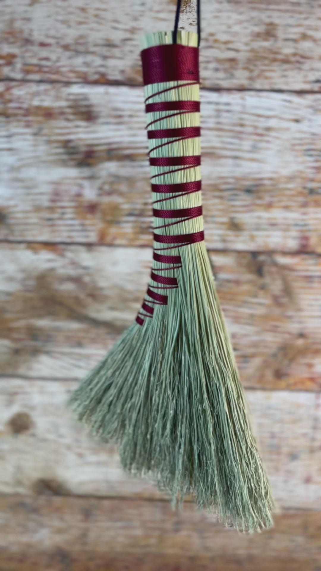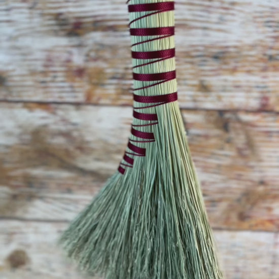 This handcrafted whisk stands at approximately 15 inches tall, shaped in the classic turkey wing style with a full, elegant fan. The bristles are made from natural, undyed broomcorn, offering soft variation and organic texture throughout the spread. The handle is wrapped in deep wine-red thread, creating a striking contrast that feels warm, bold, and timeless.