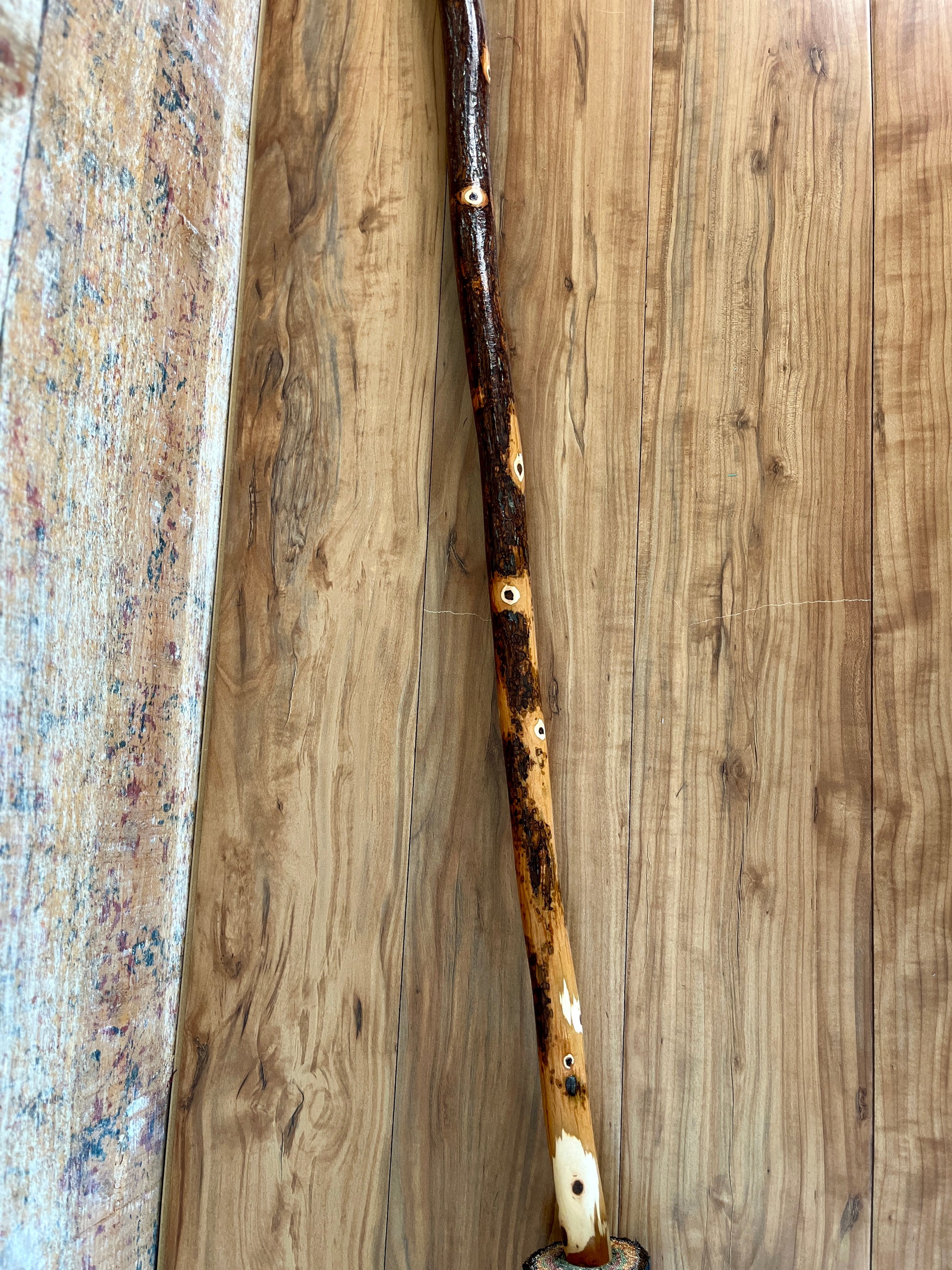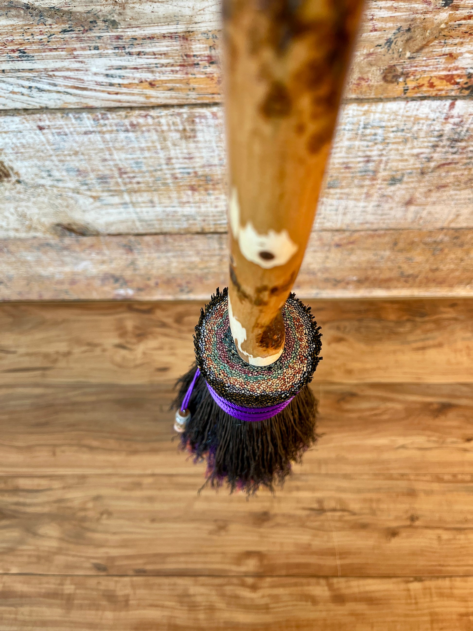The natural wood handle is hand-finished to reveal striking patterns and pale knotted markings, giving the piece a grounded, ancient presence. Standing at approximately 58 inches tall, this besom carries a steady, intuitive, boundary-walking energy ideal for shadow work, spiritual awareness, and moments of transition.