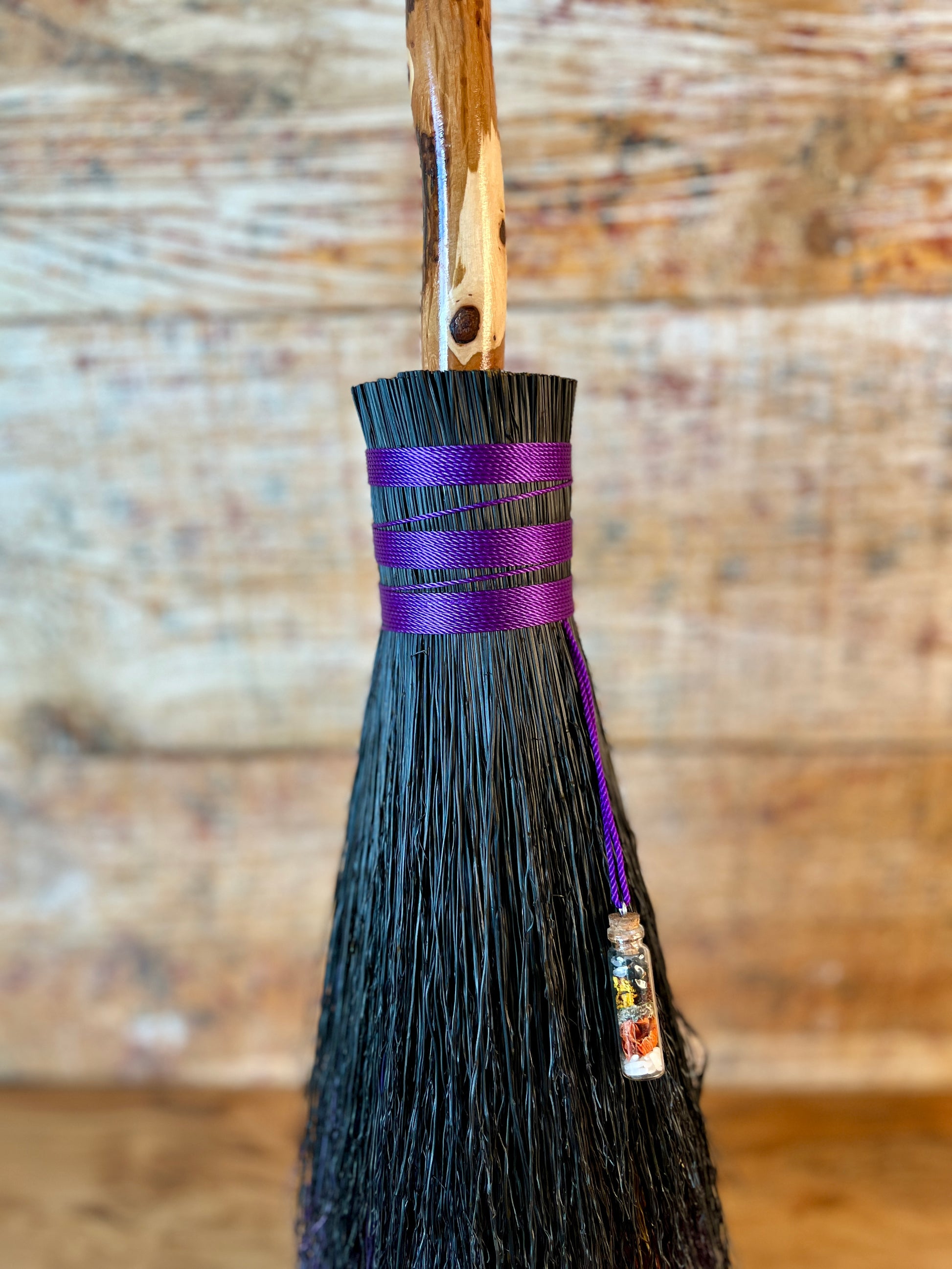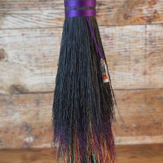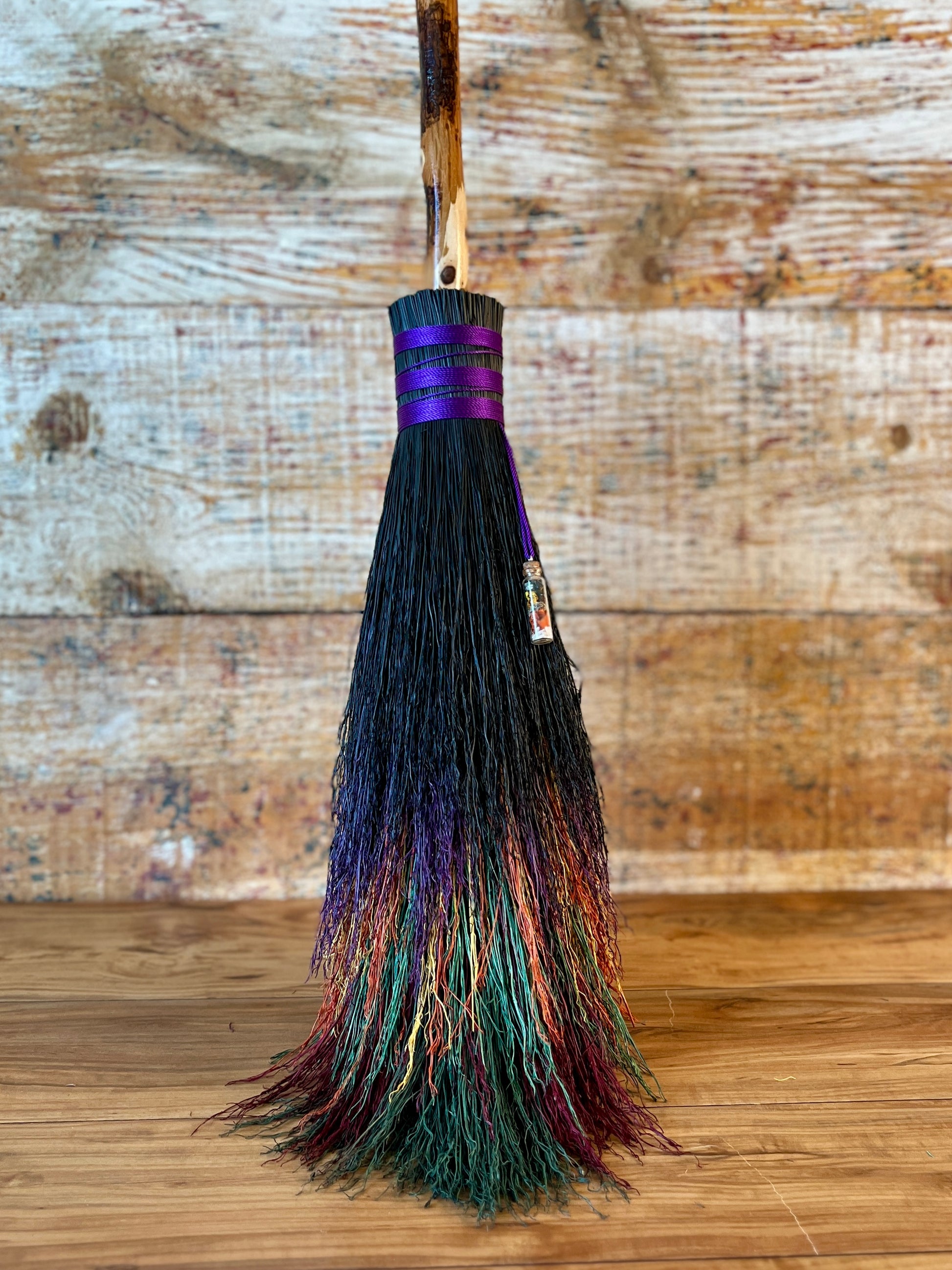 This handcrafted full-size besom blends deep black broomcorn with layered bursts of violet, ember-orange, forest green, and wine-red, creating an otherworldly gradient that evokes threshold magic and liminal movement. The neck is wrapped in rich purple thread, with a small glass vial suspended at the side and filled with herbs, spices, and crystal chips chosen for clarity, intuition, and protection.