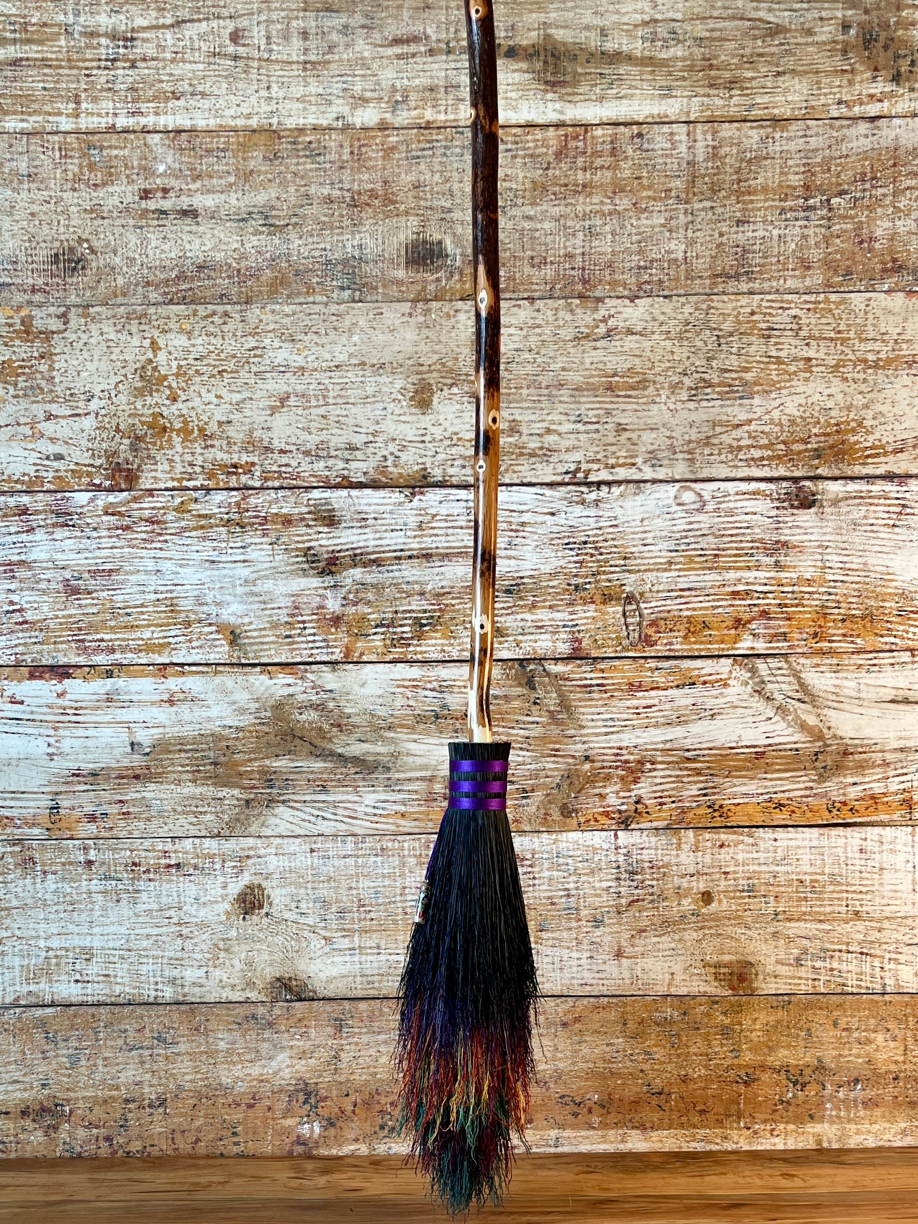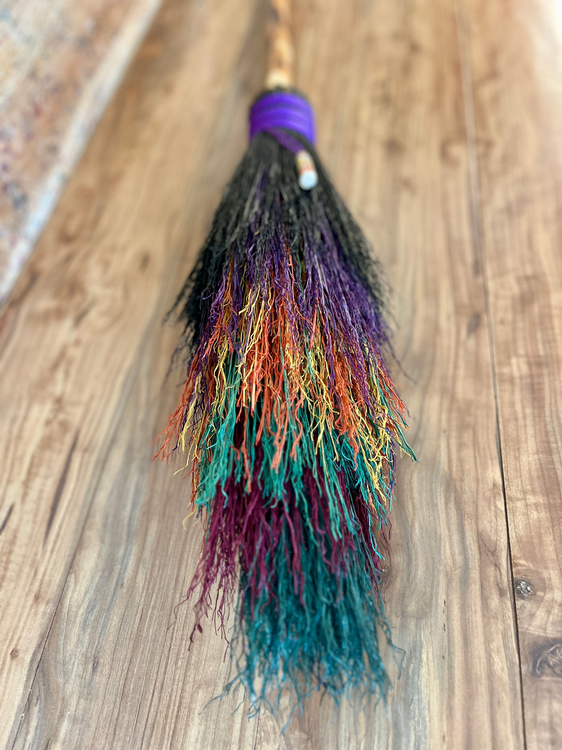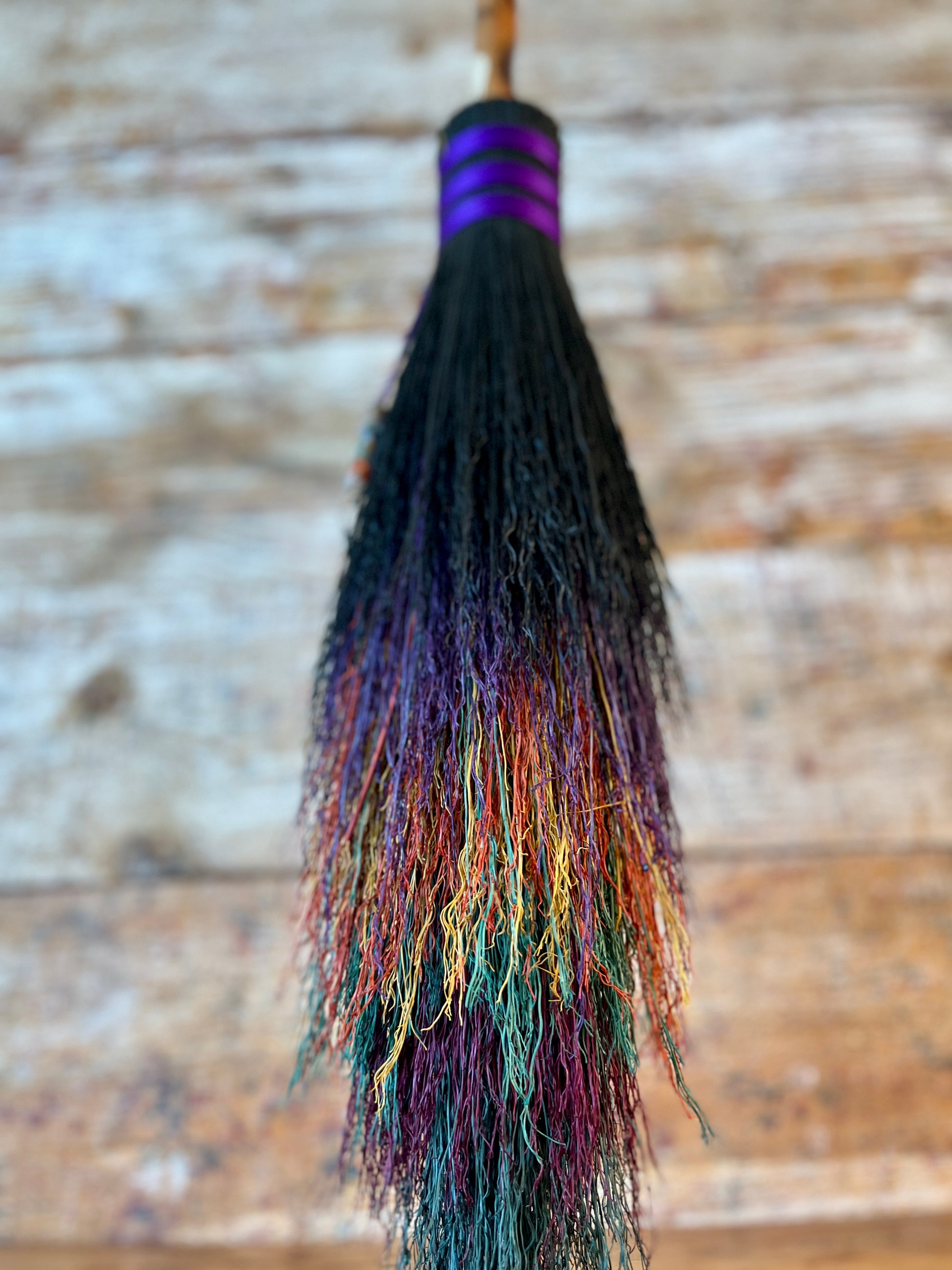 This handcrafted full-size besom blends deep black broomcorn with layered bursts of violet, ember-orange, forest green, and wine-red, creating an otherworldly gradient that evokes threshold magic and liminal movement. The neck is wrapped in rich purple thread, with a small glass vial suspended at the side and filled with herbs, spices, and crystal chips chosen for clarity, intuition, and protection.