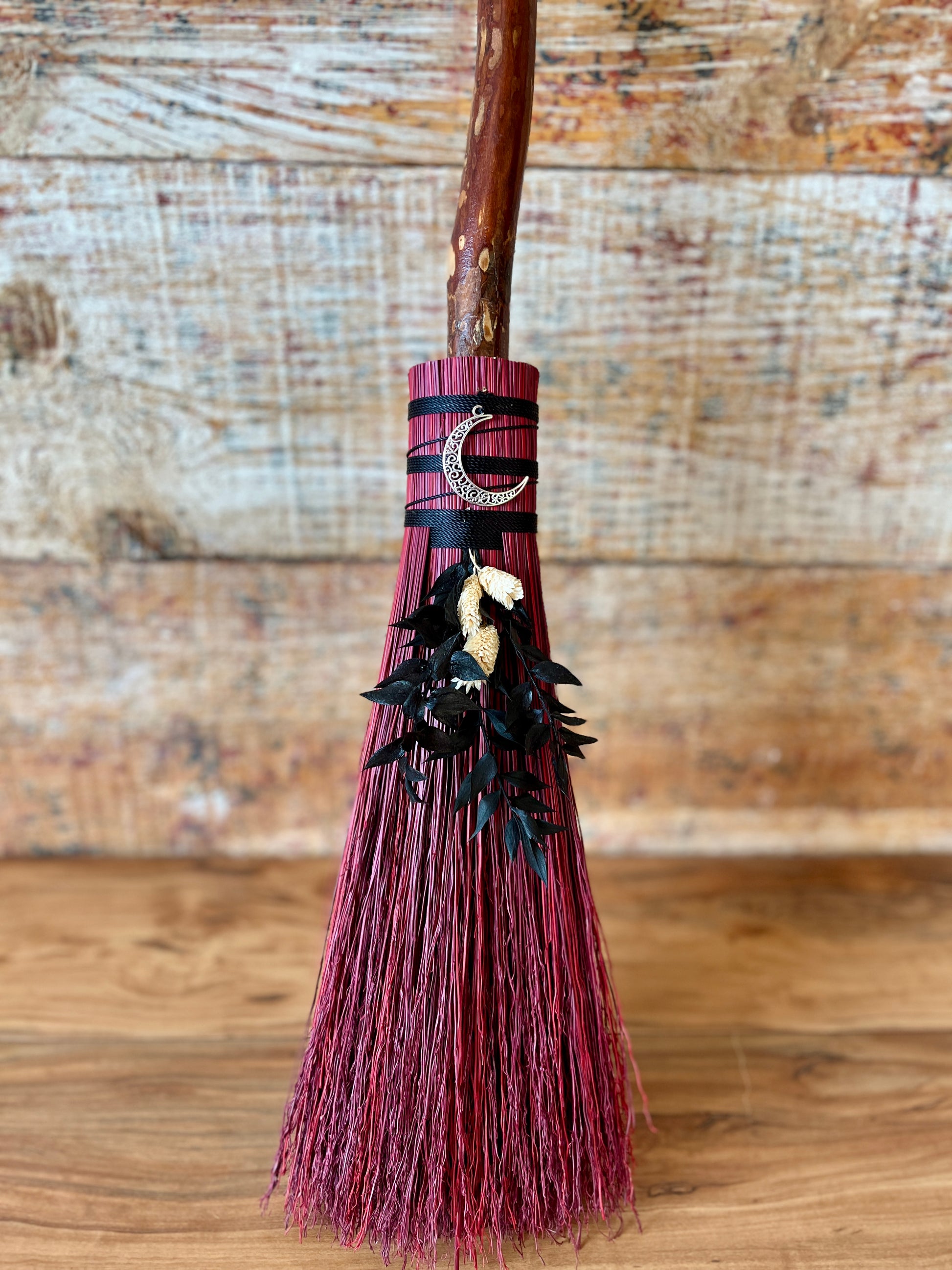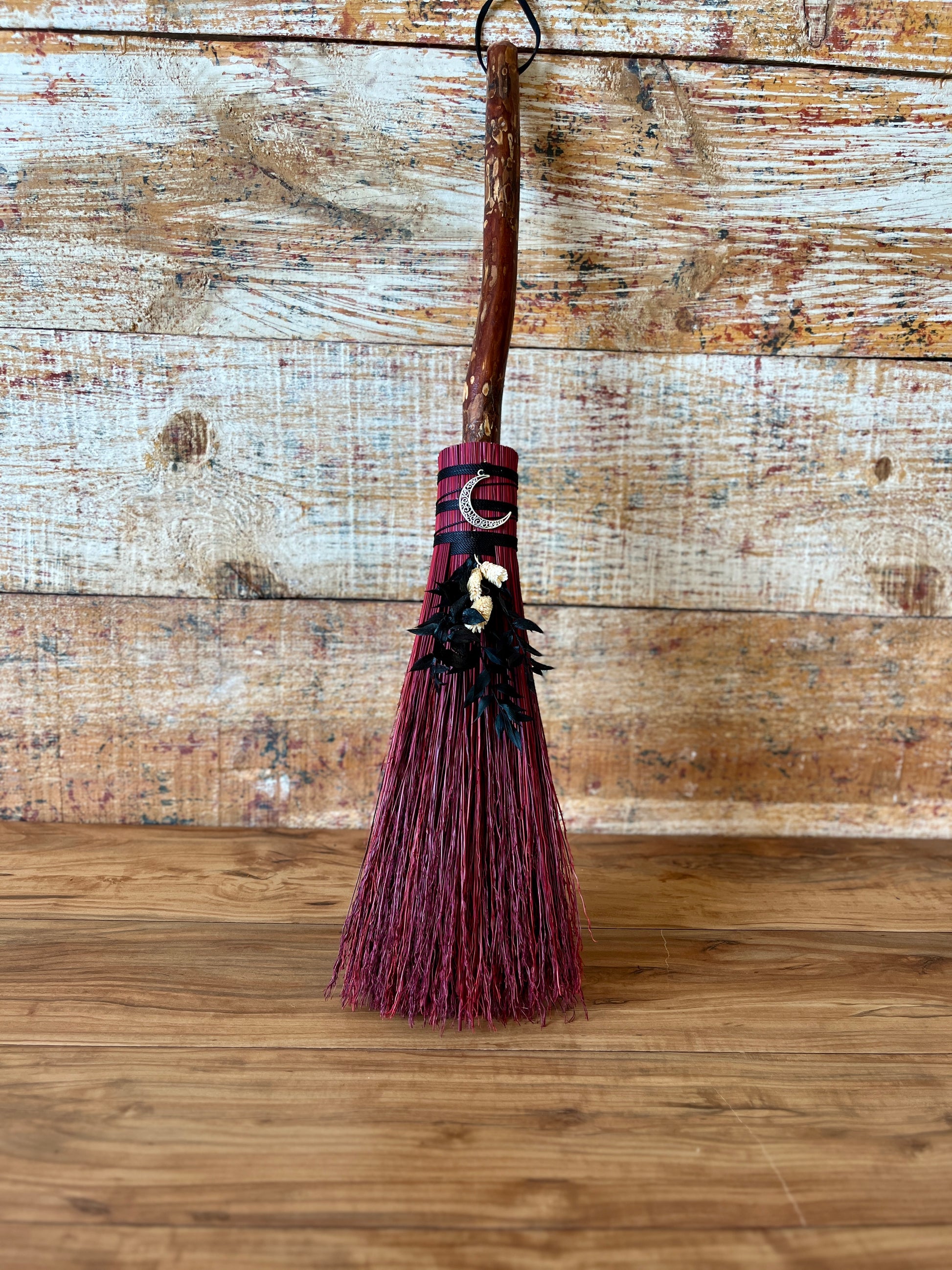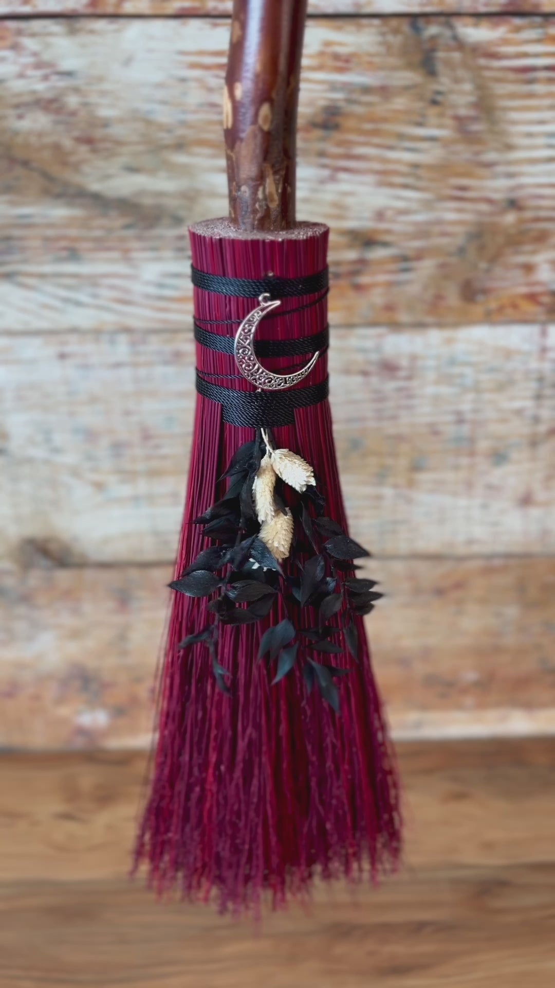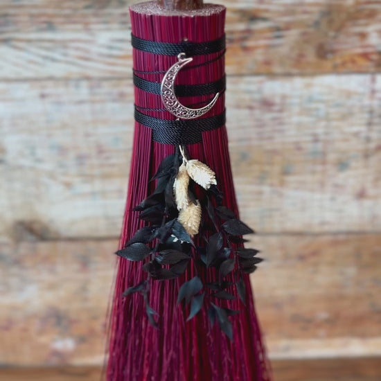 Crimson Moonrise is a striking, hand-crafted besom wrapped in shadowed elegance. Its bristles blend deep red and wine-toned hues, creating a rich, dimensional sweep of color that feels both fierce and refined. Wrapped with black thread for contrast, the neck is adorned with an ornate silver crescent moon charm that catches the light softly, adding a quiet lunar presence.