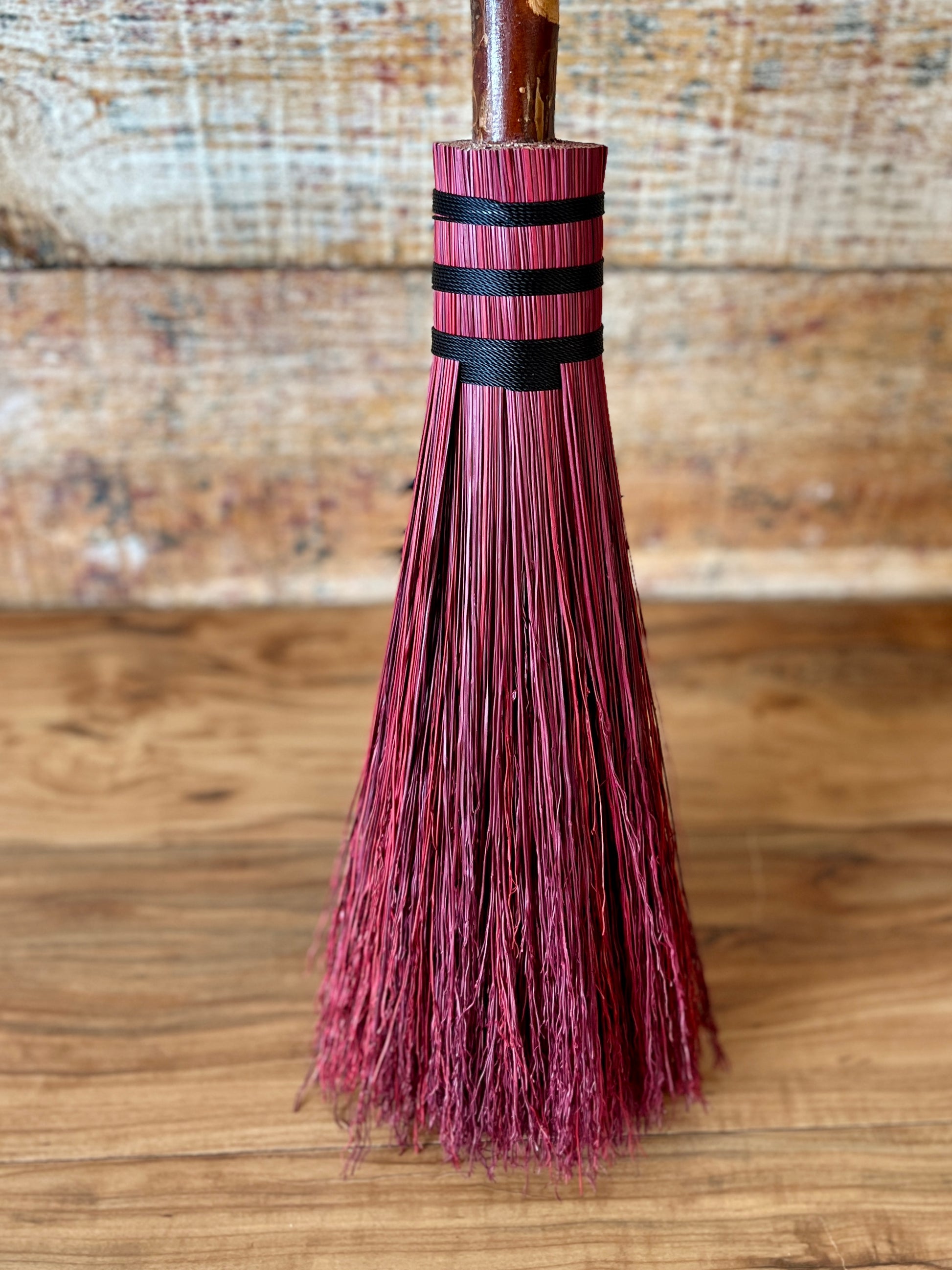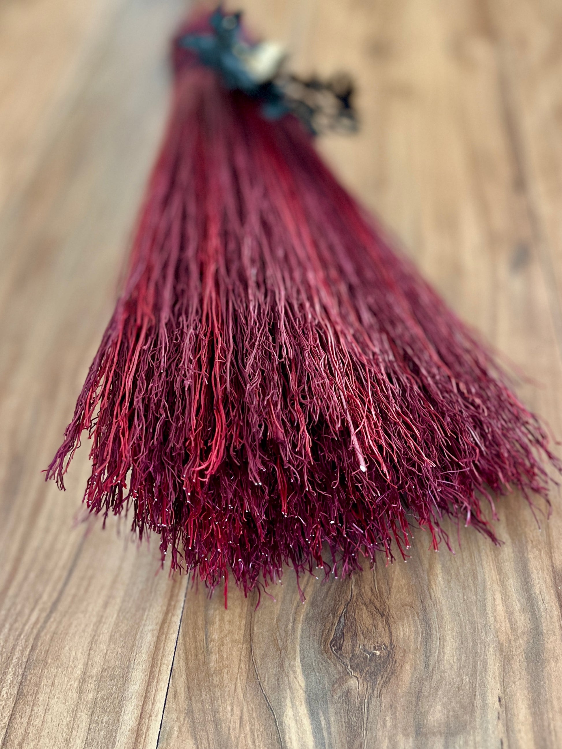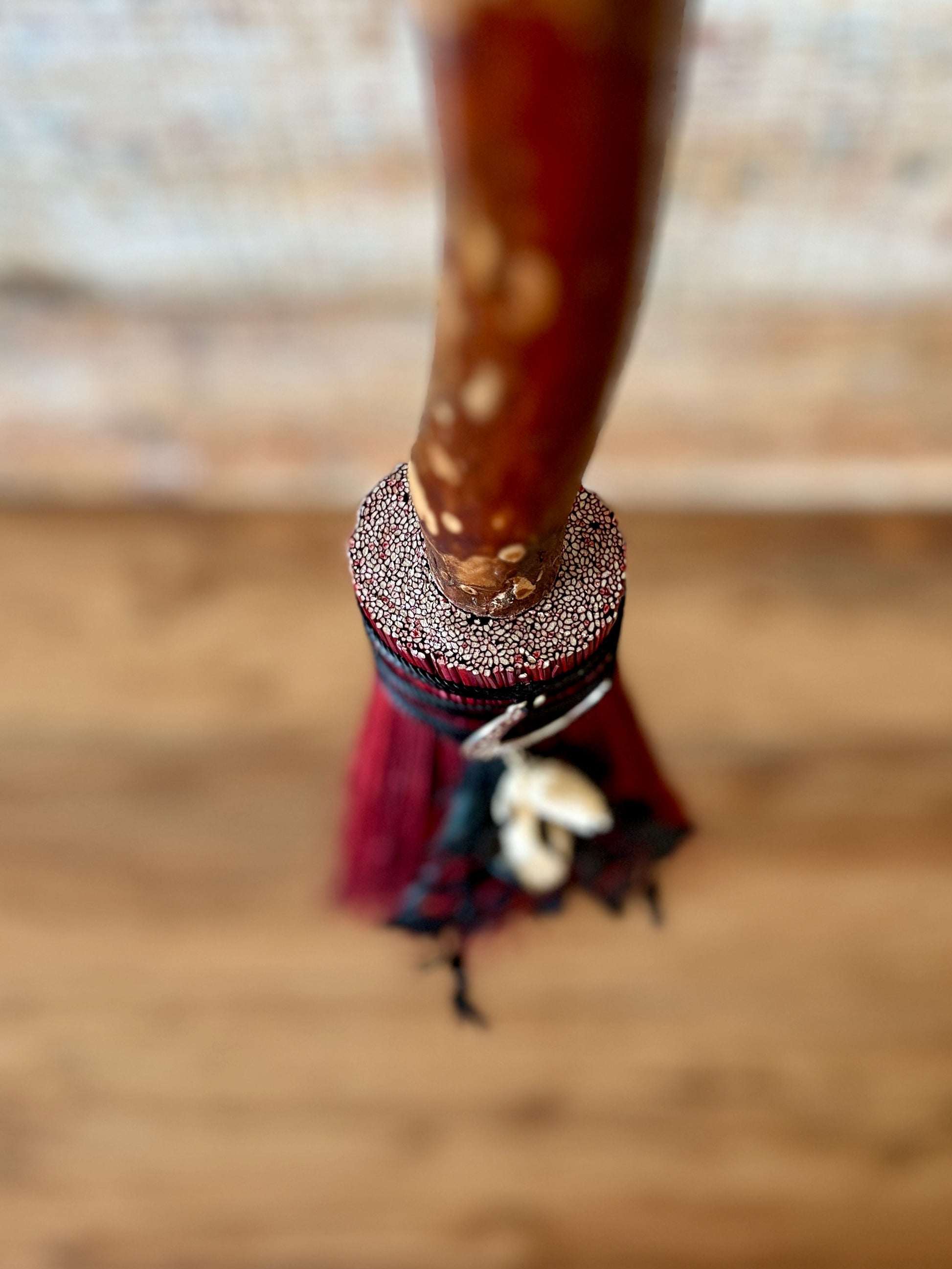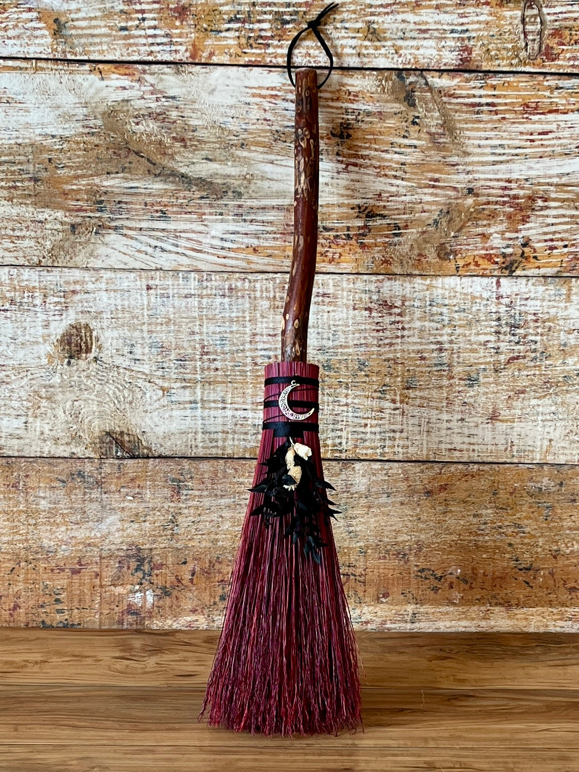 Crimson Moonrise is a striking, hand-crafted besom wrapped in shadowed elegance. Its bristles blend deep red and wine-toned hues, creating a rich, dimensional sweep of color that feels both fierce and refined. Wrapped with black thread for contrast, the neck is adorned with an ornate silver crescent moon charm that catches the light softly, adding a quiet lunar presence.