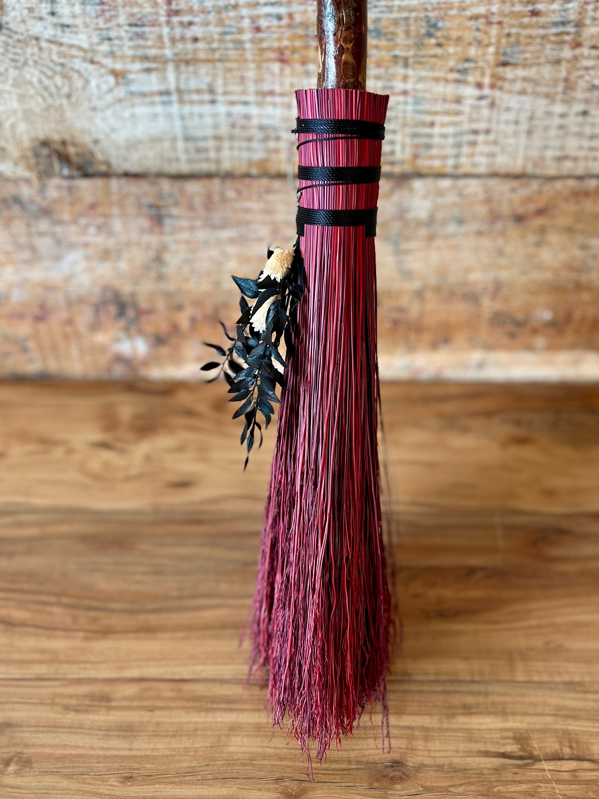 A small botanical bundle in black and cream offers texture and contrast, giving the piece a balanced, moody beauty. The twisted, natural wood handle brings warmth and grounding, making this besom feel both ceremonial and deeply rooted.