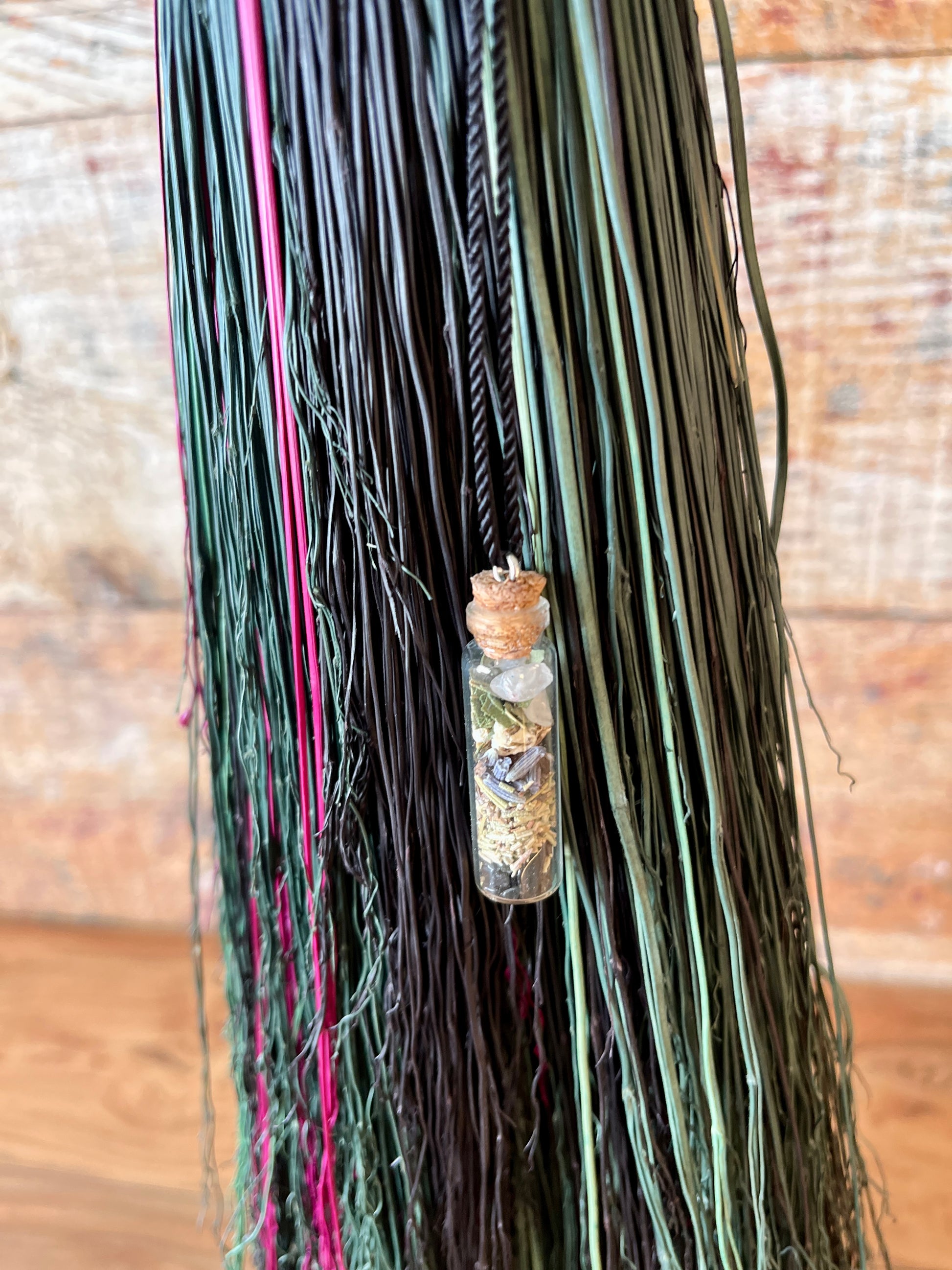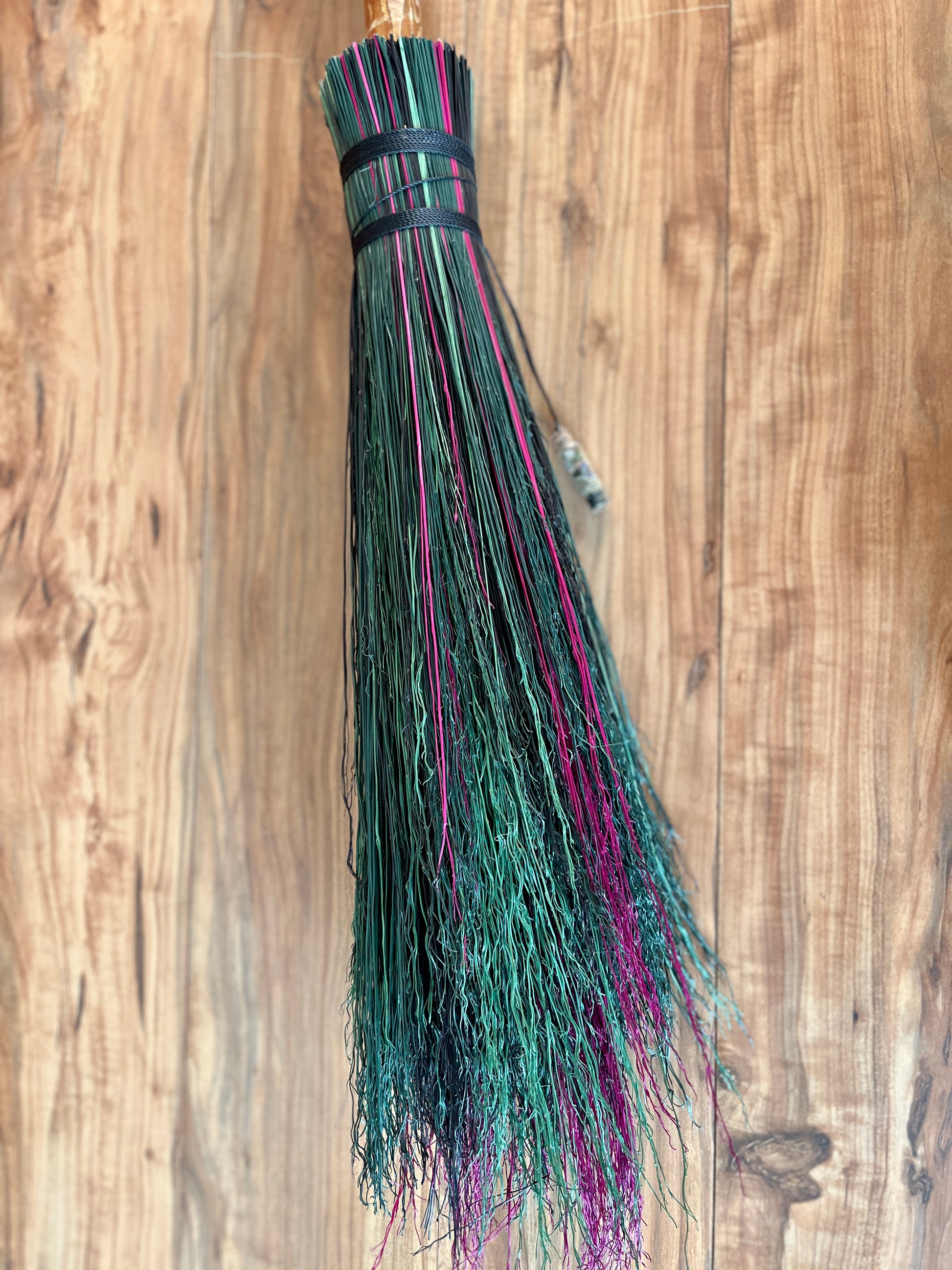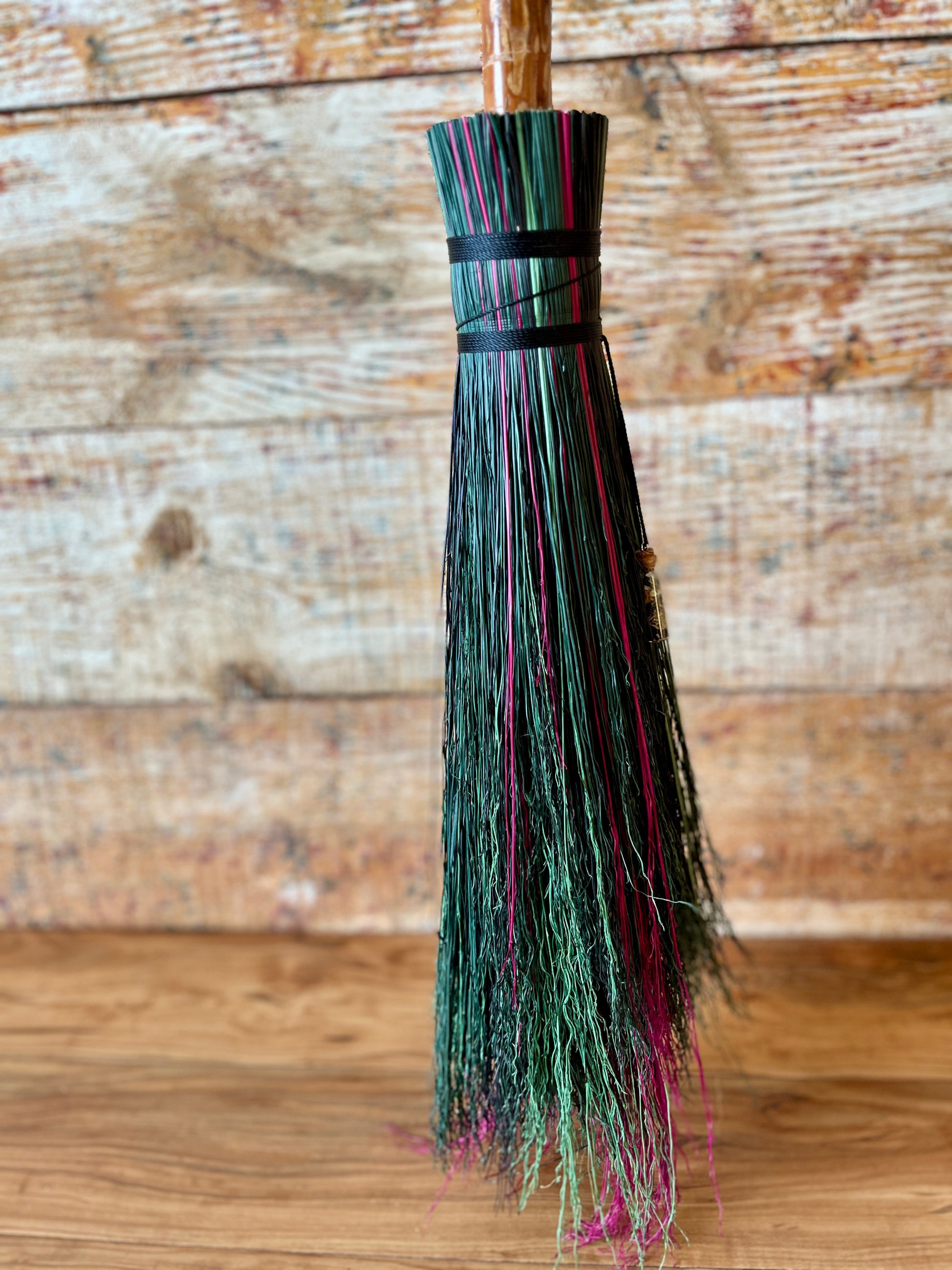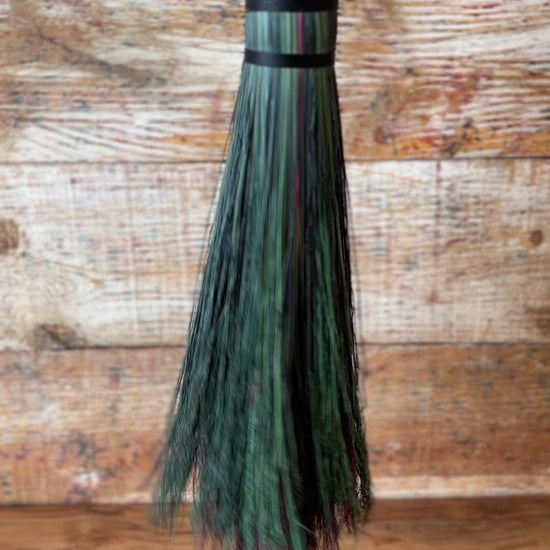 This handcrafted full-size besom features layers of fuchsia, kelly green, dark green, and black broomcorn, creating a vivid and powerful color palette that evokes rebirth, courage, and bold self-expression. The neck is wrapped with black thread, pulling the colors and energy of the broom into harmony. A glass vial rests at the neck, offering a quiet touch of intention without distracting from the striking contrast of the bristles. Standing at approximately 59 inches tall, this besom carries the energy of rising, reclaiming, and stepping forward with unshakeable presence.