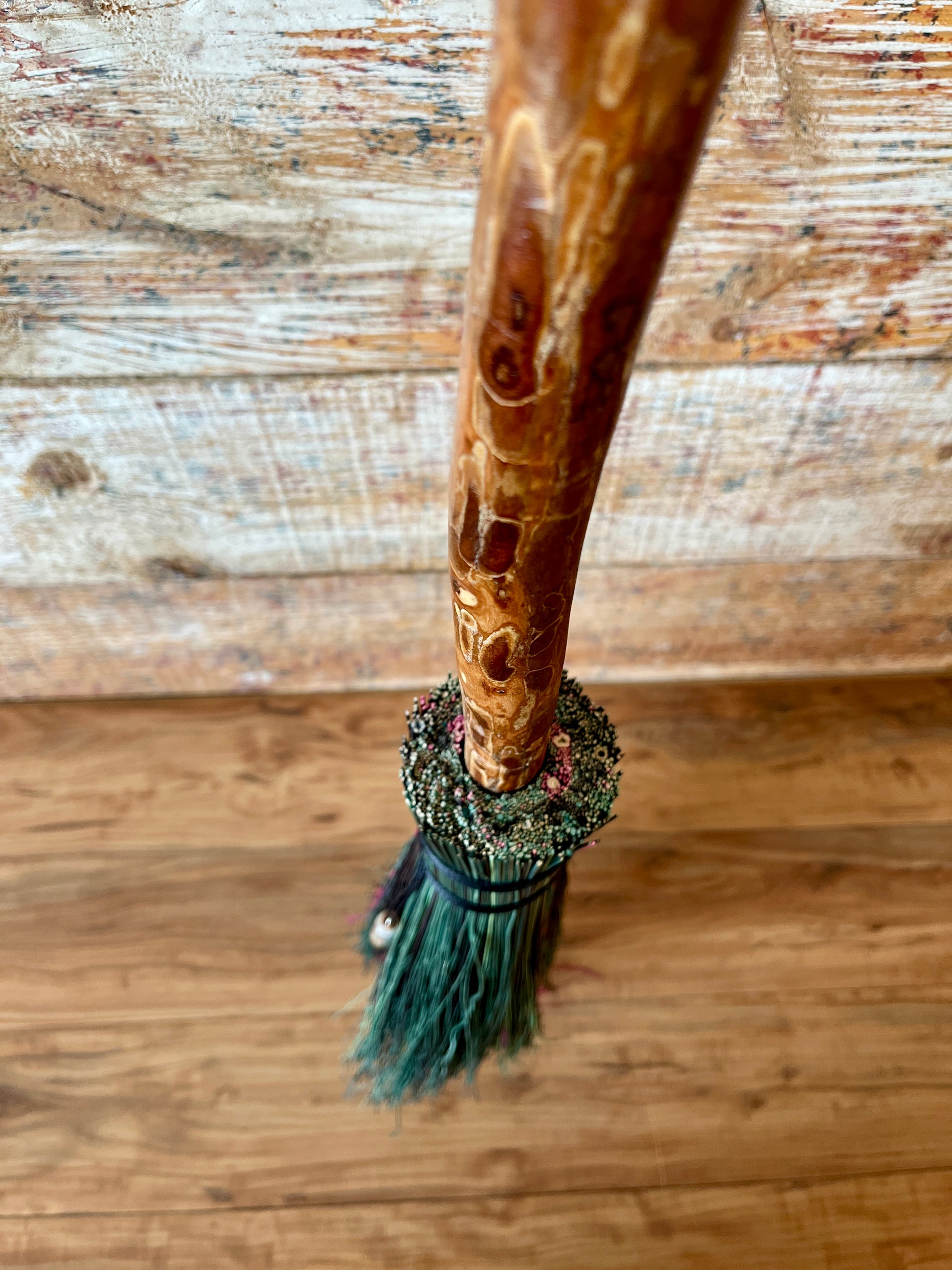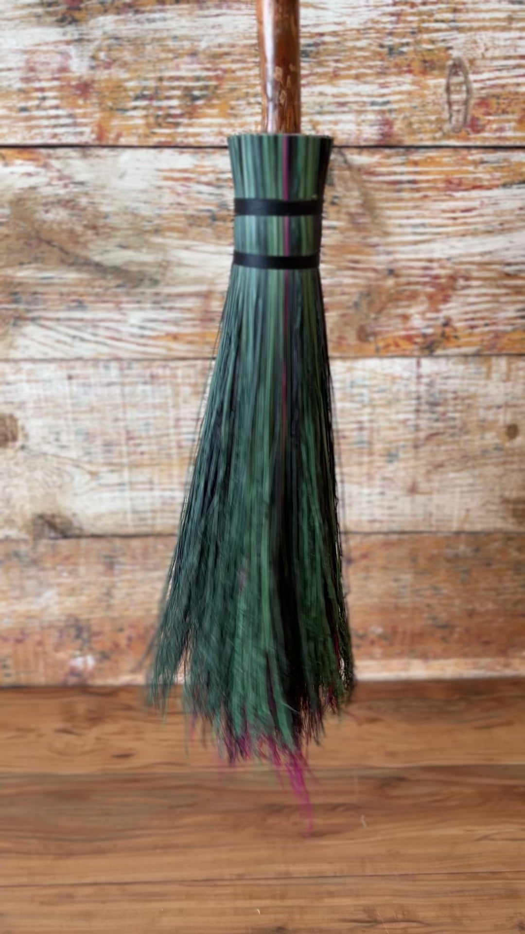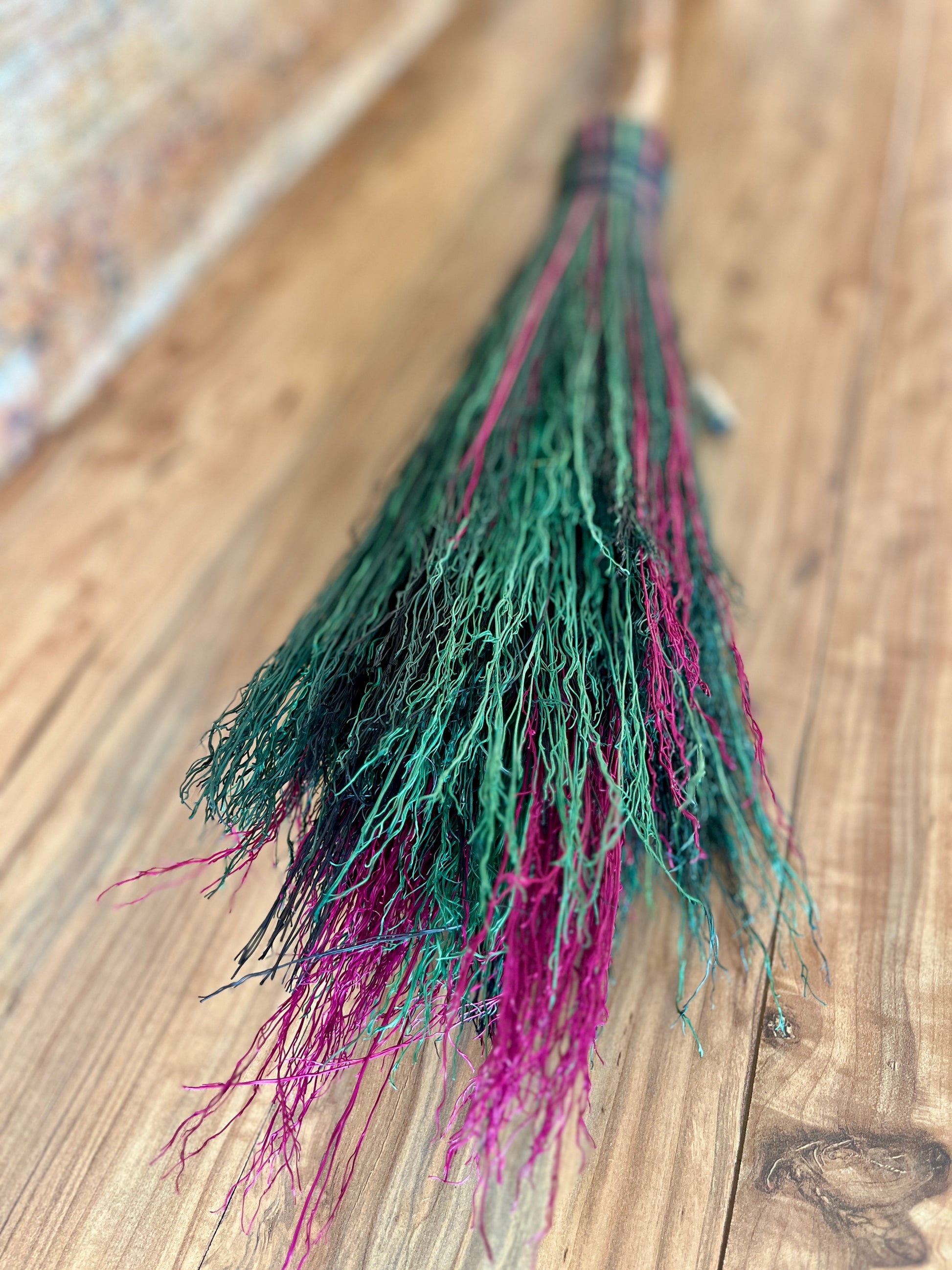 This handcrafted full-size besom features layers of fuchsia, kelly green, dark green, and black broomcorn, creating a vivid and powerful color palette that evokes rebirth, courage, and bold self-expression. The neck is wrapped with black thread, pulling the colors and energy of the broom into harmony. A glass vial rests at the neck, offering a quiet touch of intention without distracting from the striking contrast of the bristles. Standing at approximately 59 inches tall, this besom carries the energy of rising, reclaiming, and stepping forward with unshakeable presence.