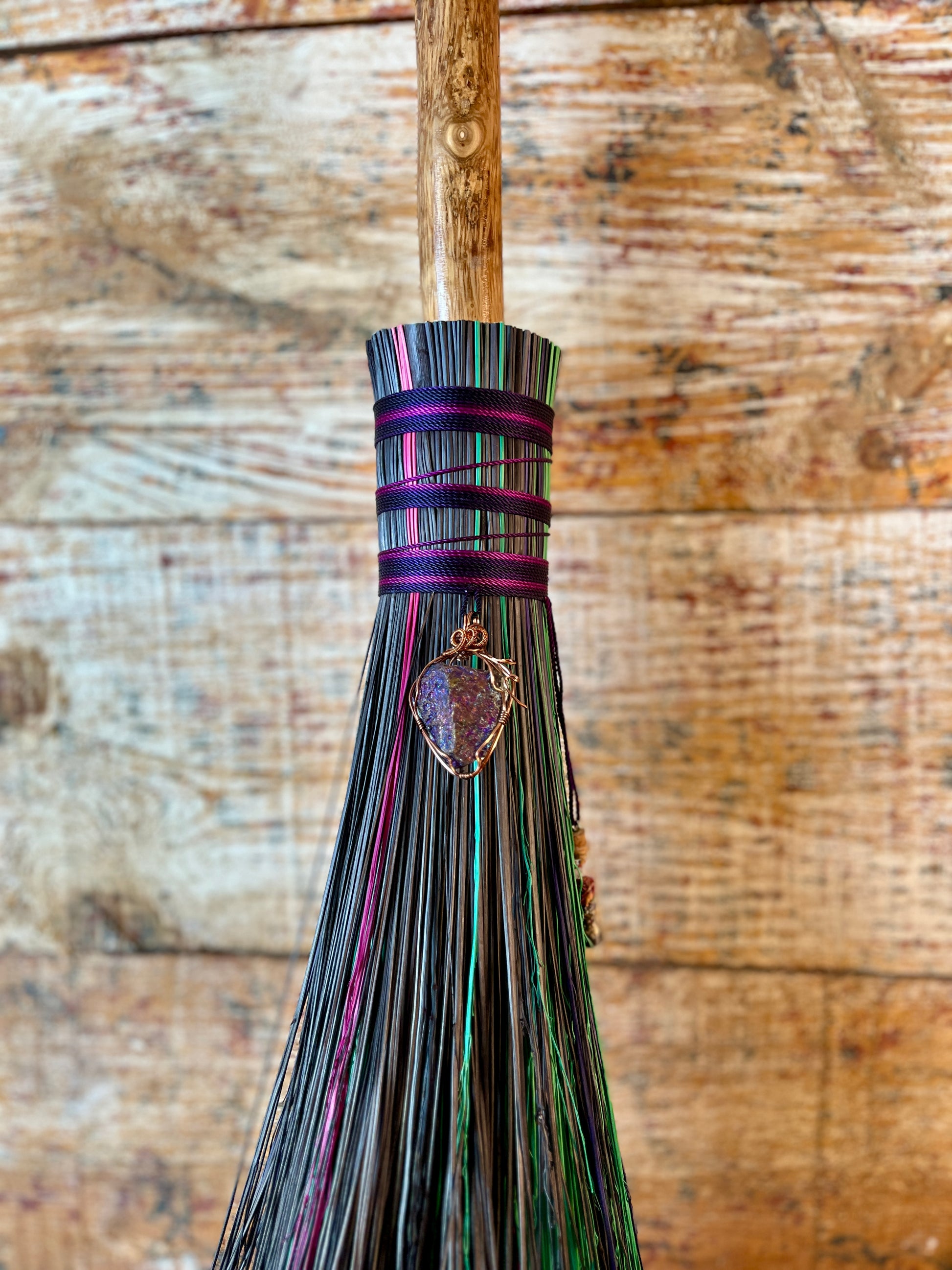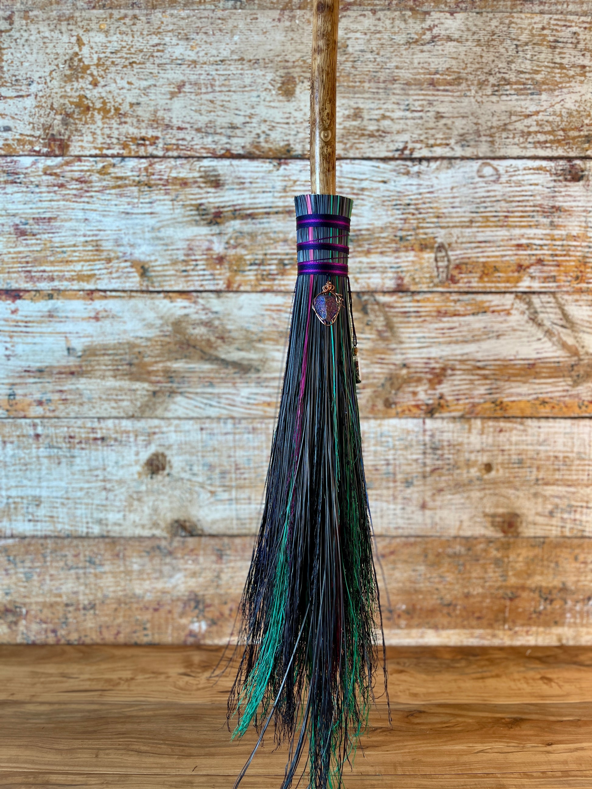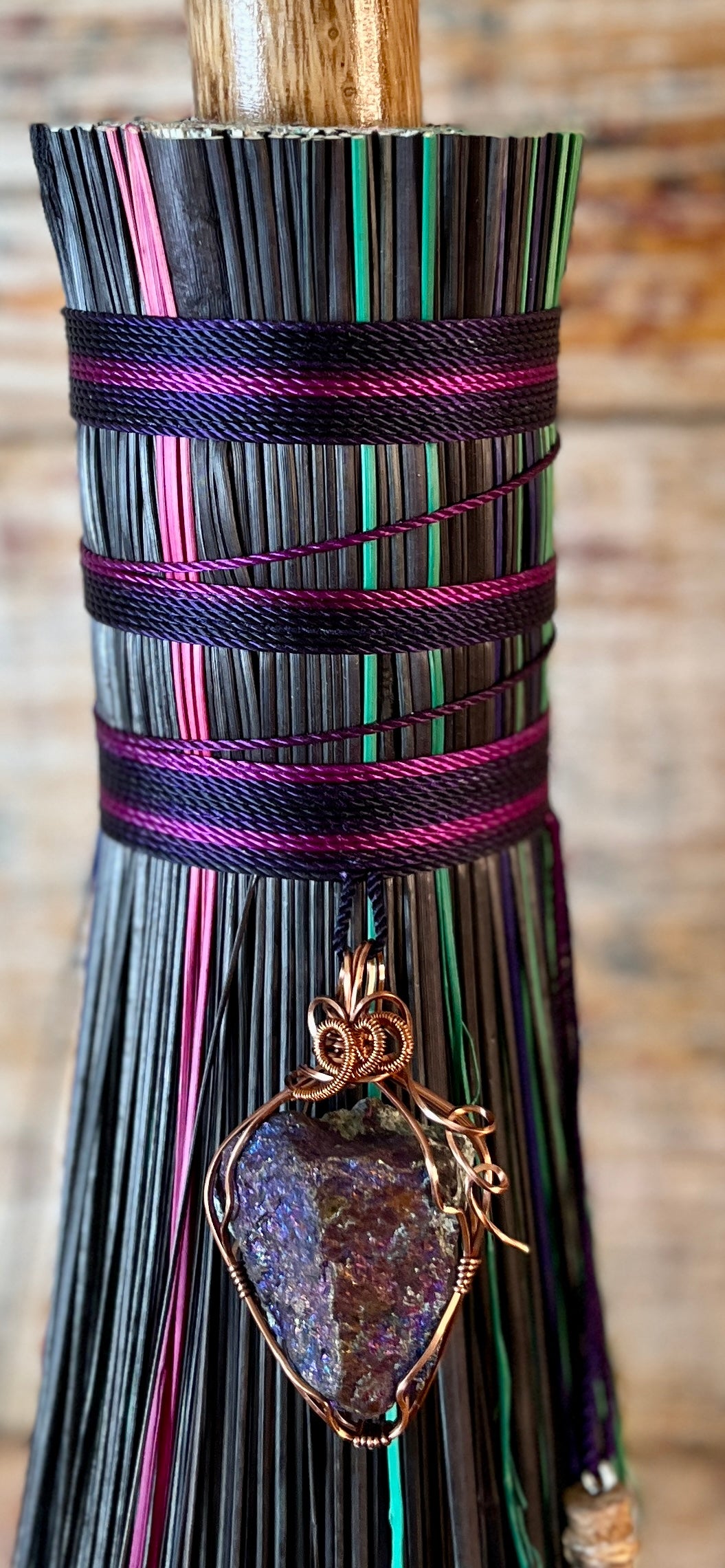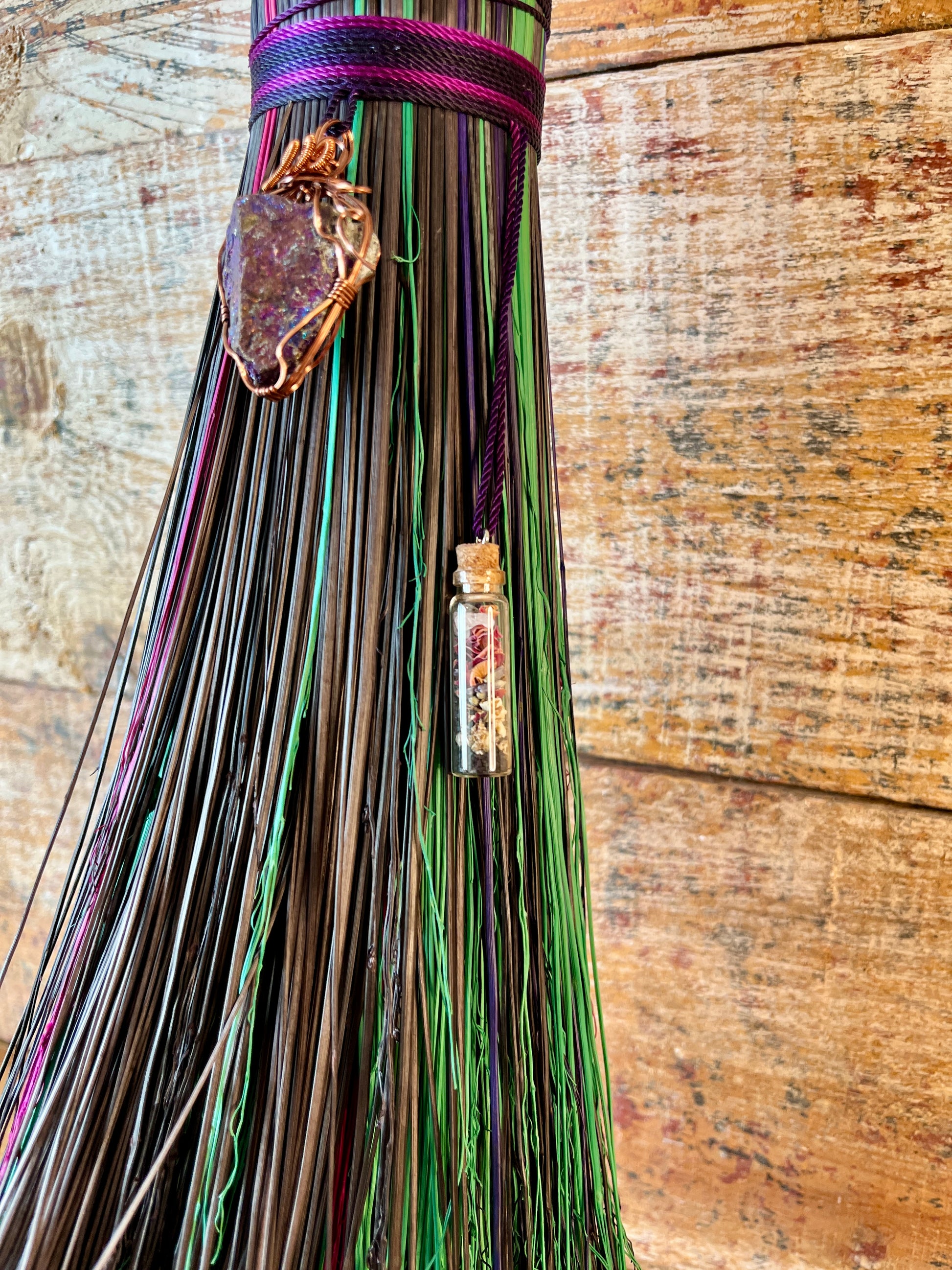 This handcrafted full-size besom stands at approximately 59 inches tall. The bristles are dyed in deep black with flashes of fuchsia and green running through the center, creating a shimmering, enchanted effect. The neck is wrapped in rich purple and fuchsia thread, and a peacock ore stone wrapped in antique copper rests at the front of the besom. A glass vial rests at the neck and holds herbs, spices, and crystal chips chosen to echo the besom’s energy of protection, joy, and transformation.