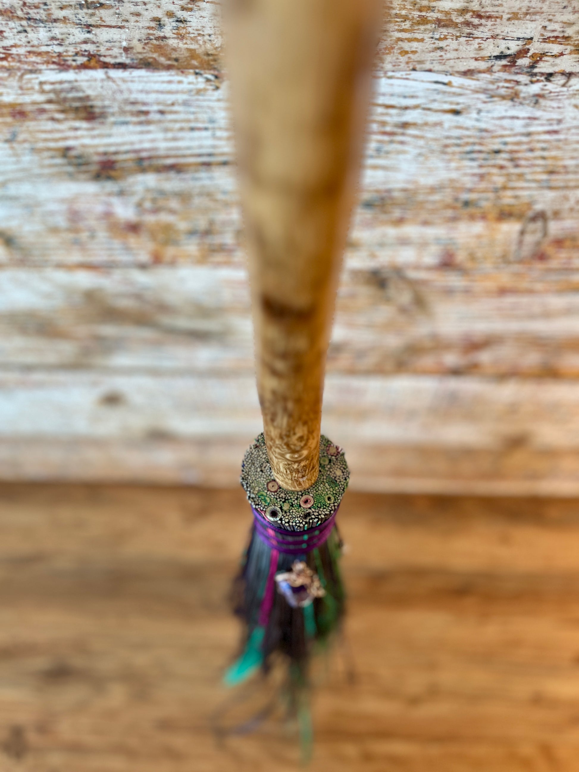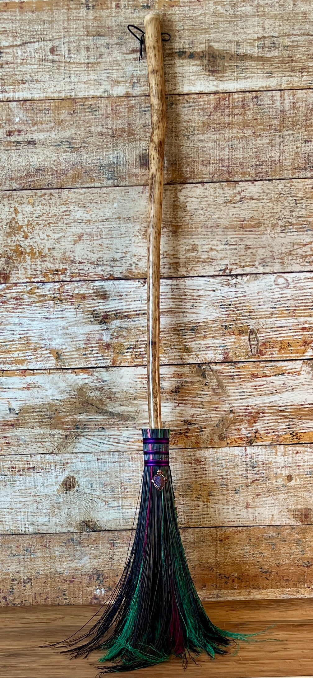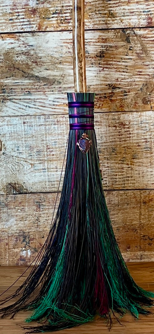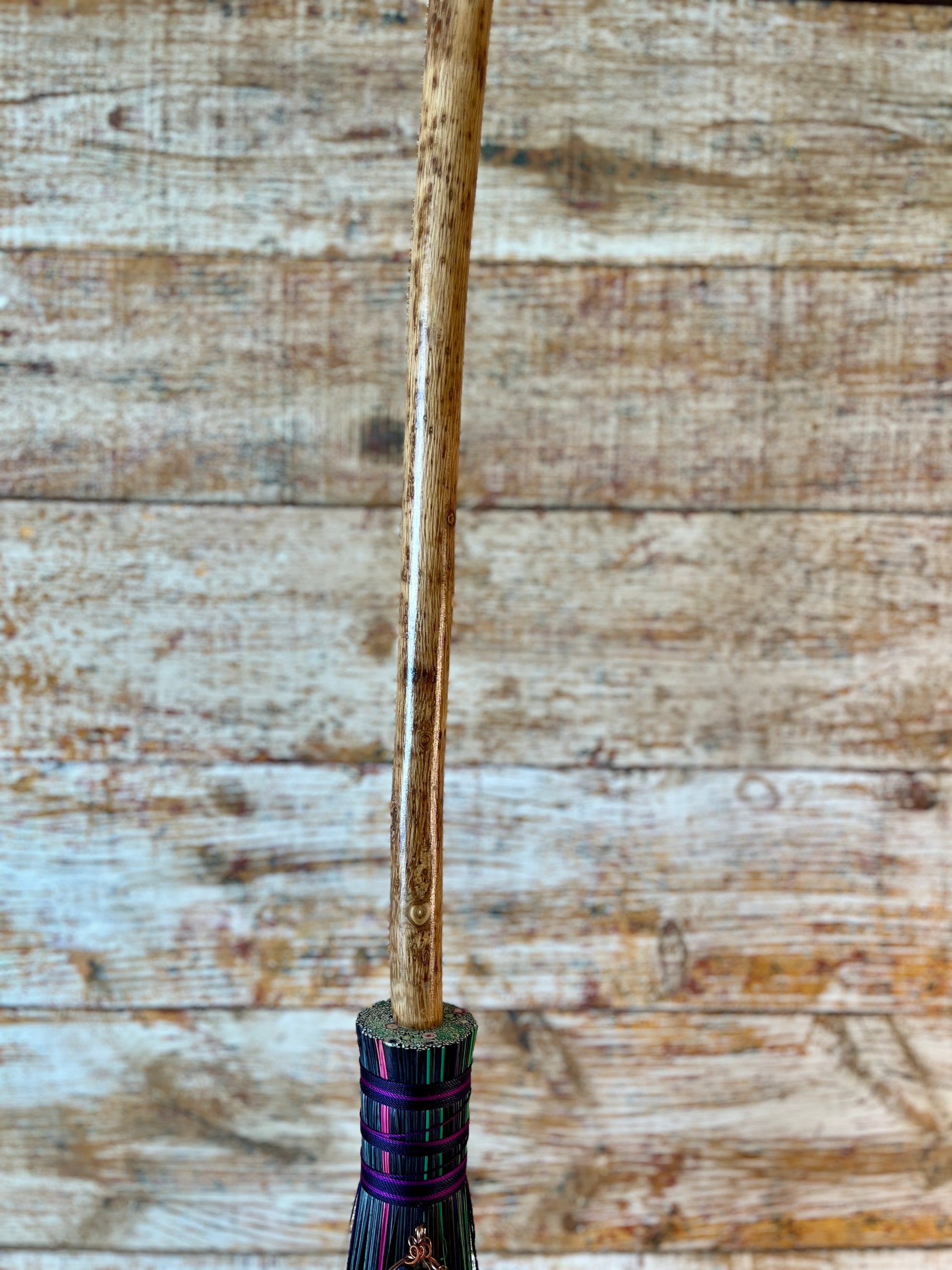 This handcrafted full-size besom stands at approximately 59 inches tall. The bristles are dyed in deep black with flashes of fuchsia and green running through the center, creating a shimmering, enchanted effect. The neck is wrapped in rich purple and fuchsia thread, and a peacock ore stone wrapped in antique copper rests at the front of the besom. A glass vial rests at the neck and holds herbs, spices, and crystal chips chosen to echo the besom’s energy of protection, joy, and transformation.