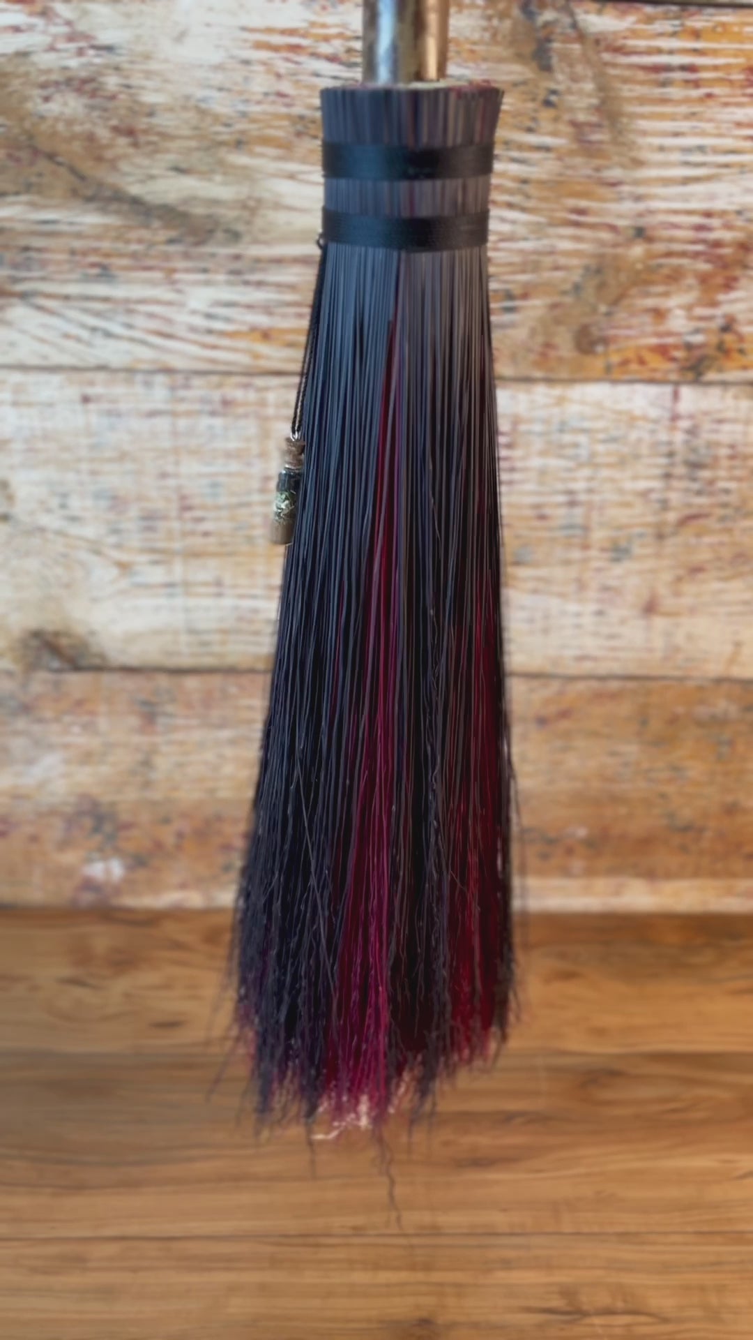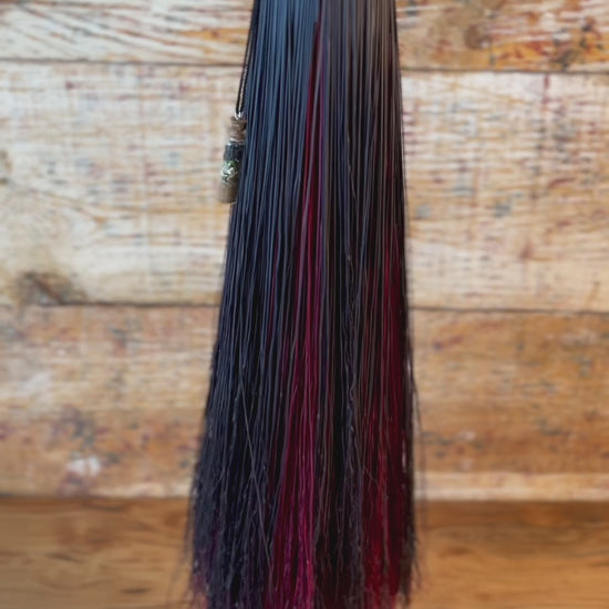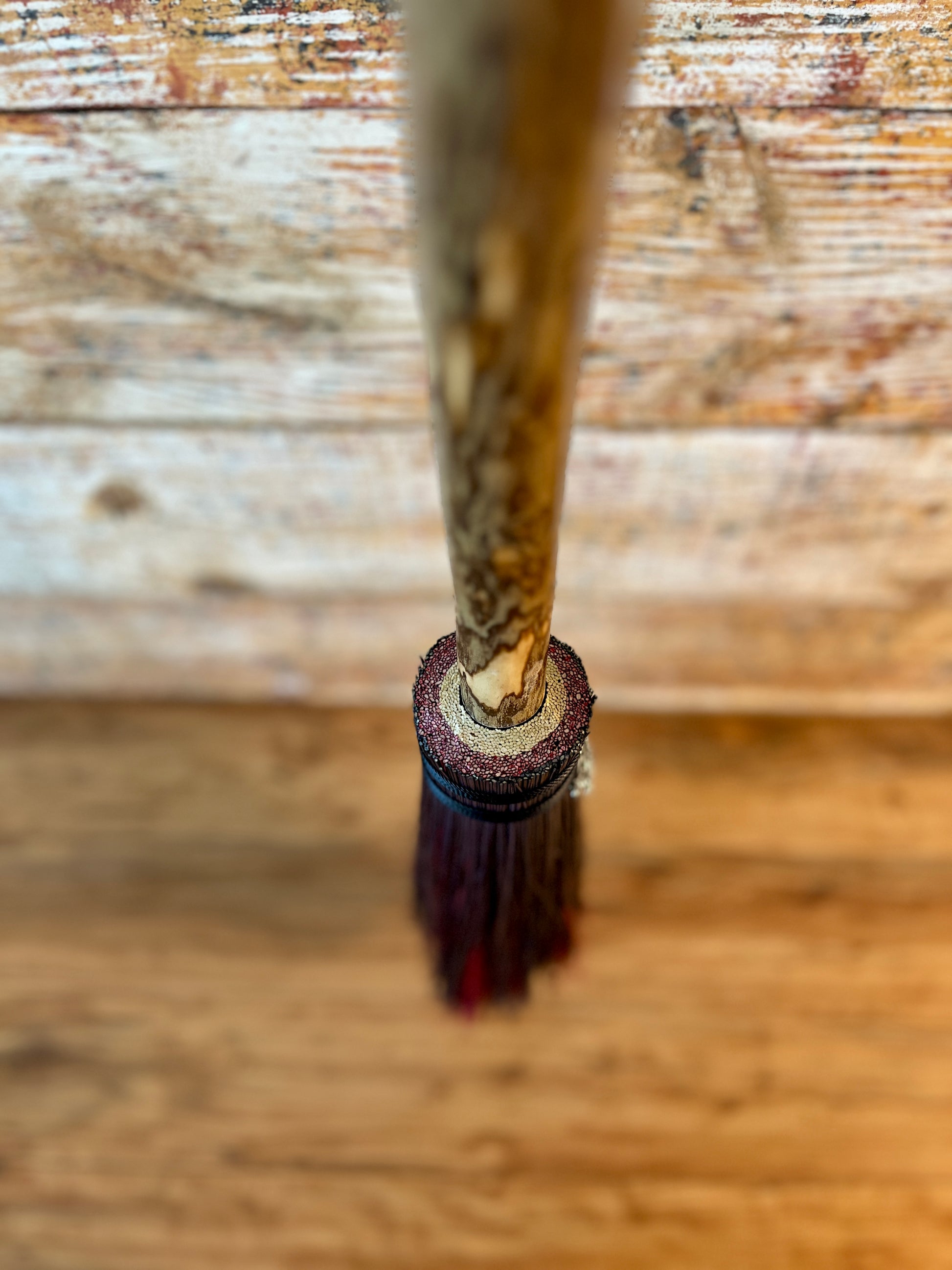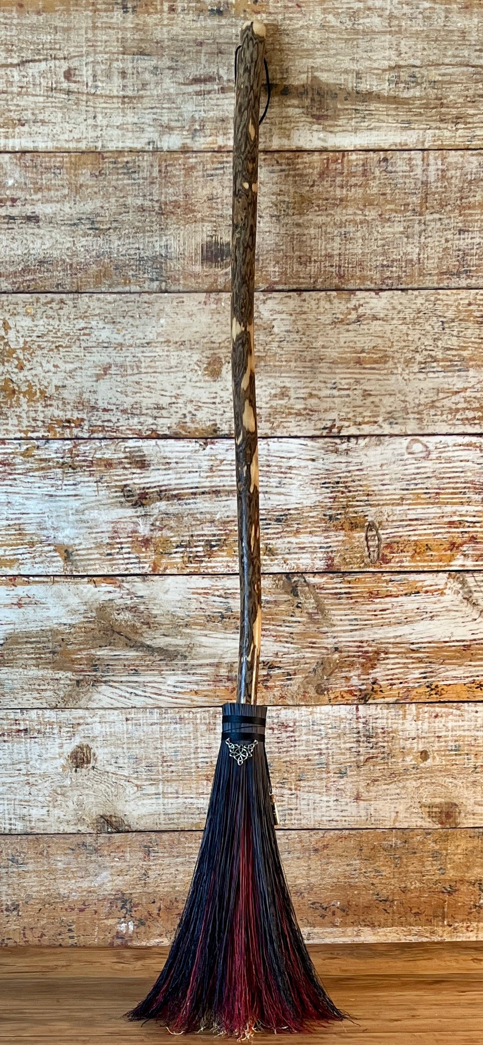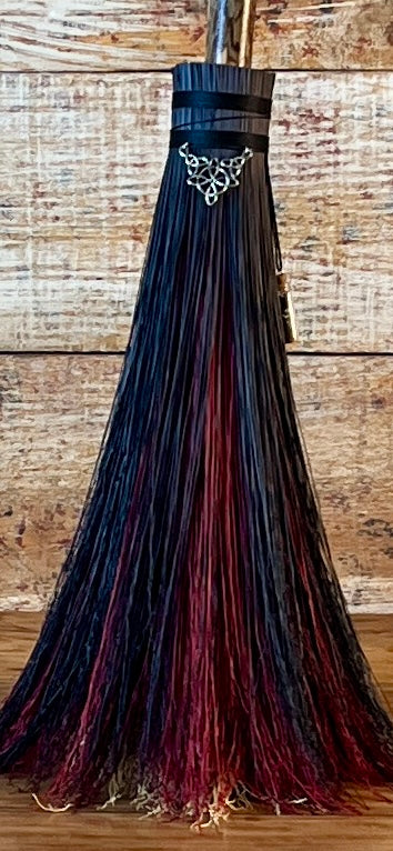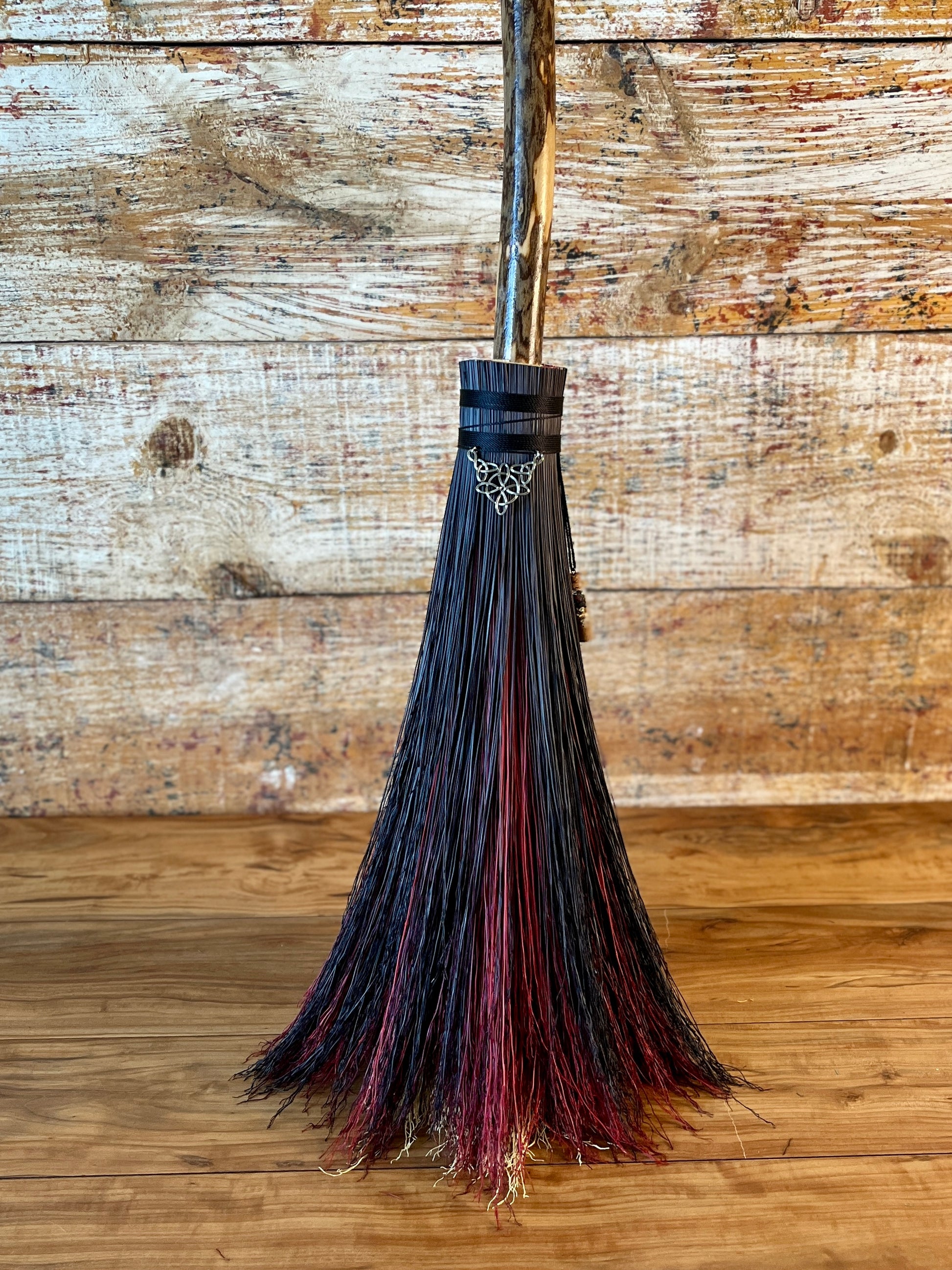 This handcrafted full-size besom features a layered blend of natural broomcorn at the core, a deep red mid-layer, and a sleek black outer cloak. The handle showcases striking natural grain and organic patterning, giving it an ancient, fire-forged presence. The neck is wrapped in black thread and adorned with a Celtic knot charm, symbolizing unity and unbroken strength. A small glass vial behind the wrap holds herbs, spices, and crystal chips, offering energetic support while maintaining a clean, intentional design. Standing at approximately 59 inches, Eternal Flame carries a fierce, empowering energy rooted in transformation, protection, and self-reclamation.