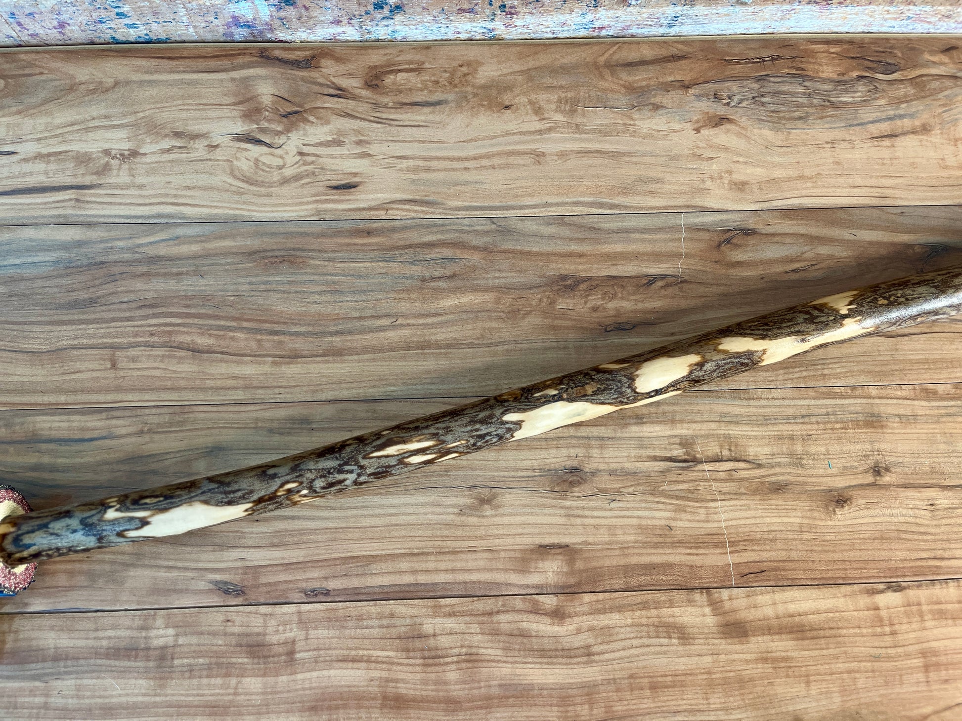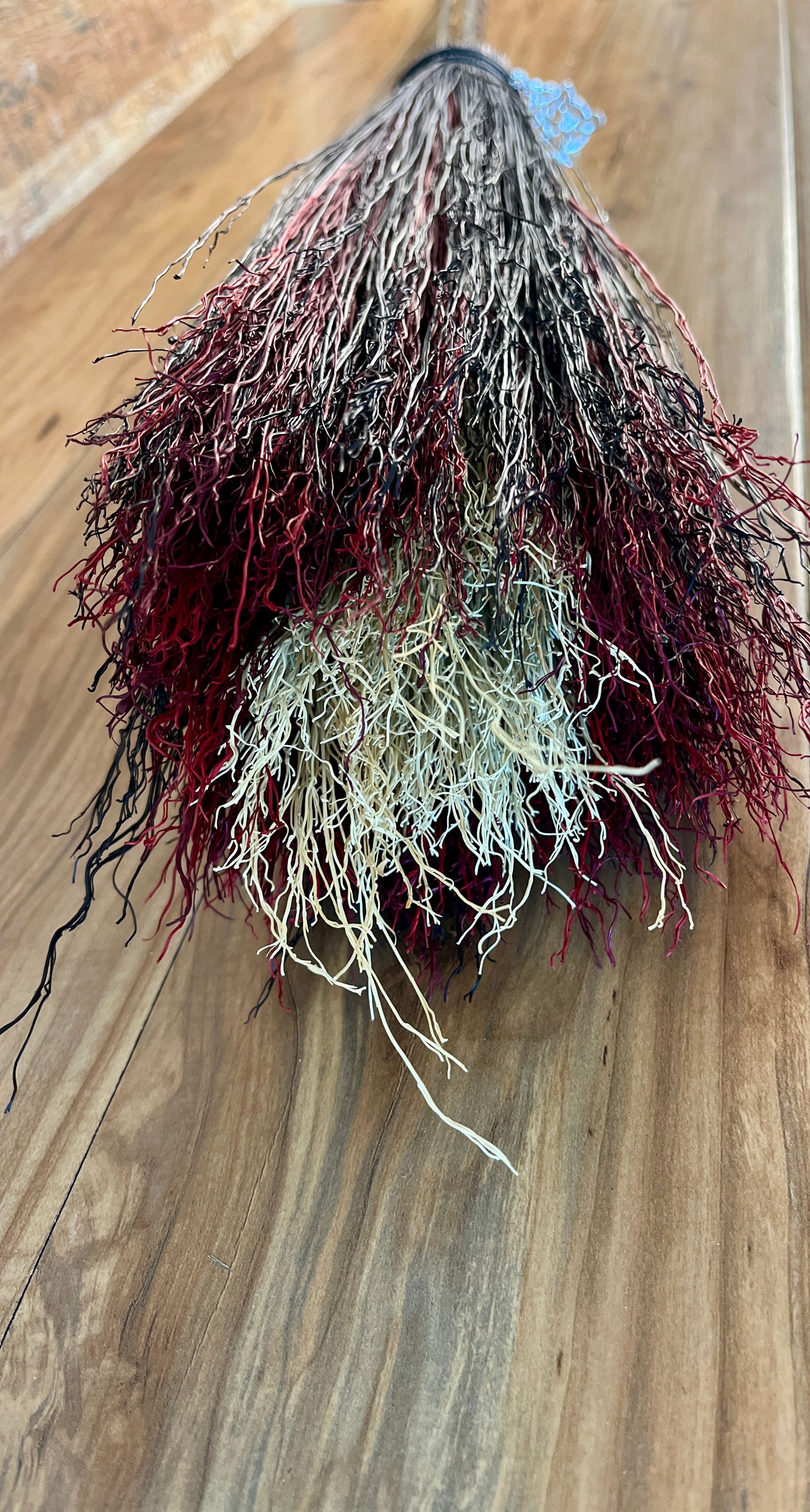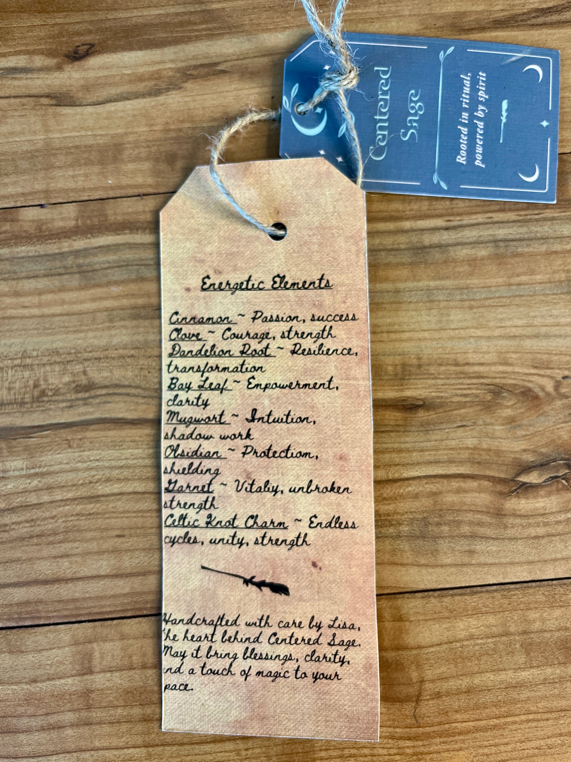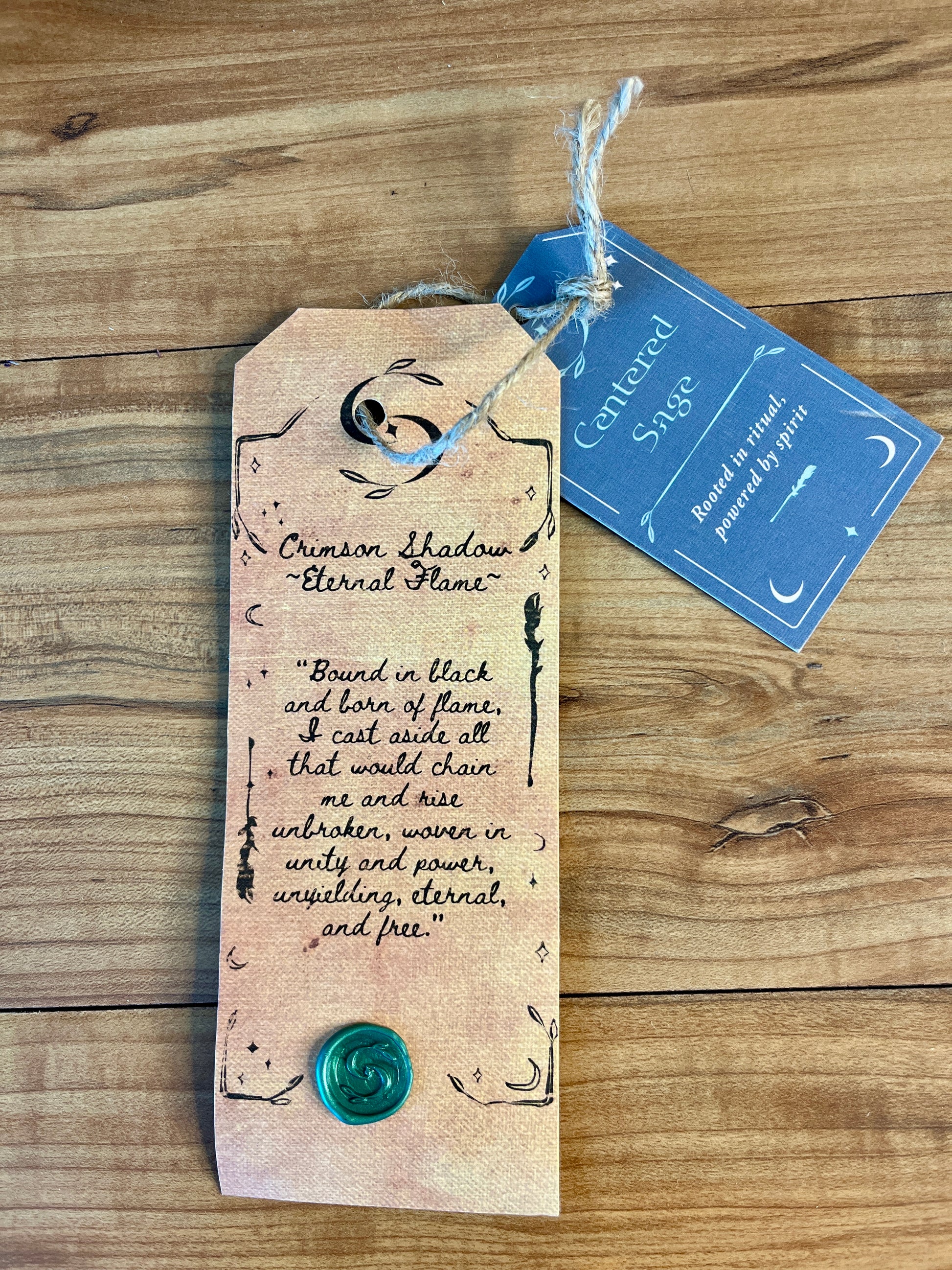 This handcrafted full-size besom features a layered blend of natural broomcorn at the core, a deep red mid-layer, and a sleek black outer cloak. The handle showcases striking natural grain and organic patterning, giving it an ancient, fire-forged presence. The neck is wrapped in black thread and adorned with a Celtic knot charm, symbolizing unity and unbroken strength. A small glass vial behind the wrap holds herbs, spices, and crystal chips, offering energetic support while maintaining a clean, intentional design. Standing at approximately 59 inches, Eternal Flame carries a fierce, empowering energy rooted in transformation, protection, and self-reclamation.