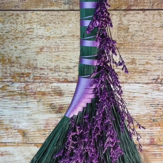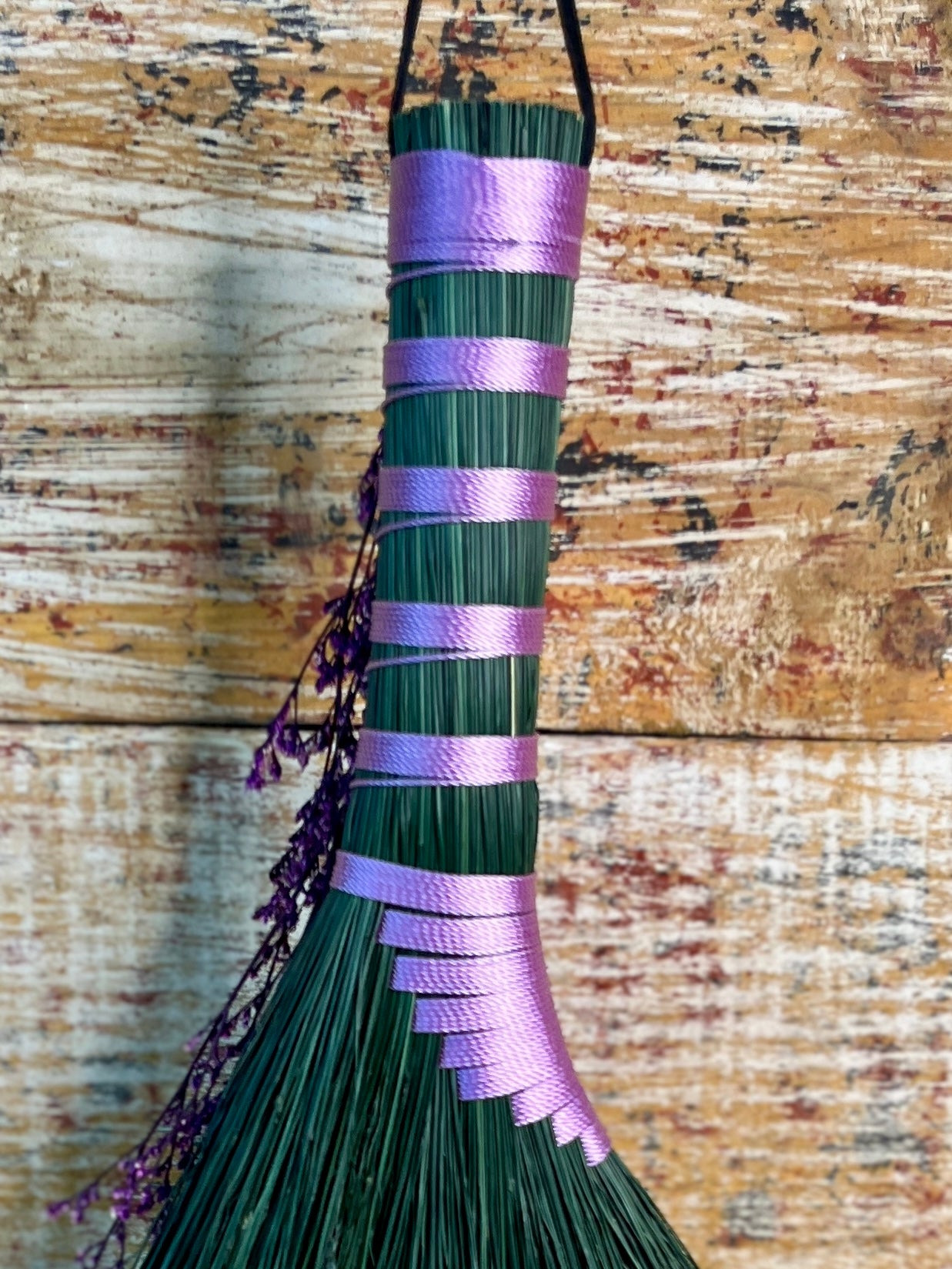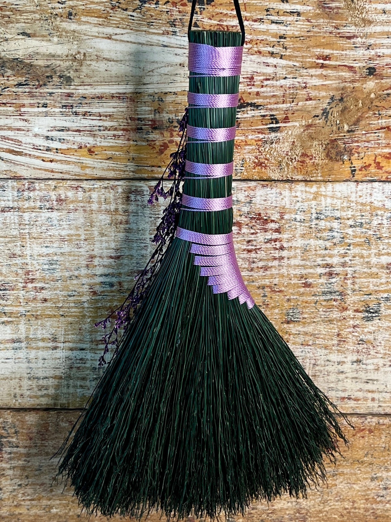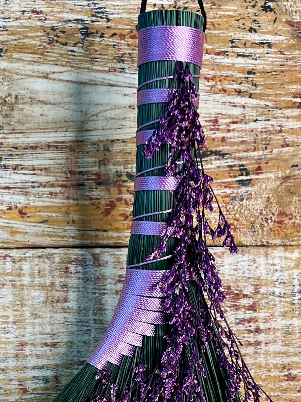 This handcrafted hawktail whisk is built with a sturdy central core and layered natural bristles fanned outward for a wide, balanced sweep. Created in the Forest Whisperer color combo, it blends deep green broomcorn with soft lavender thread, giving the piece a grounded, woodland mystique with a gentle pop of color.