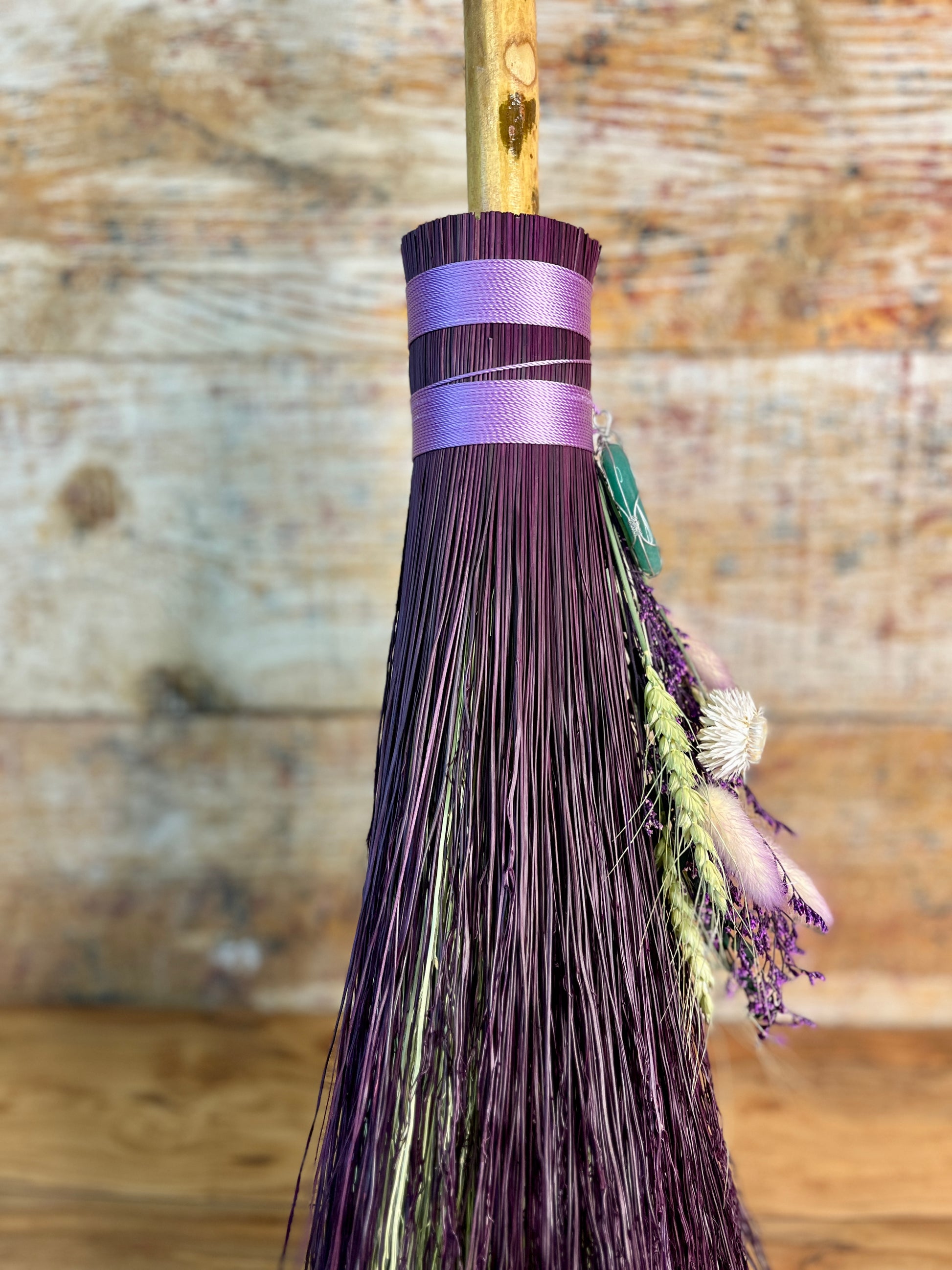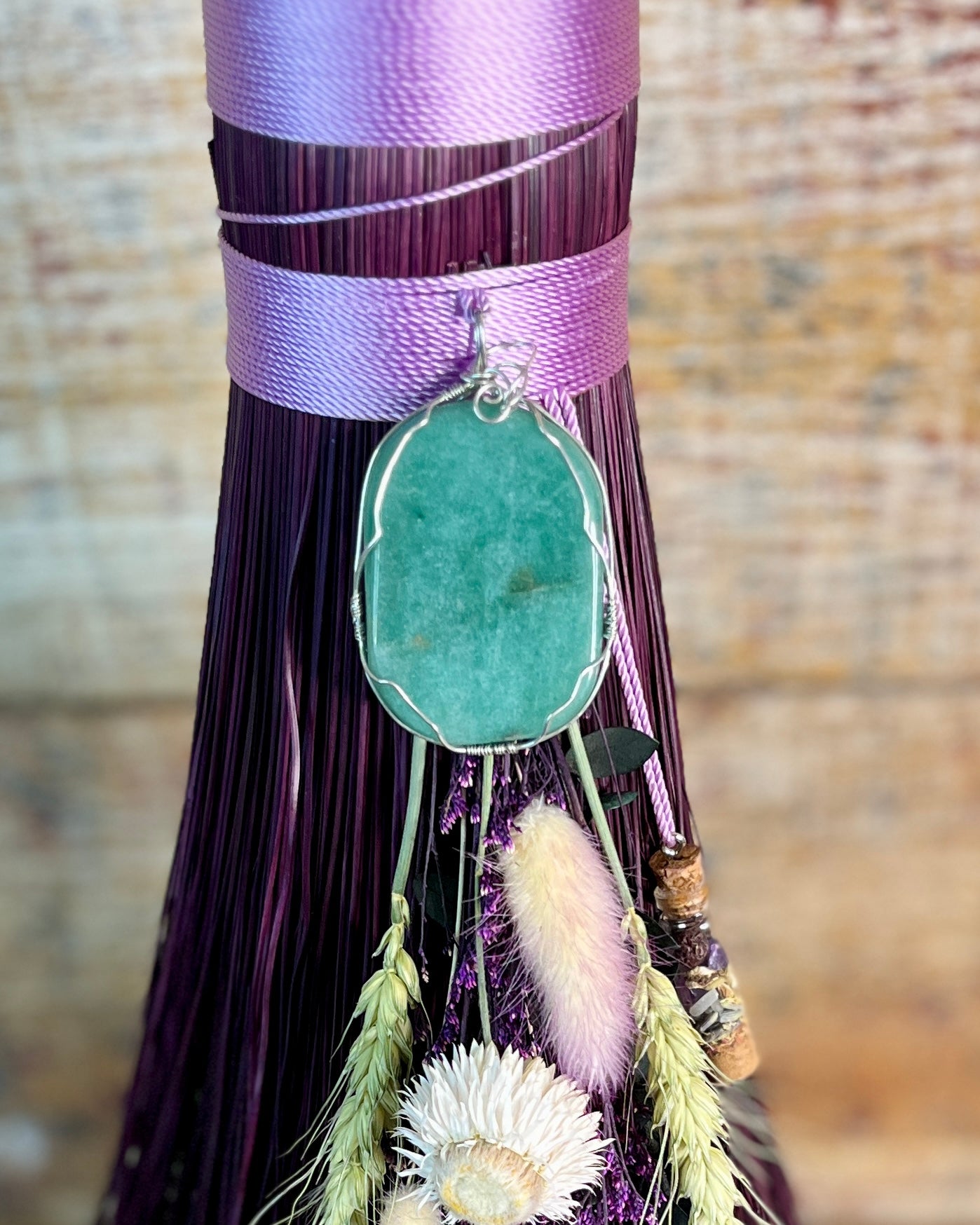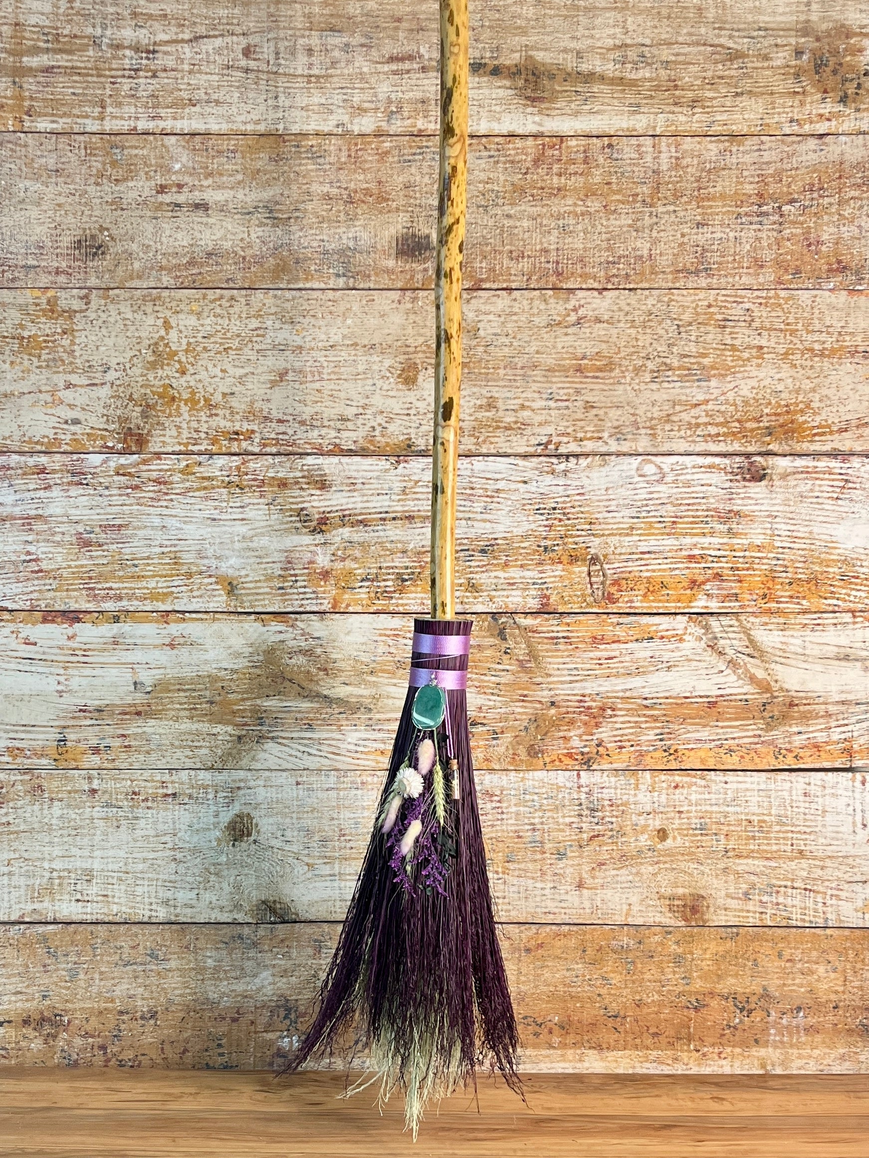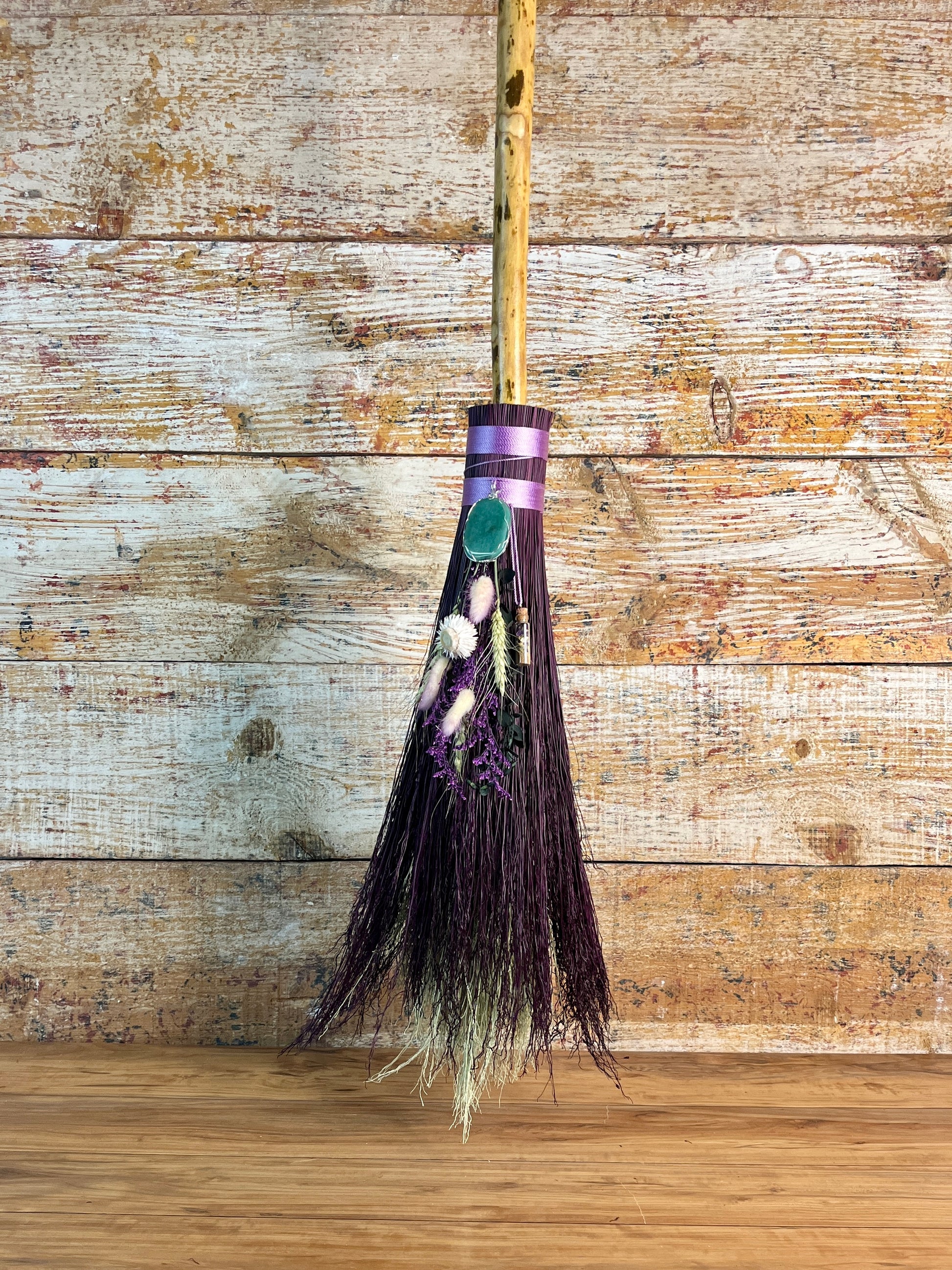 This handcrafted full-size besom stands at approximately 59 inches tall. Its natural bristles are dyed in shifting tones of plum, creating a soft, harmonizing palette that reflects both heart and crown energy. The neck is wrapped in lavender thread and adorned with a green aventurine pendant, chosen for its nurturing, heart-centered resonance. A dried botanical bouquet in purple, cream, and soft green tones cascades from the neck, adding quiet movement and gentle balance. The handle is carved from Sweetgum wood, carrying adaptable, grounding energy and a naturally expressive, lightly speckled appearance. A glass vial hangs at the neck, filled with herbs, spices, and crystal chips selected for renewal, emotional harmony, heart protection, and soft abundance.