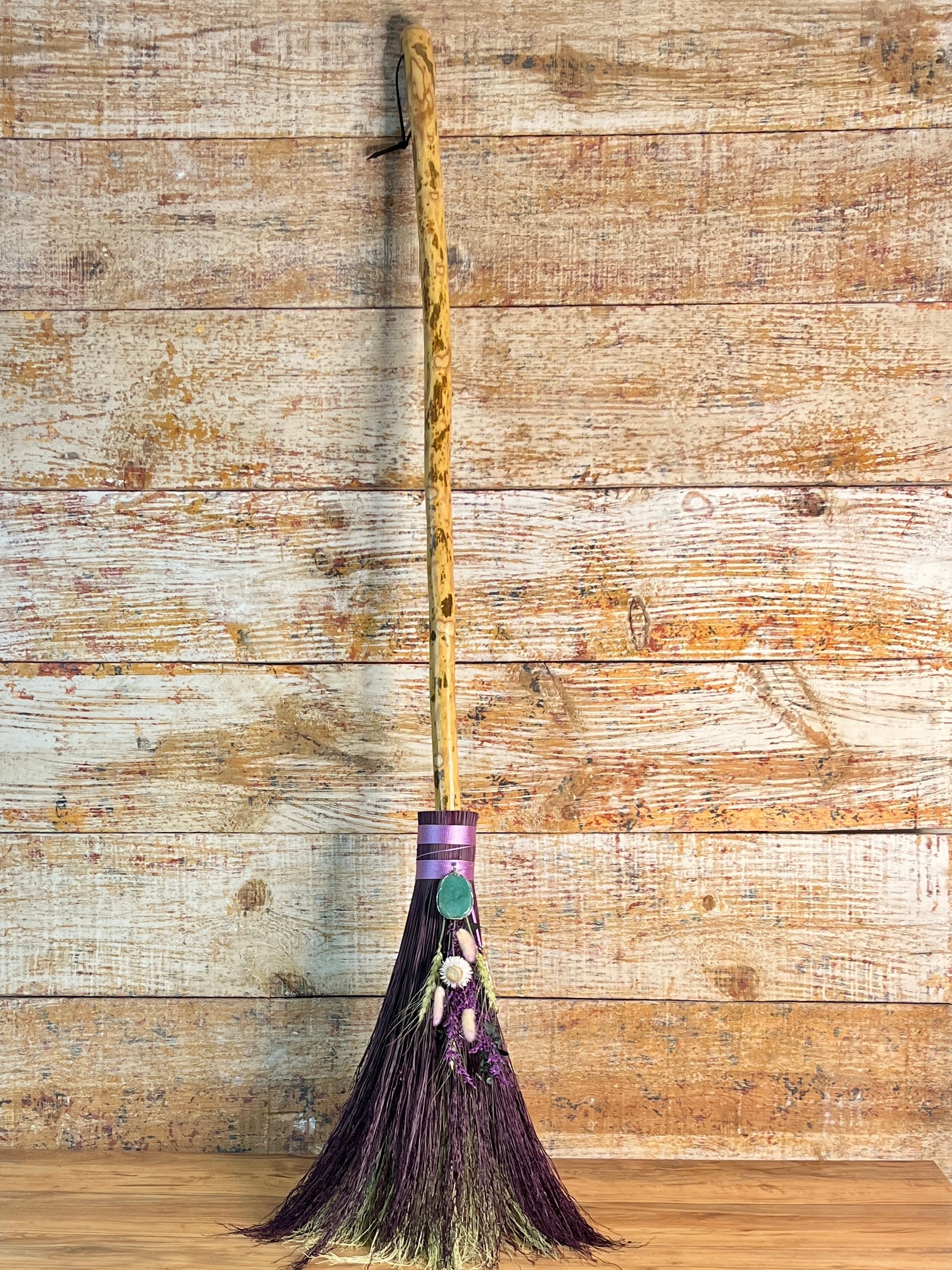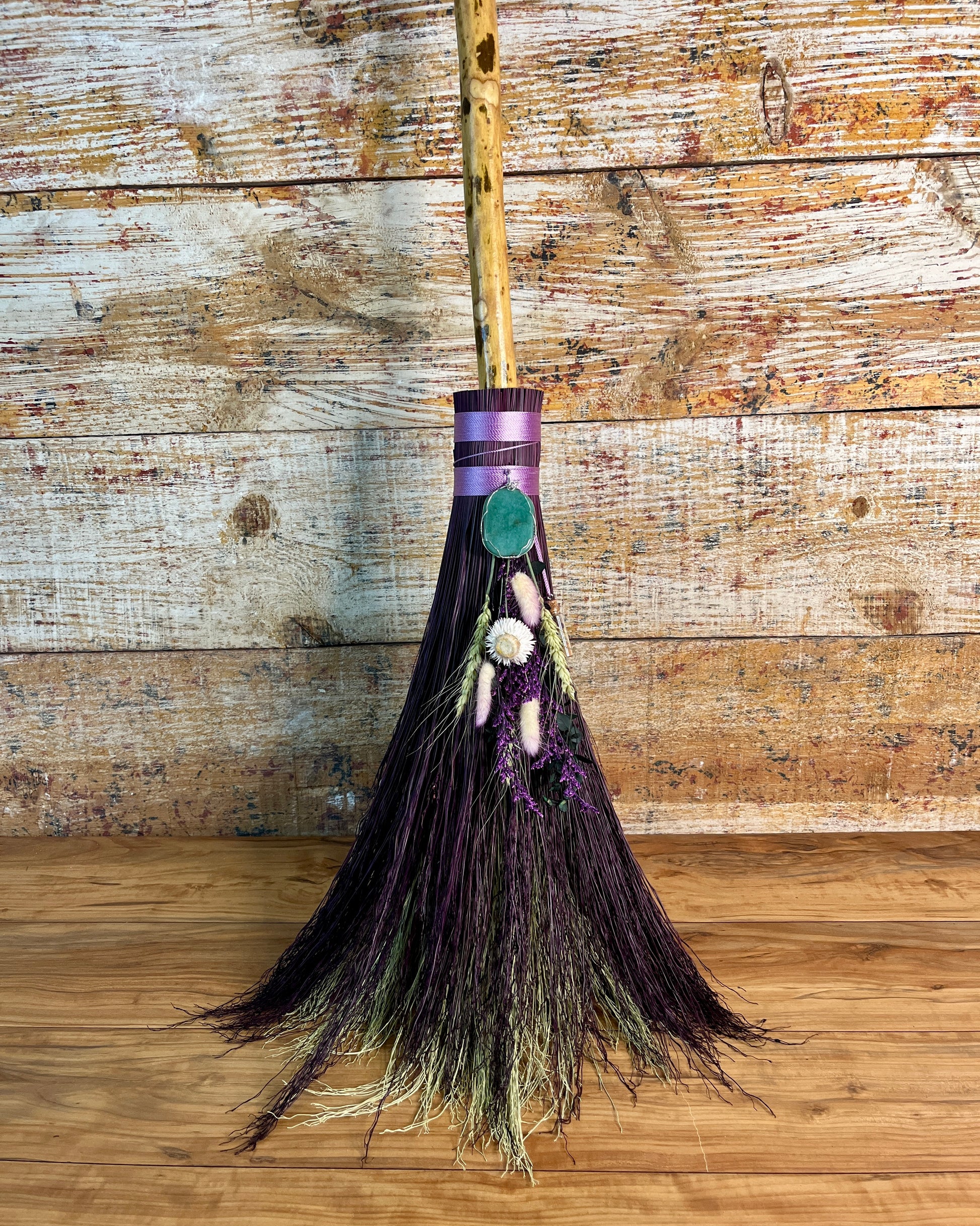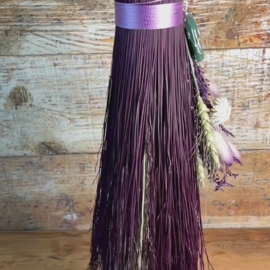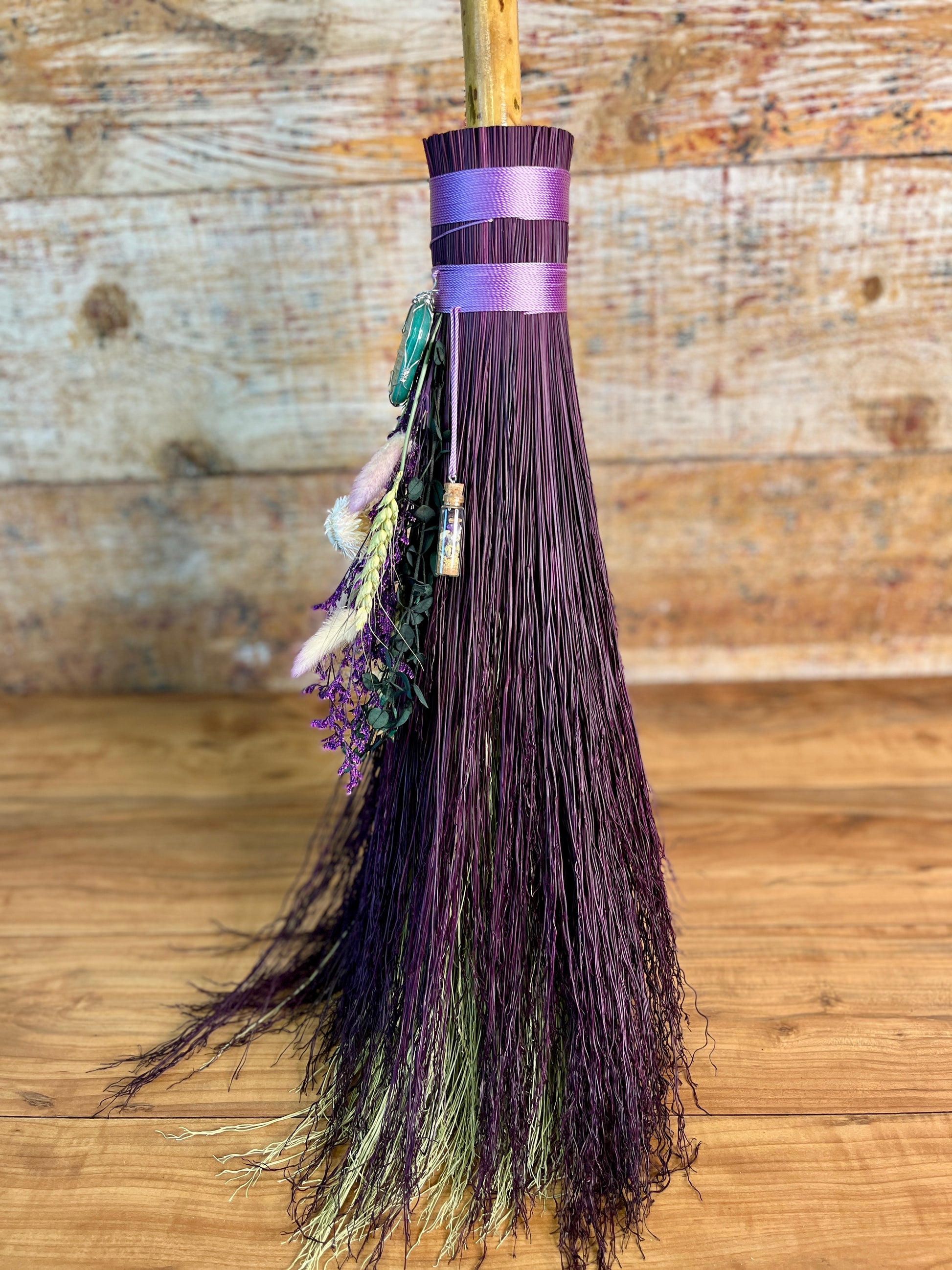 This handcrafted full-size besom stands at approximately 59 inches tall. Its natural bristles are dyed in shifting tones of plum, creating a soft, harmonizing palette that reflects both heart and crown energy. The neck is wrapped in lavender thread and adorned with a green aventurine pendant, chosen for its nurturing, heart-centered resonance. A dried botanical bouquet in purple, cream, and soft green tones cascades from the neck, adding quiet movement and gentle balance. The handle is carved from Sweetgum wood, carrying adaptable, grounding energy and a naturally expressive, lightly speckled appearance. A glass vial hangs at the neck, filled with herbs, spices, and crystal chips selected for renewal, emotional harmony, heart protection, and soft abundance.