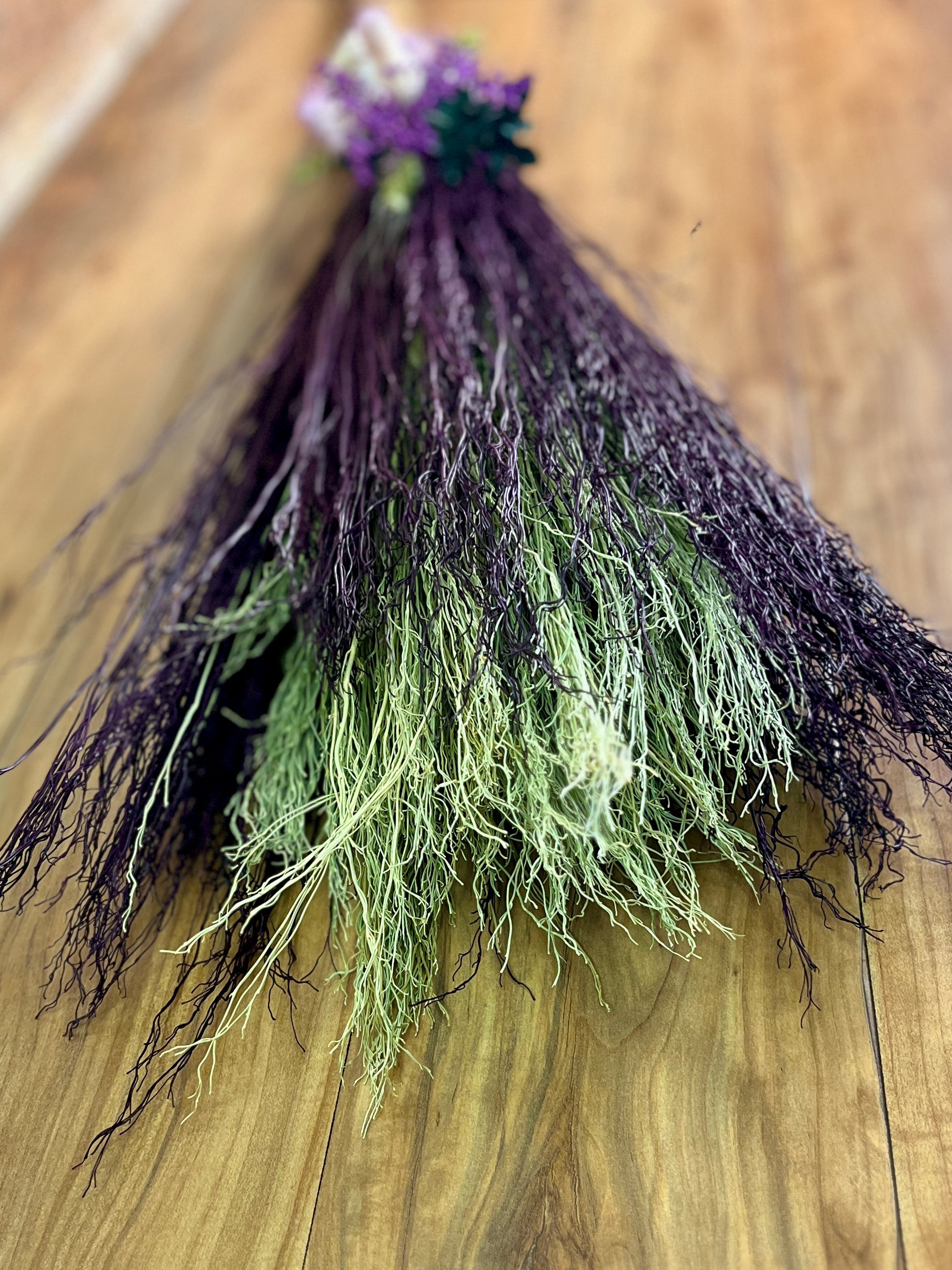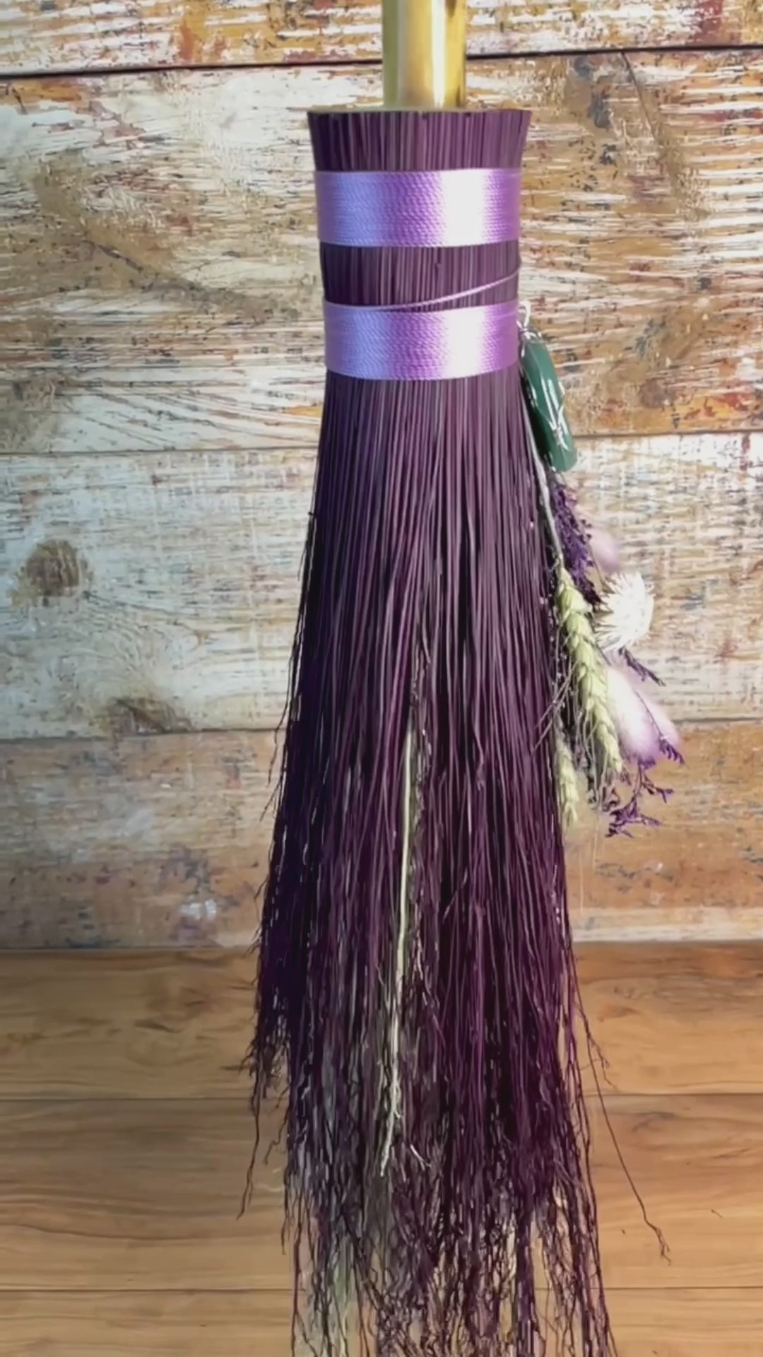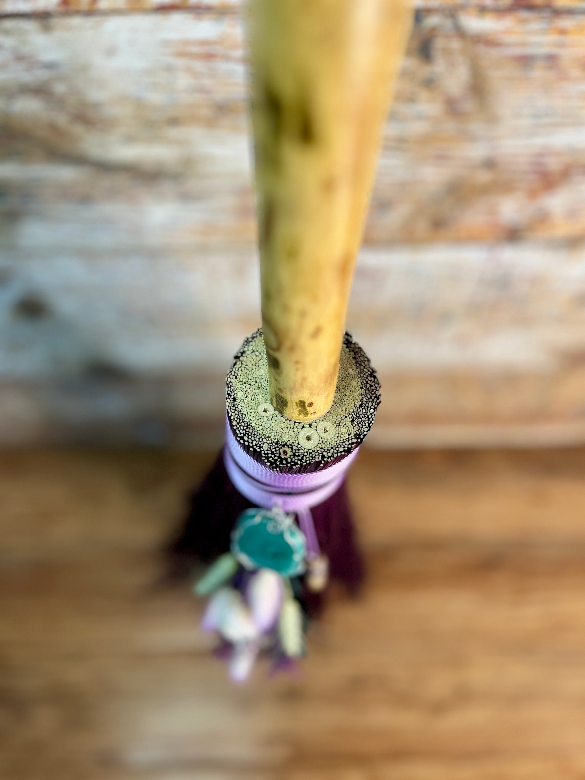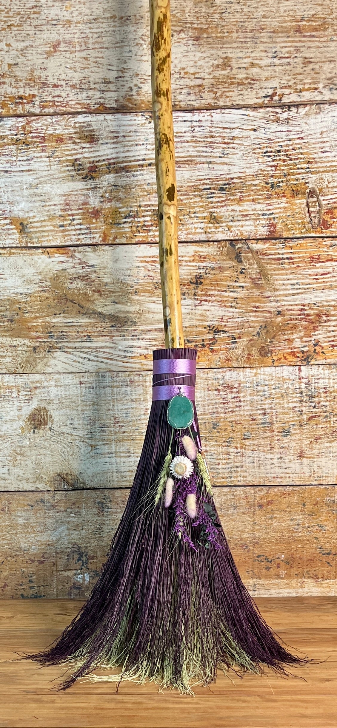 This handcrafted full-size besom stands at approximately 59 inches tall. Its natural bristles are dyed in shifting tones of plum, creating a soft, harmonizing palette that reflects both heart and crown energy. The neck is wrapped in lavender thread and adorned with a green aventurine pendant, chosen for its nurturing, heart-centered resonance. A dried botanical bouquet in purple, cream, and soft green tones cascades from the neck, adding quiet movement and gentle balance. The handle is carved from Sweetgum wood, carrying adaptable, grounding energy and a naturally expressive, lightly speckled appearance. A glass vial hangs at the neck, filled with herbs, spices, and crystal chips selected for renewal, emotional harmony, heart protection, and soft abundance.