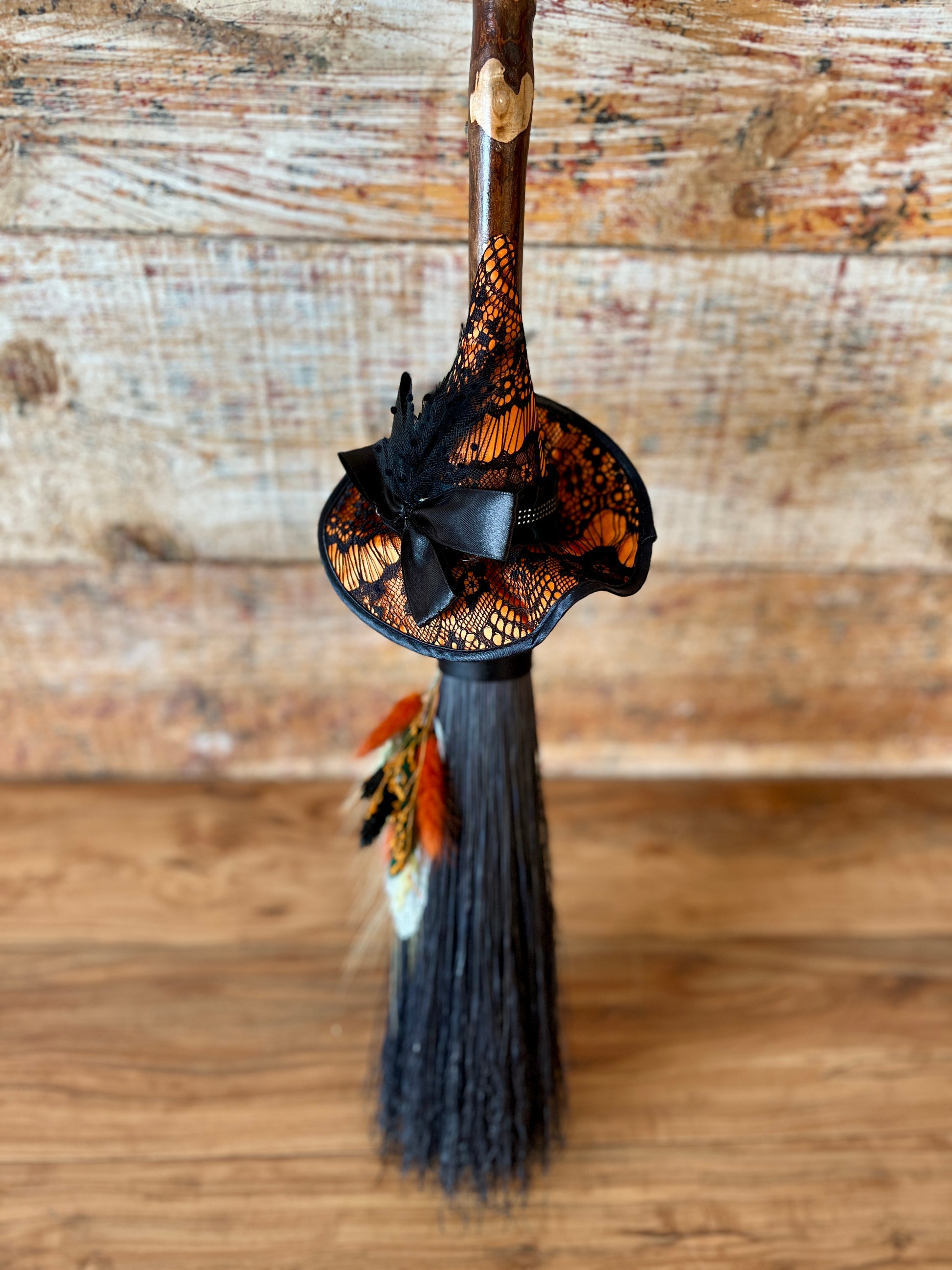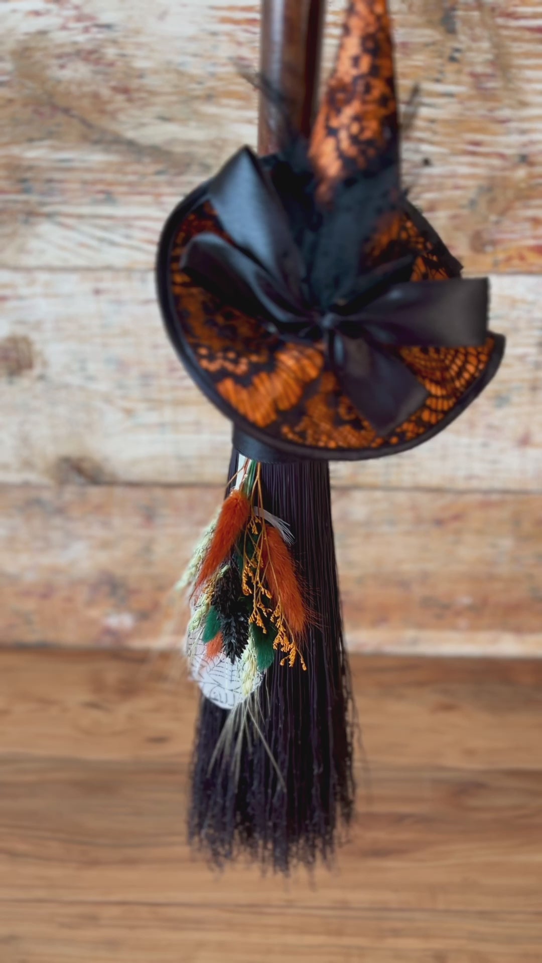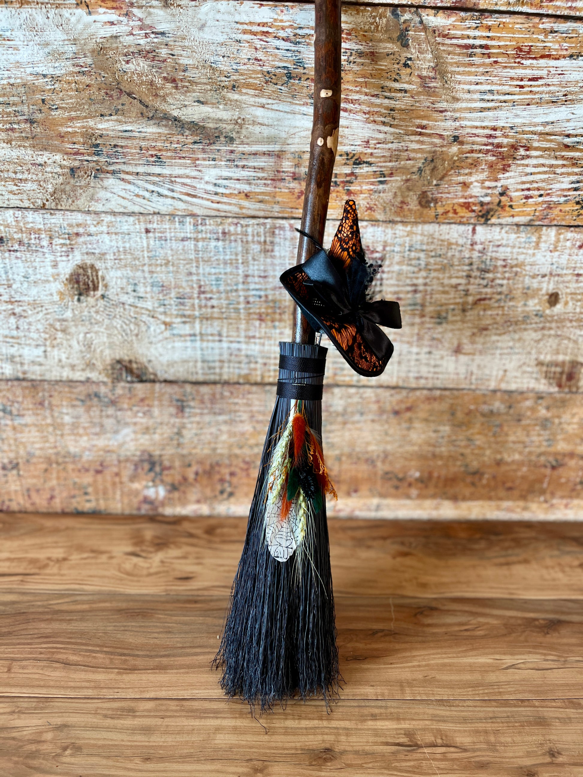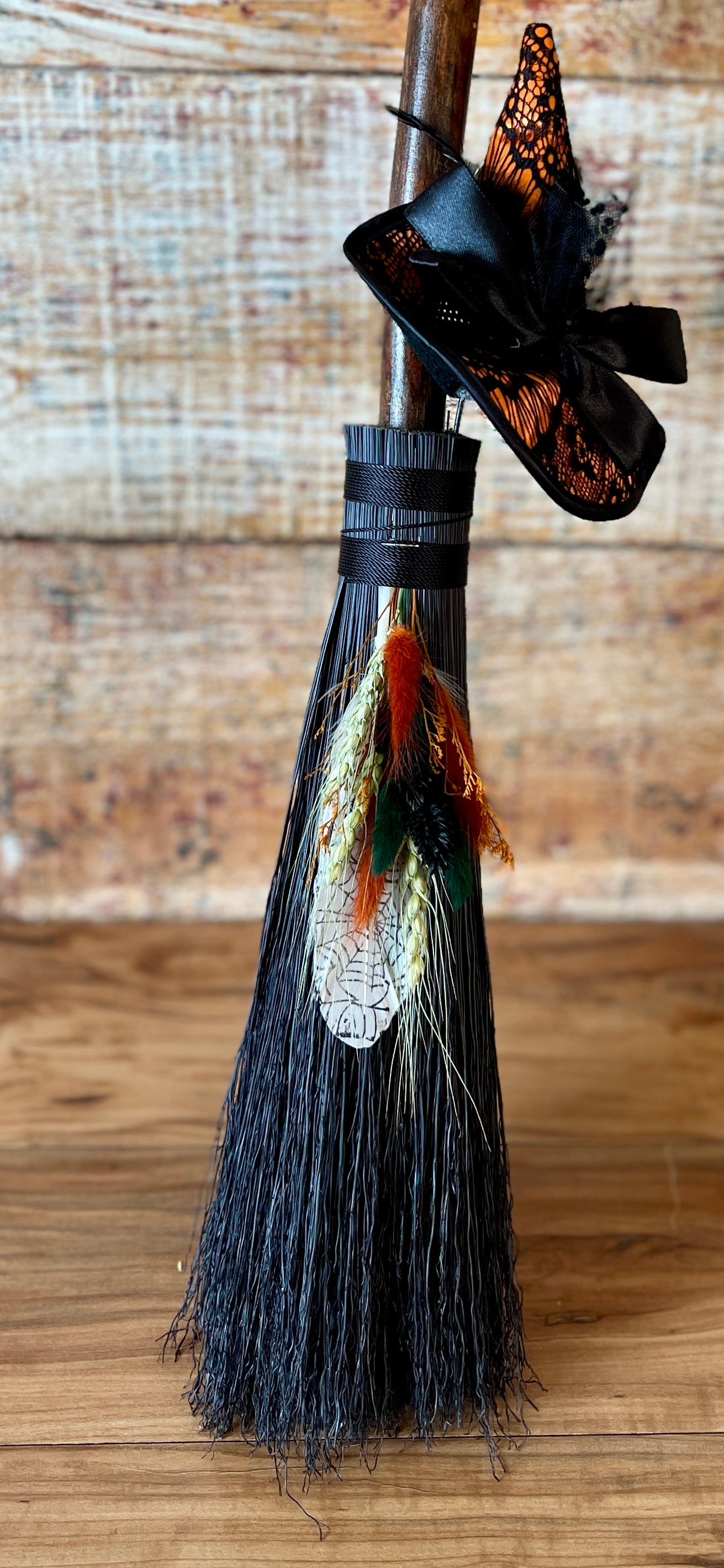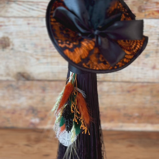 This handcrafted mini besom stands at approximately 28 inches tall. The bristles are a deep, midnight black, creating a dramatic backdrop for the vivid autumnal accents woven through the botanical bundle. Wrapped in black thread, the neck is adorned with a whimsical witch’s hat in warm orange and lace-patterned black, giving the piece a playful, seasonal enchantment. A stamped feather featuring an intricate spider web design adds a touch of mystery, perfectly capturing the energy of the thinning veil and the magic of this time between worlds.