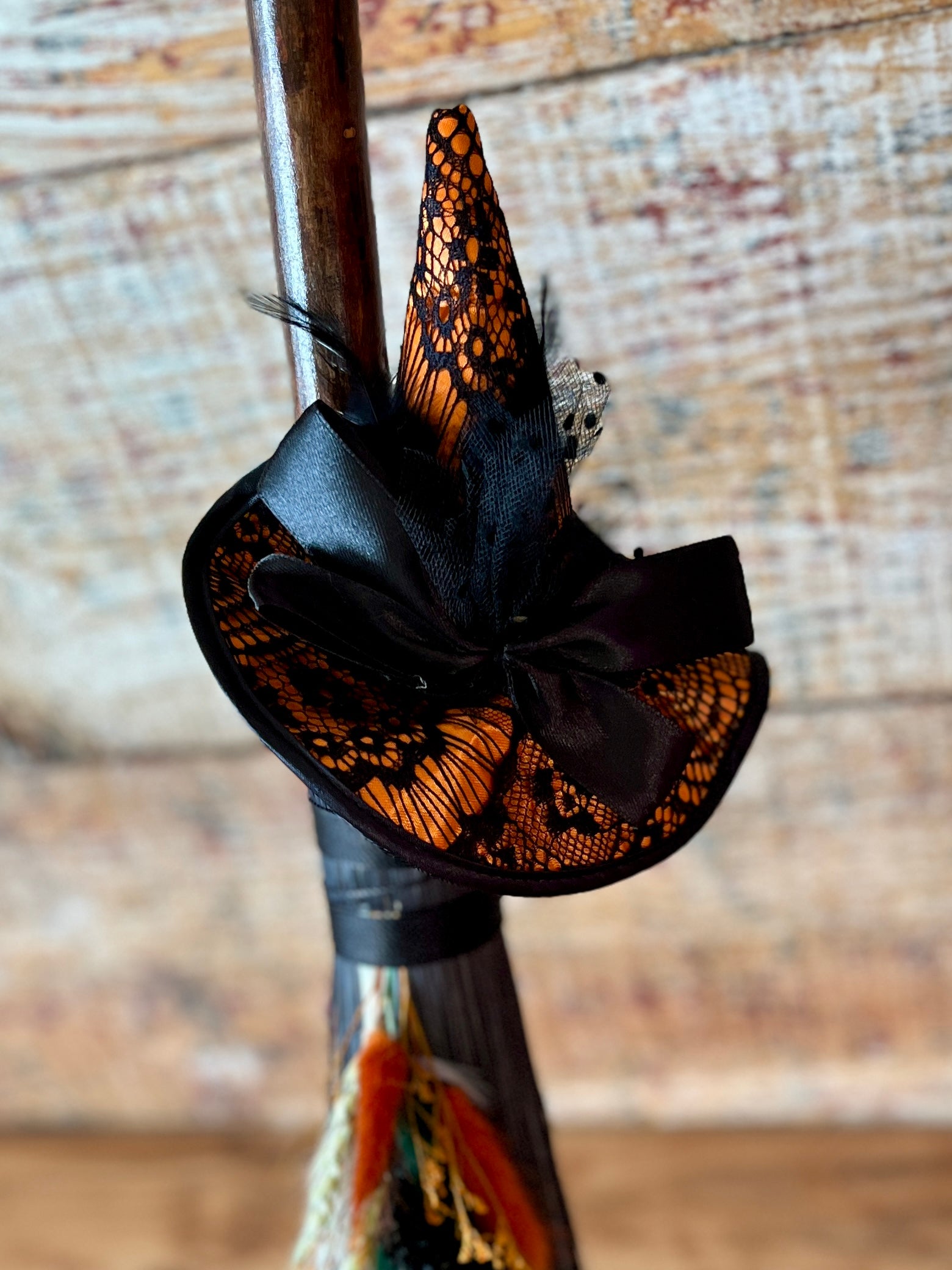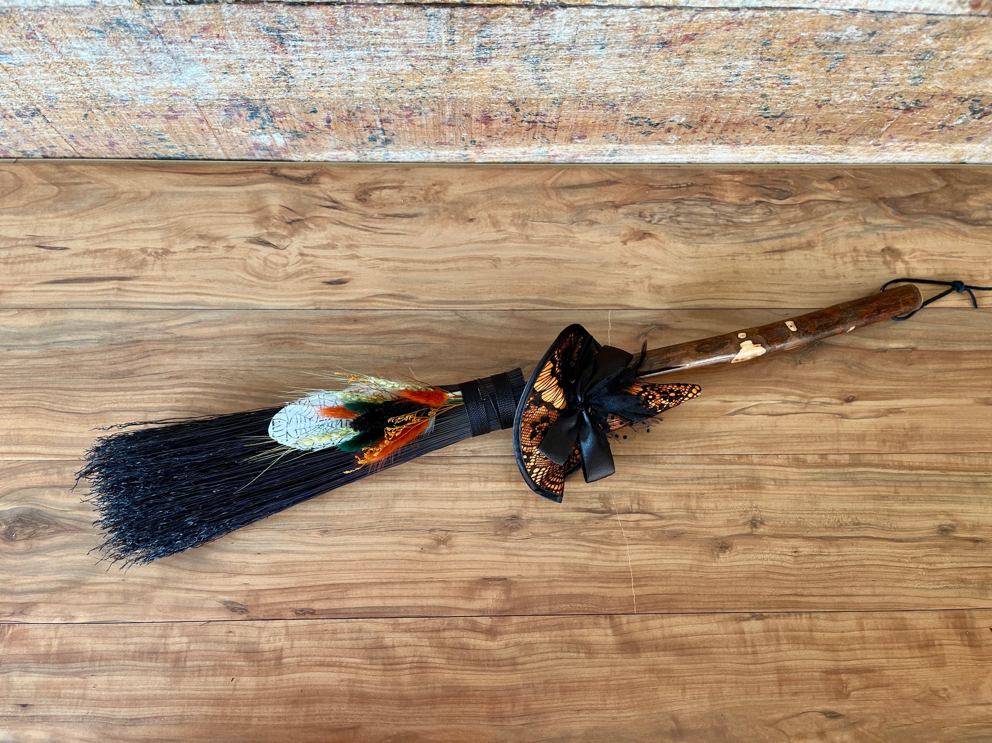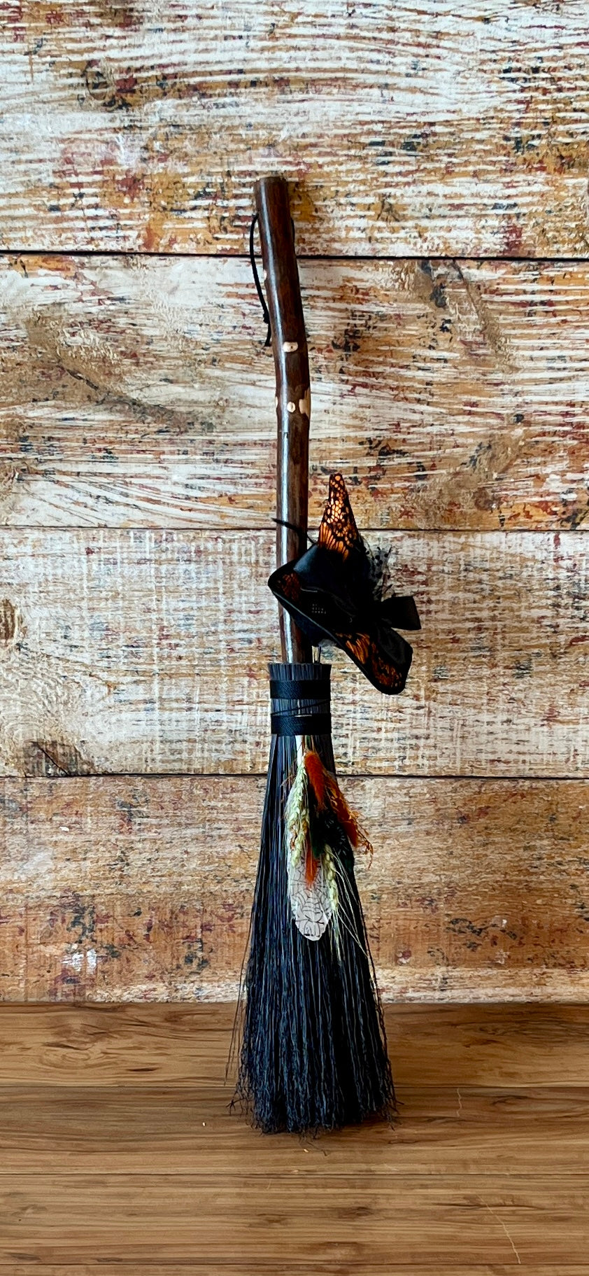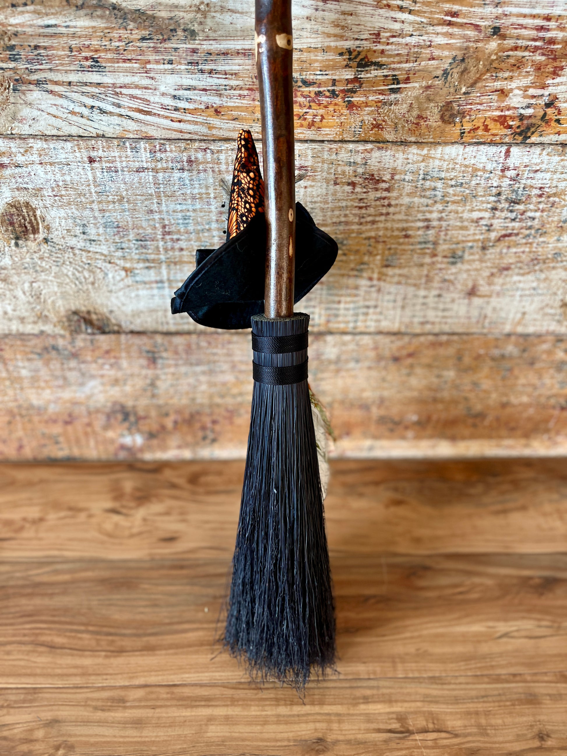 This handcrafted mini besom stands at approximately 28 inches tall. The bristles are a deep, midnight black, creating a dramatic backdrop for the vivid autumnal accents woven through the botanical bundle. Wrapped in black thread, the neck is adorned with a whimsical witch’s hat in warm orange and lace-patterned black, giving the piece a playful, seasonal enchantment. A stamped feather featuring an intricate spider web design adds a touch of mystery, perfectly capturing the energy of the thinning veil and the magic of this time between worlds.