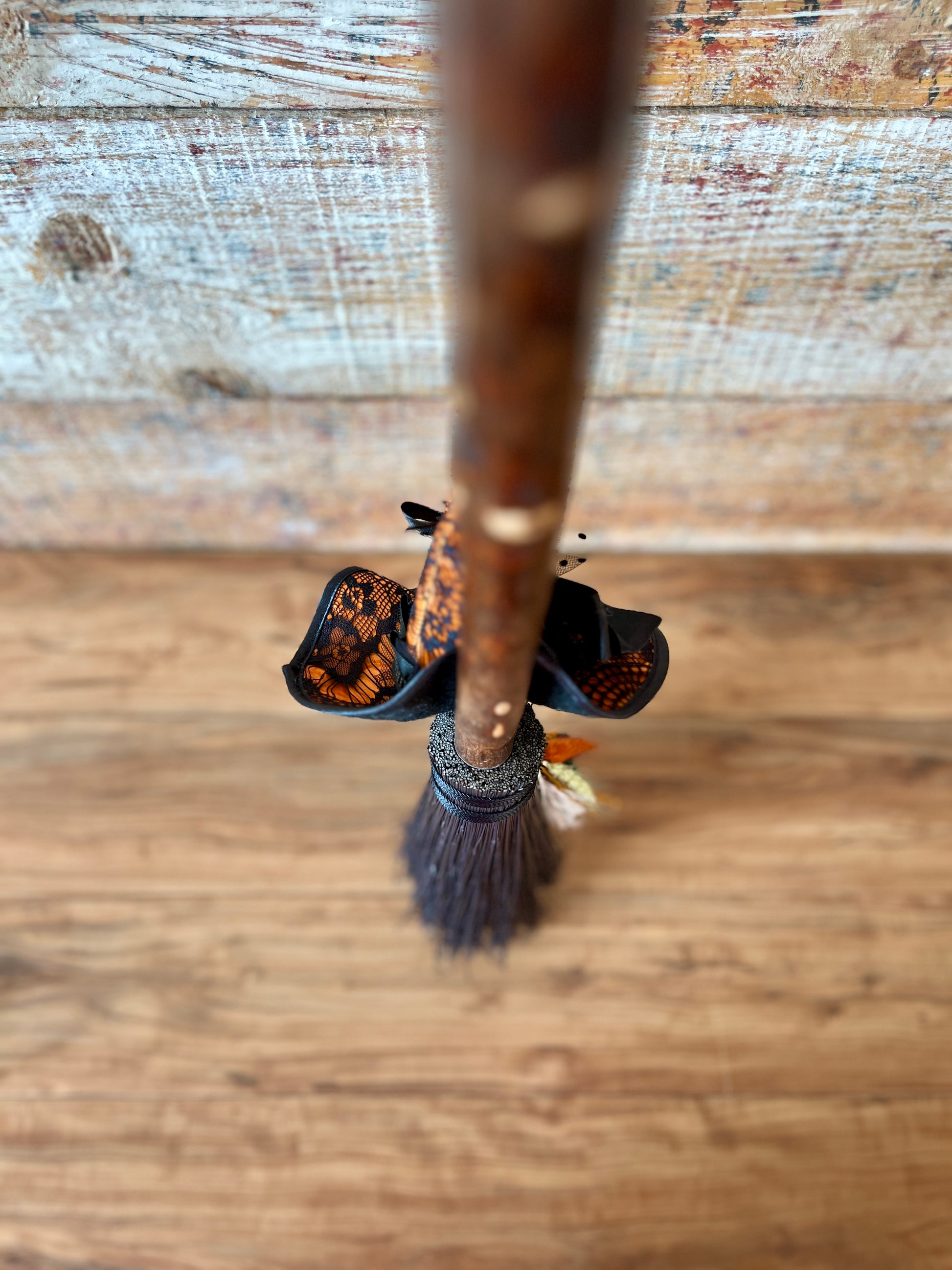 Hallowed Veil carries the energy of thresholds, mystery, and the quiet magic found when the worlds feel closest. The black bristles ground and protect, the orange hat adds warmth and spark, and the stamped feather brings an element of symbolic ritual. This besom is perfect for honoring seasonal transitions, celebrating the thinning veil, or adding a touch of enchanted autumn to your sacred space.
