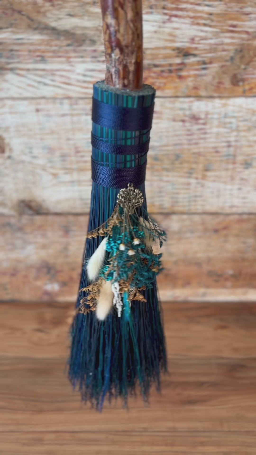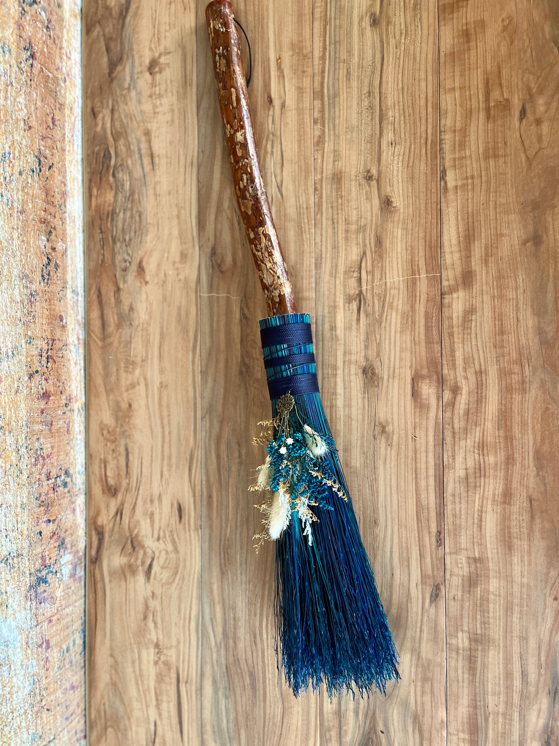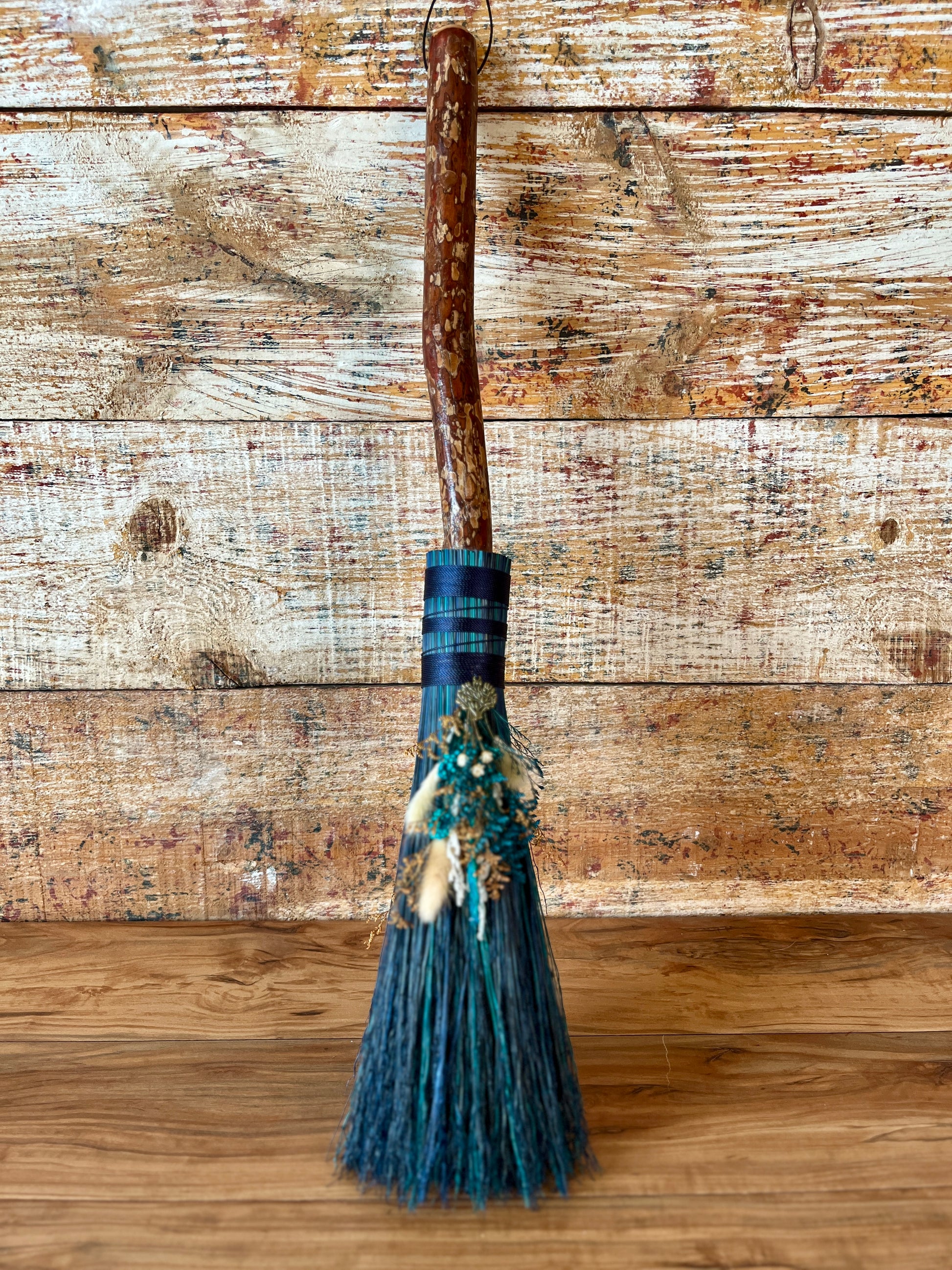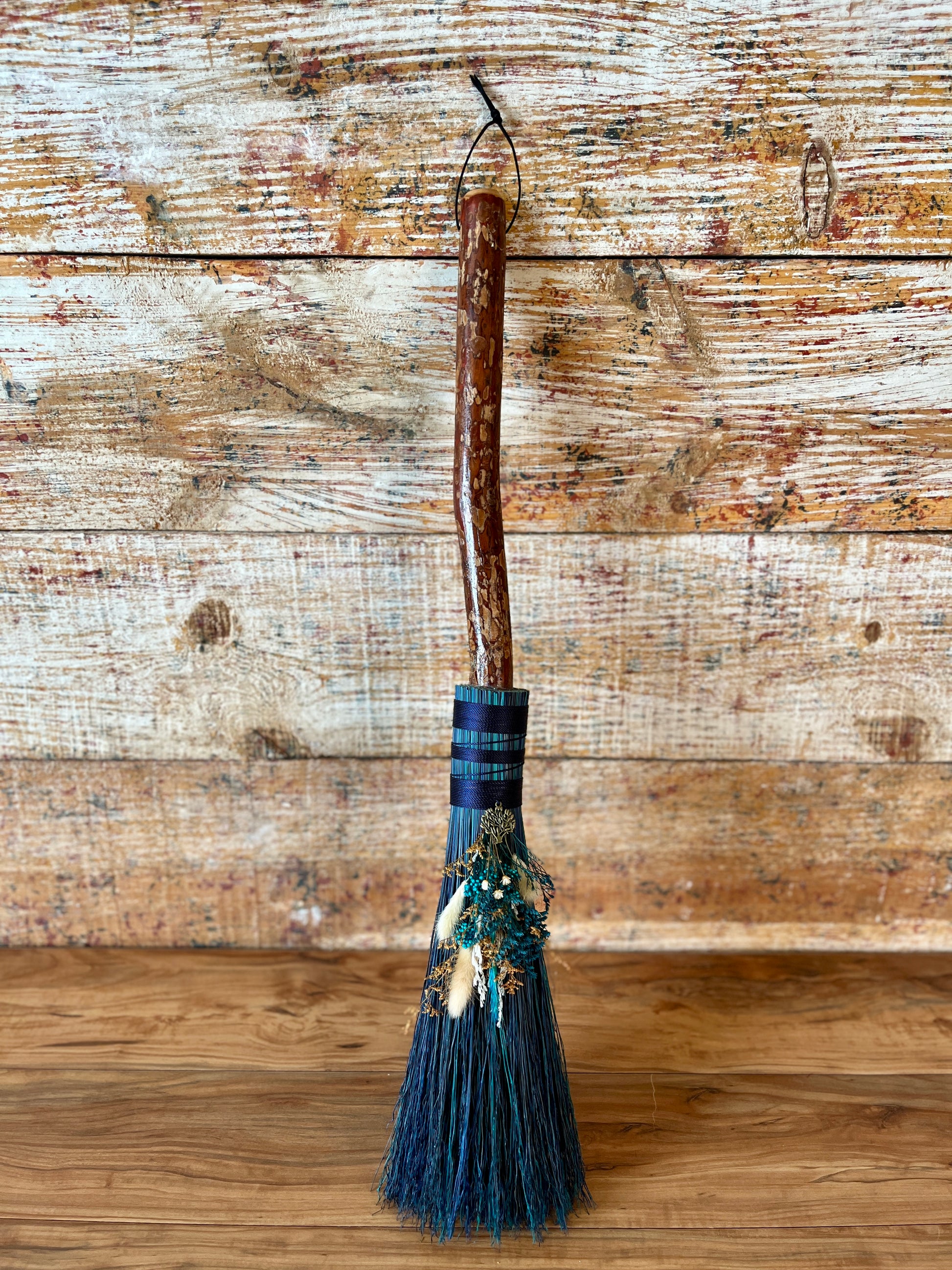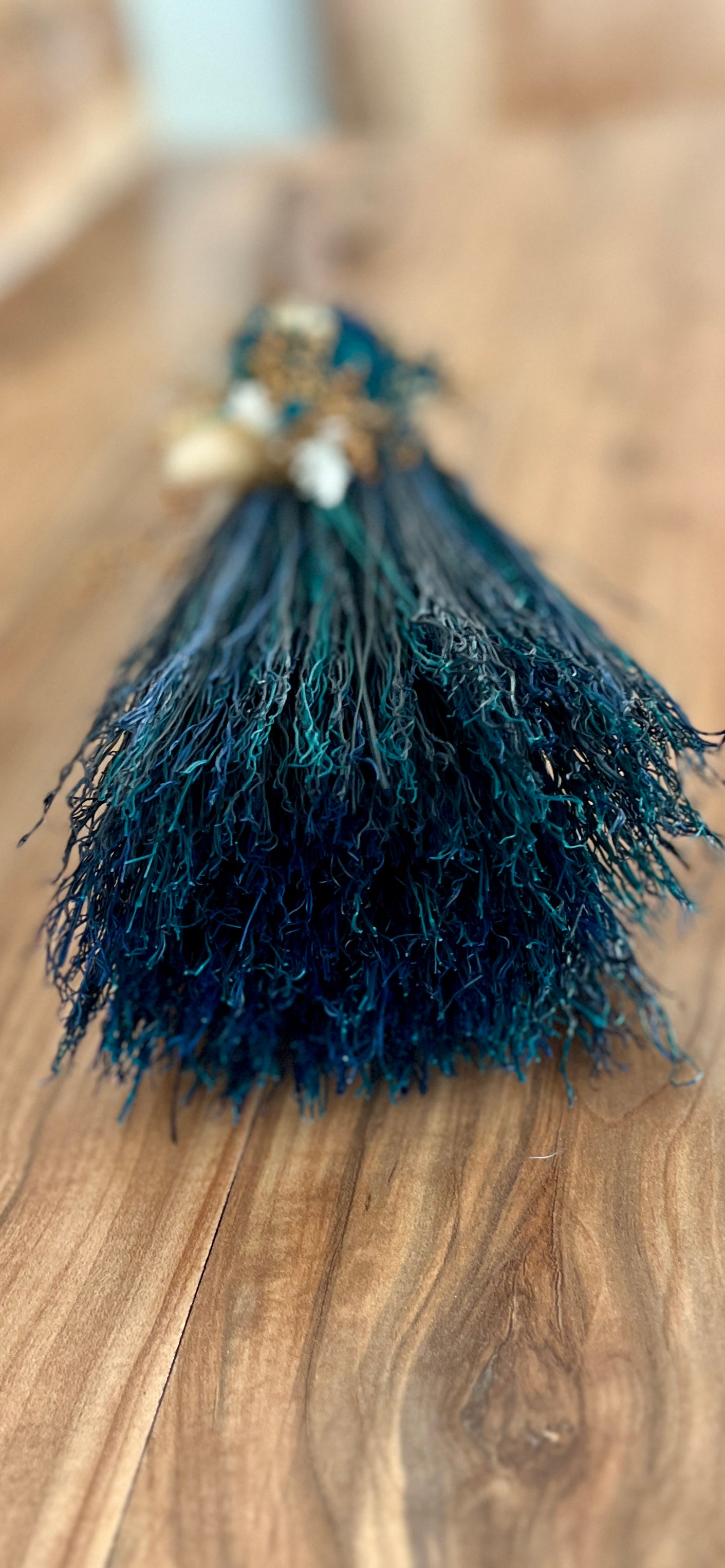 This handcrafted mini besom stands at approximately 29 inches tall. Its bristles are dyed in layered shades of blue, moving from deep navy into brighter tide-like tones that feel both calming and alive. Wrapped in navy thread with subtle teal accents, the neck is adorned with an antique gold Tree of Life medallion that adds a touch of rooted, organic elegance. The bouquet of dried botanicals in soft creams, golds, and ocean blues adds texture and movement, echoing the feeling of waves meeting the shore. This piece carries a gentle, sea-kissed presence that suits both everyday spaces and more intentional altars.