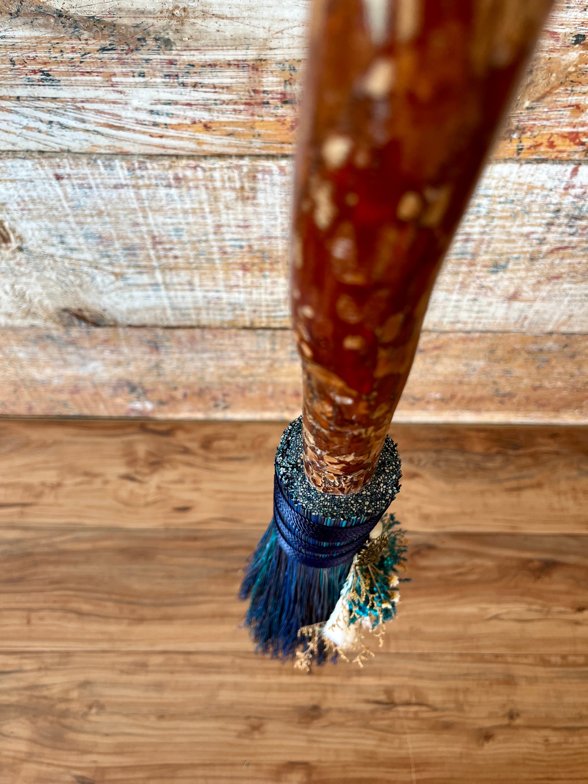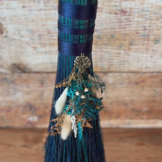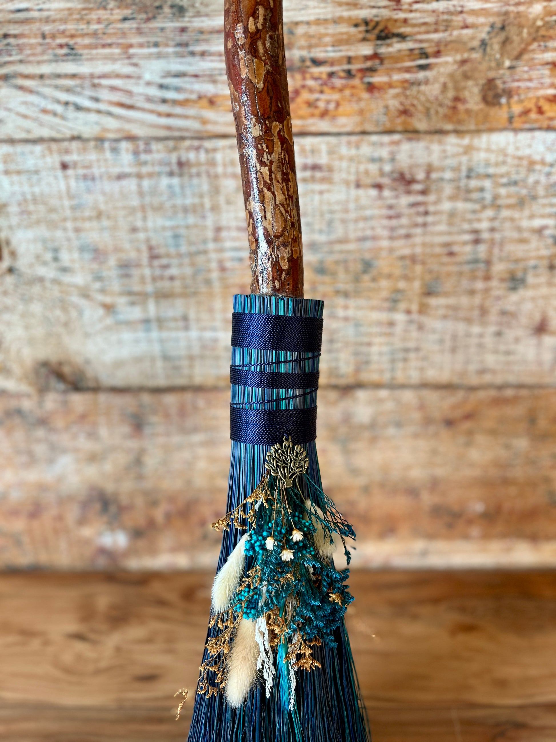 Midnight Tide holds the energy of deep water calm and intuitive flow. The blue tones encourage emotional balance and clear communication, while the darker shades offer a sense of protection and depth. The Tree of Life motif invites grounded growth and connection, reminding the holder of roots, branches, and the cycles of renewal. This mini besom is a beautiful companion for spaces where you want to welcome peace, reflection, and gentle, wave-like movement through your day.