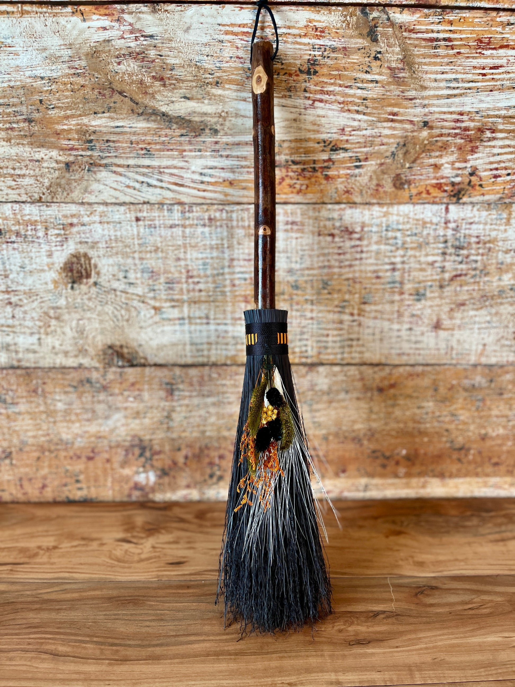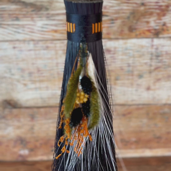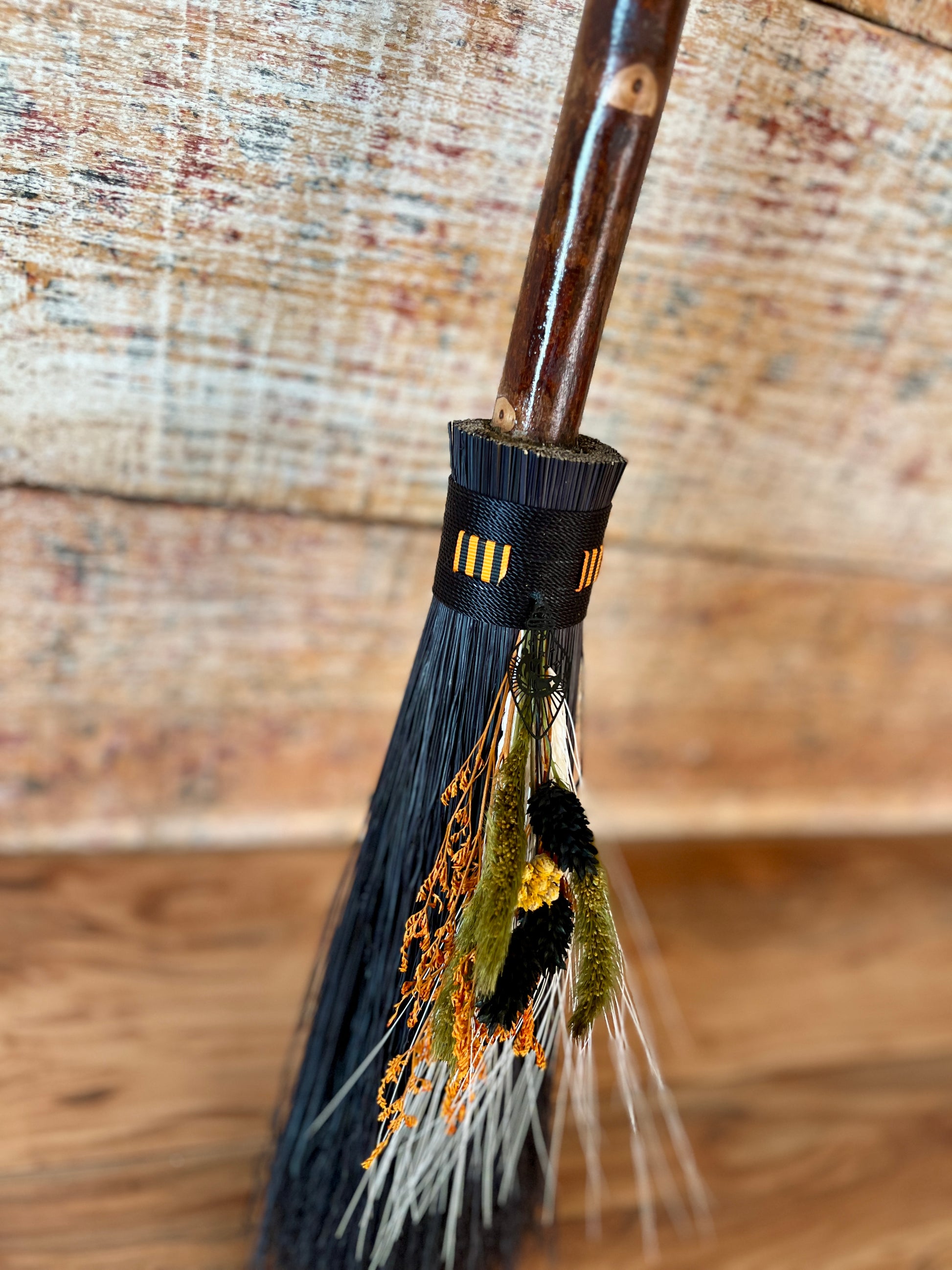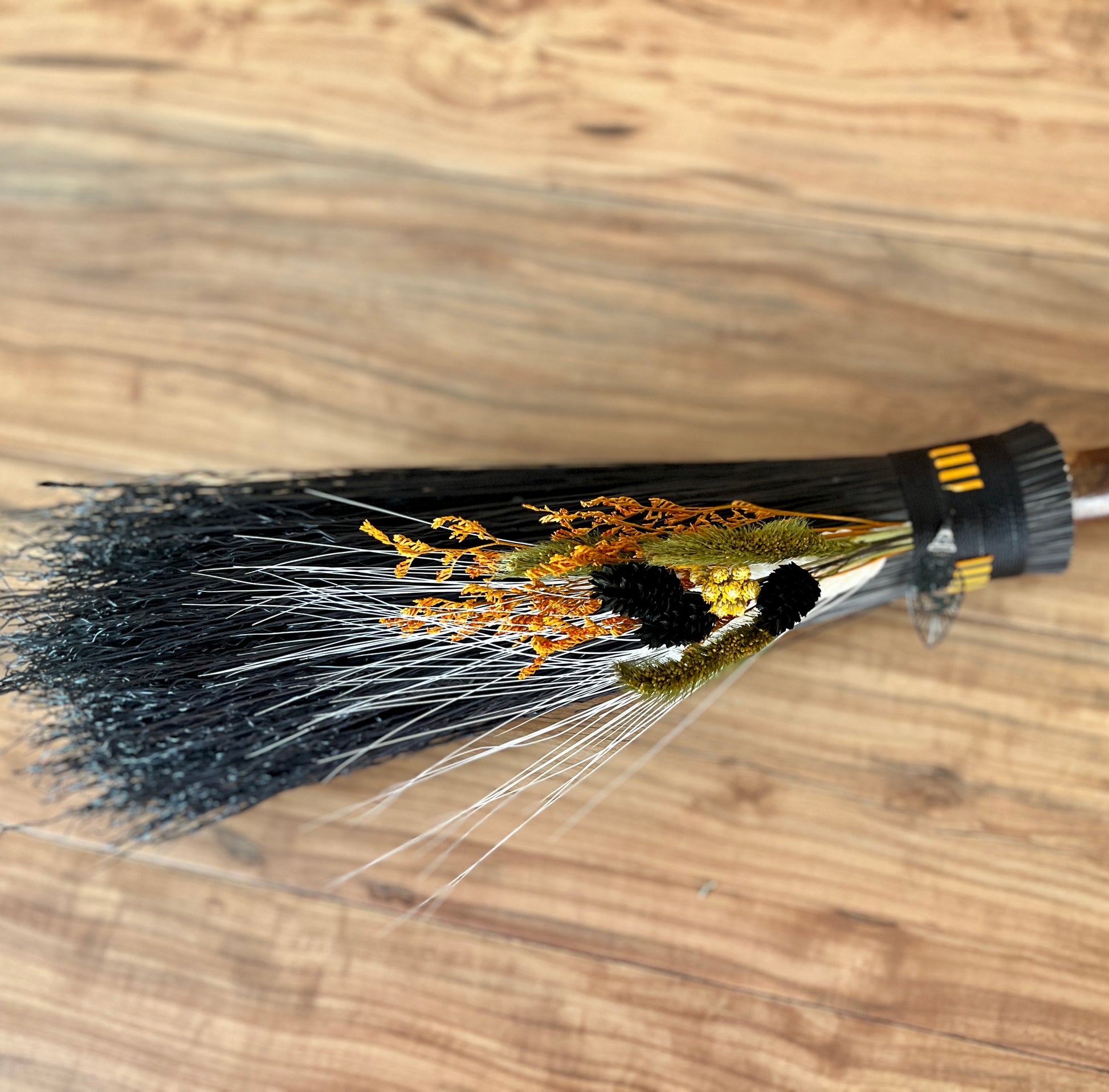 This handcrafted mini besom stands at approximately 25 inches tall. Its deep black bristles are accented with subtle white and orange strands, creating a striking movement of light and shadow. Wrapped in black thread with warm orange detailing, the neck features a delicate, black charm shaped like a tiny potion bottle, a whimsical, mystical touch that feels straight out of an enchanted apothecary. The bouquet of dried botanicals in greens, golds, and soft neutrals adds texture and tone, enhancing the nighttime energy of the piece.