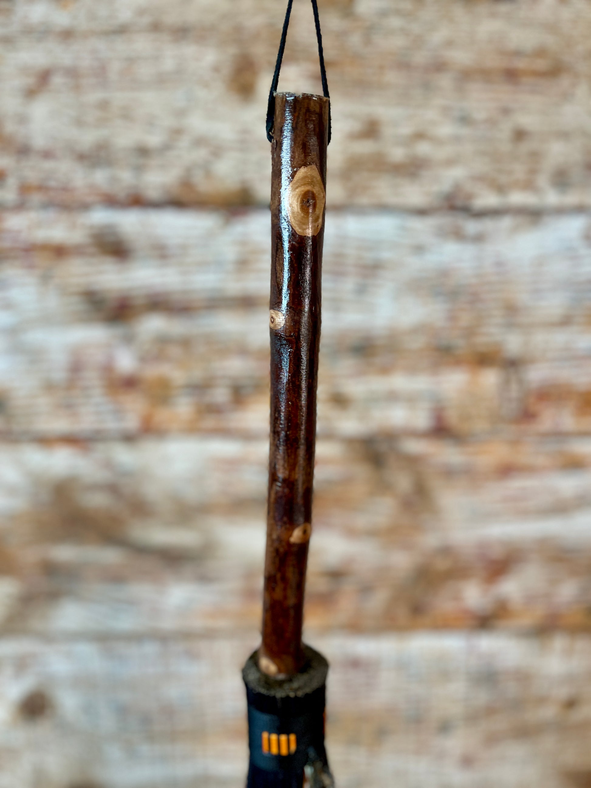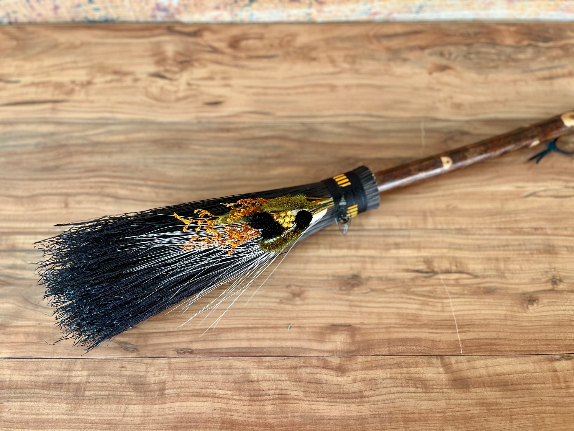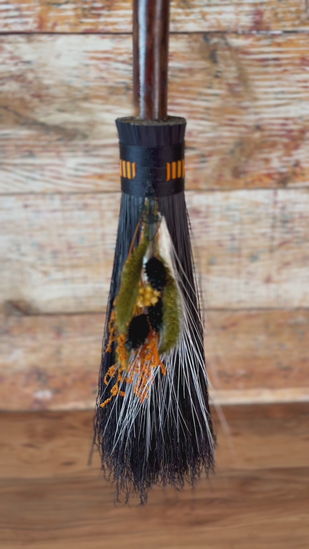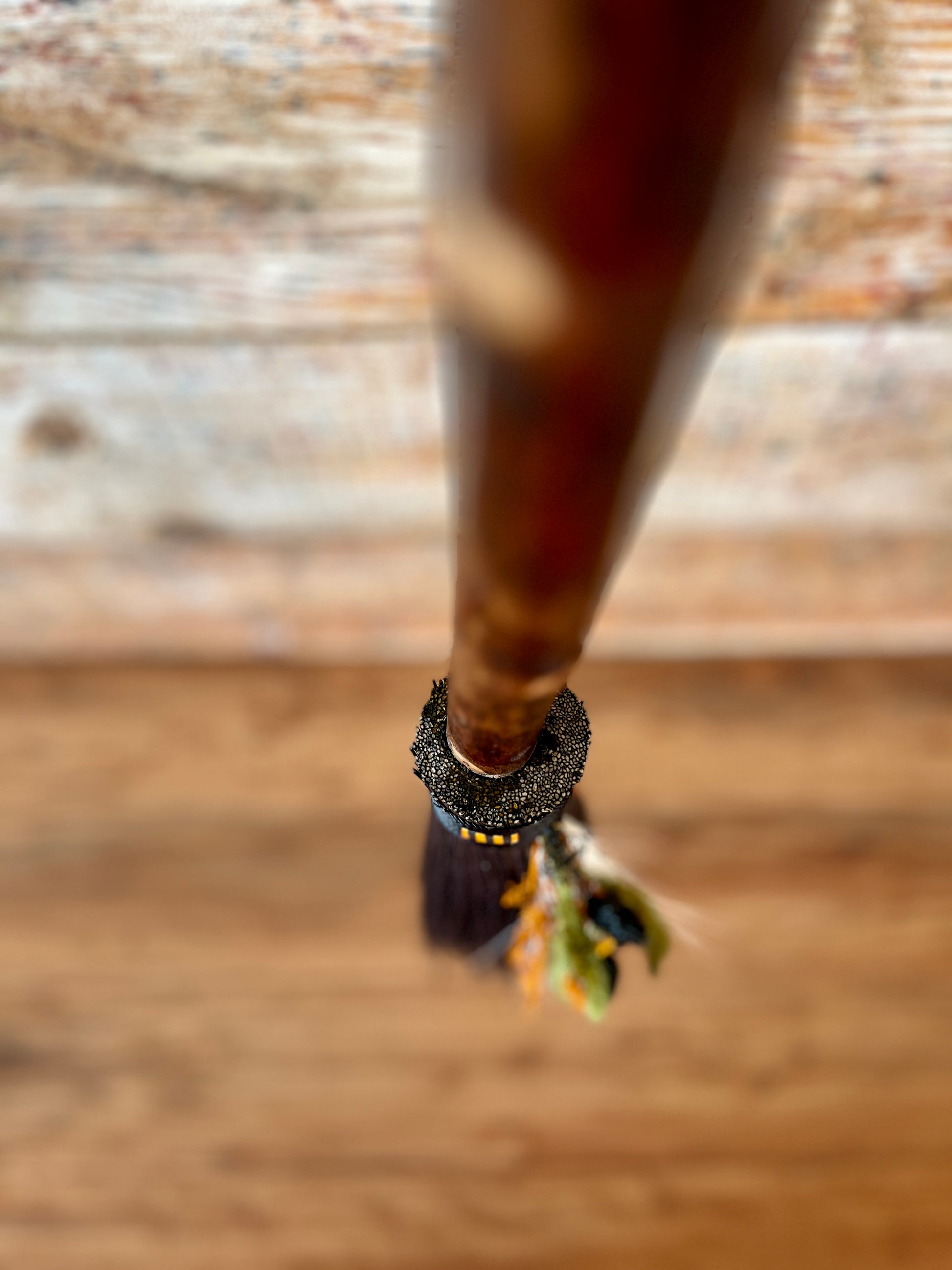 This handcrafted mini besom stands at approximately 25 inches tall. Its deep black bristles are accented with subtle white and orange strands, creating a striking movement of light and shadow. Wrapped in black thread with warm orange detailing, the neck features a delicate, black charm shaped like a tiny potion bottle, a whimsical, mystical touch that feels straight out of an enchanted apothecary. The bouquet of dried botanicals in greens, golds, and soft neutrals adds texture and tone, enhancing the nighttime energy of the piece.