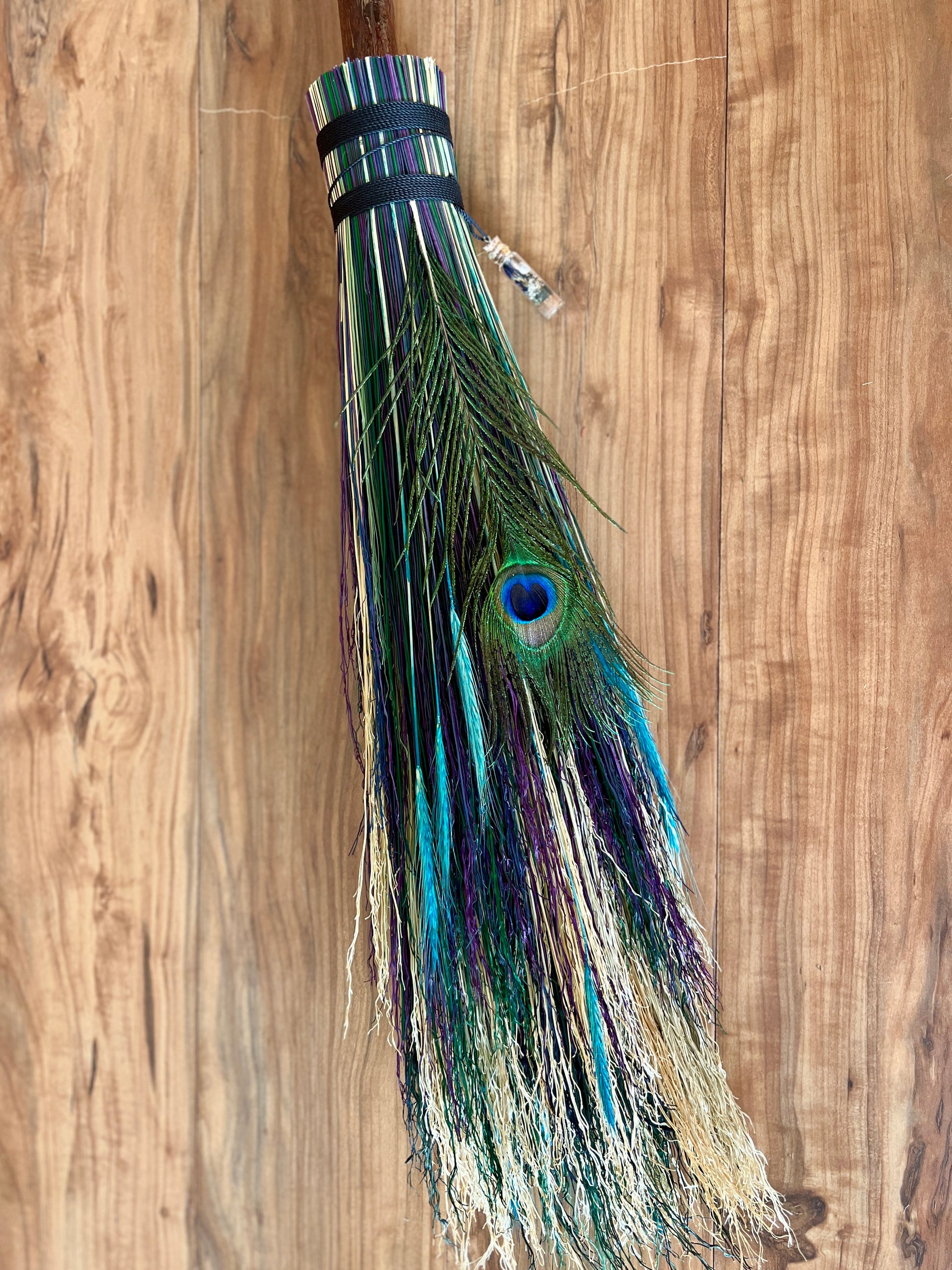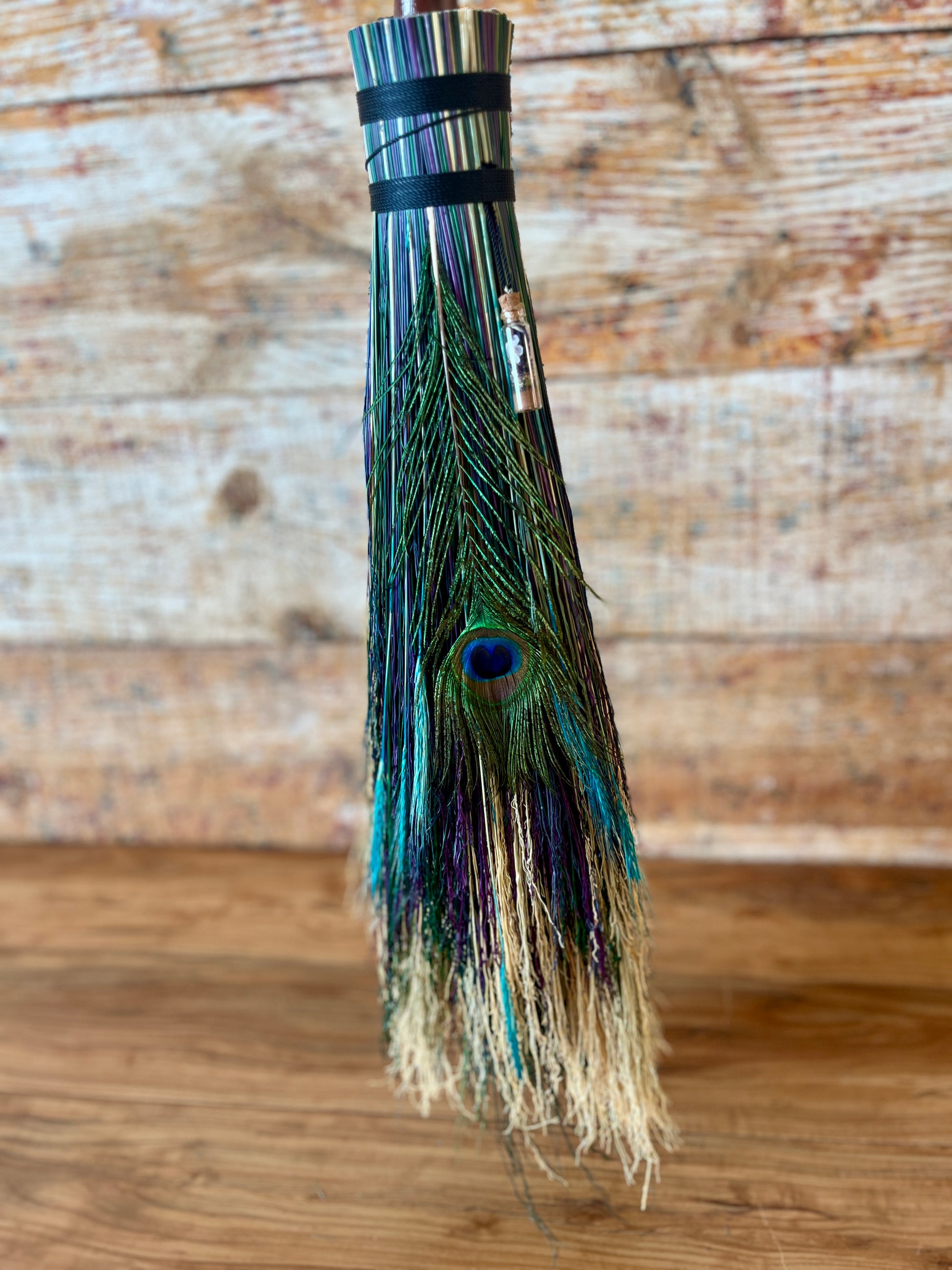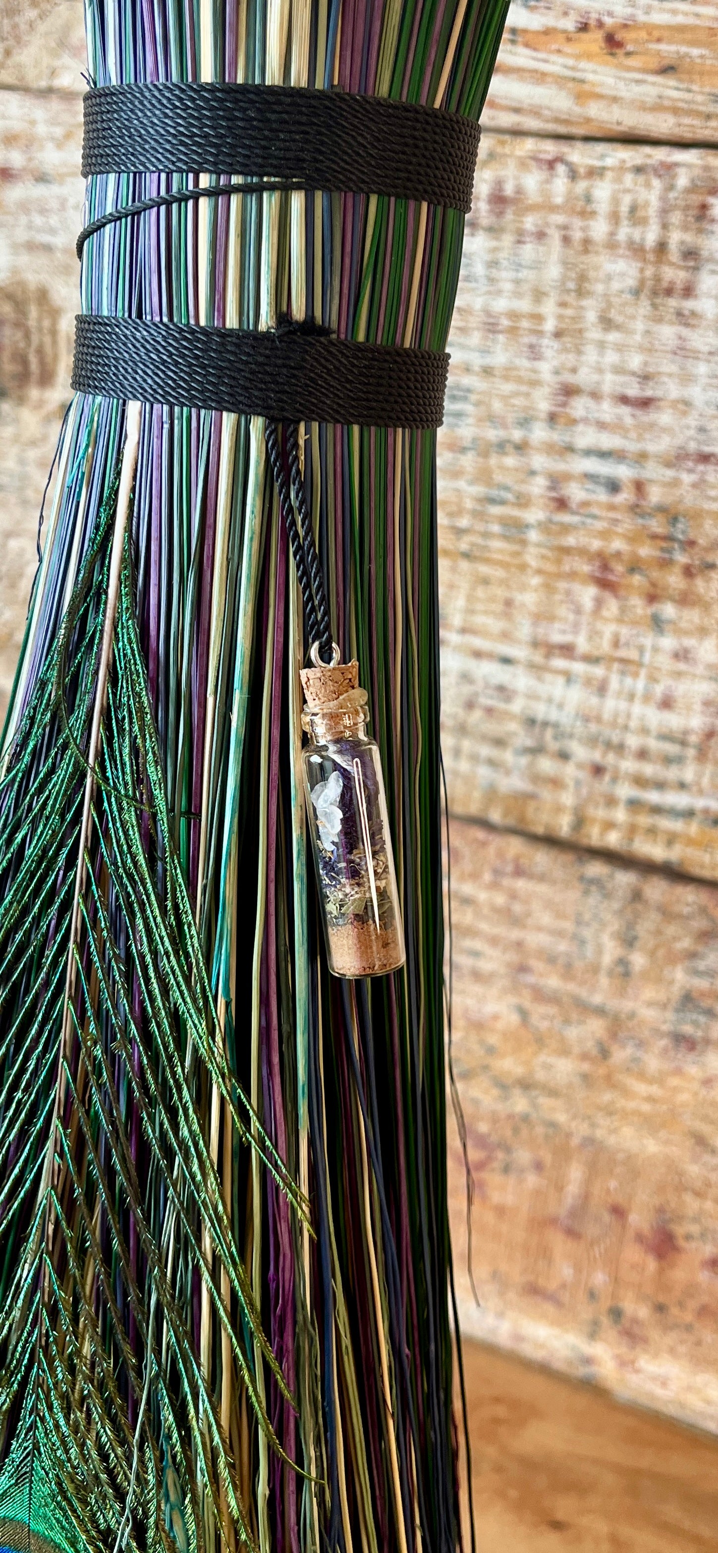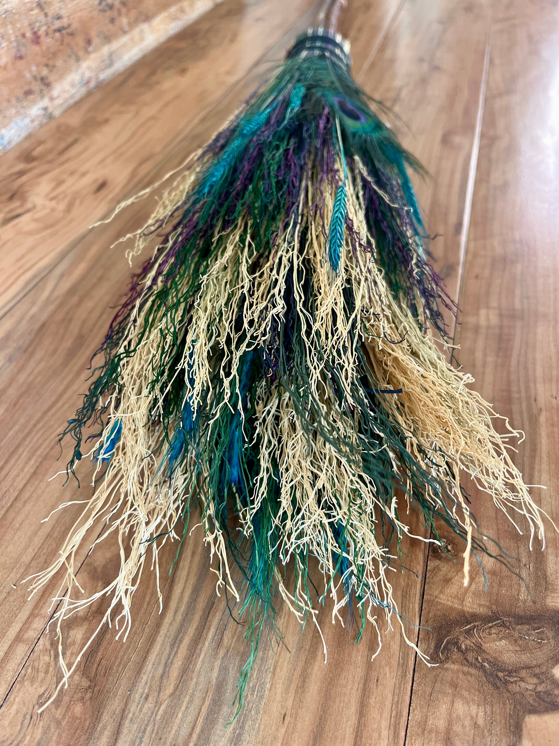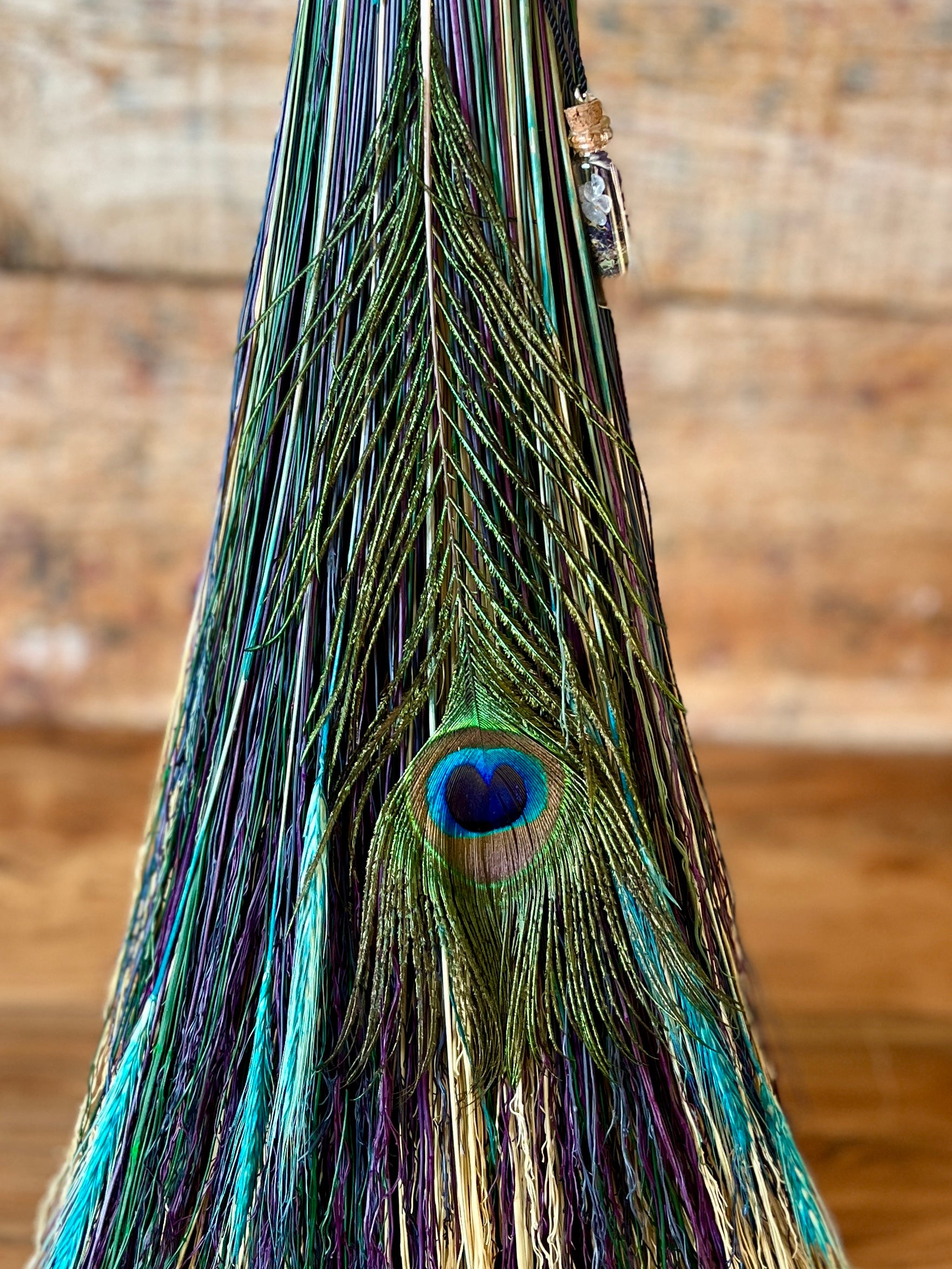 This handcrafted full-size besom features natural broomcorn interwoven with strokes of green, purple, and blue, creating a luminous palette that feels both mystical and grounded. Vibrant turquoise wheatgrass is tucked among the bristles, adding a bright, otherworldly shimmer. The neck is wrapped in black thread and accented with a striking peacock feather, bringing movement, color, and a watchful, intuitive presence. A small glass vial rests at the neck, offering a quiet touch of intention without overpowering the piece. Standing at approximately 57 inches tall, Oracle’s Flight carries the energy of vision, insight, and guidance from realms just beyond sight.