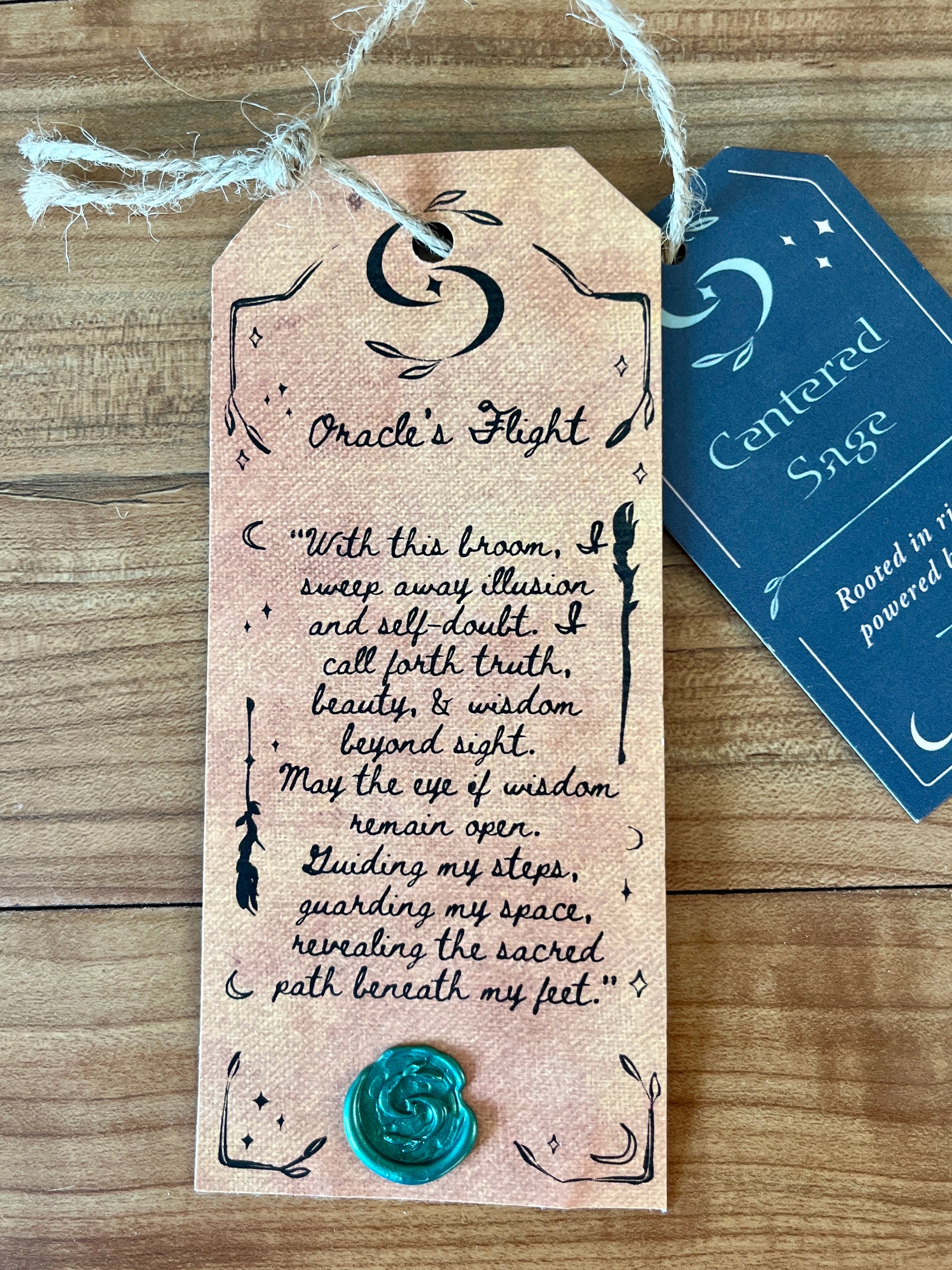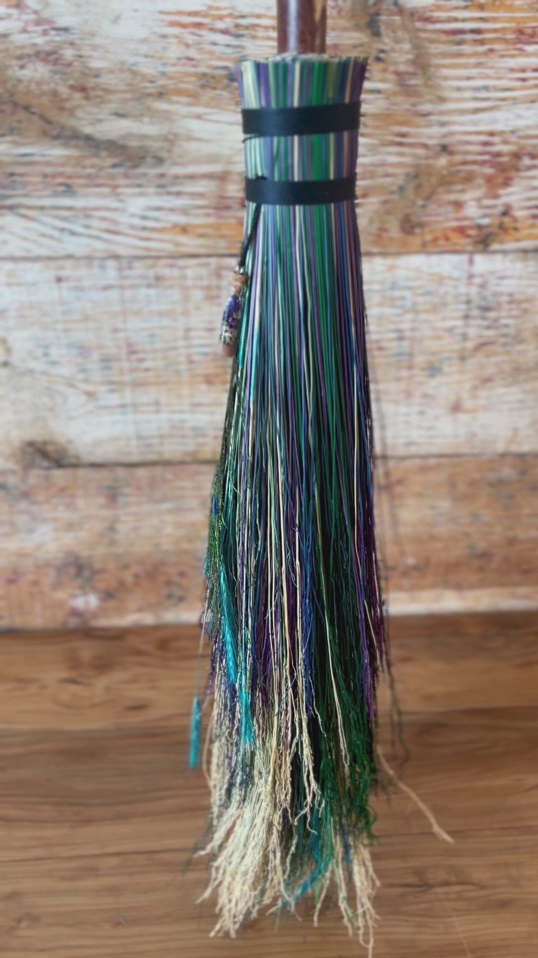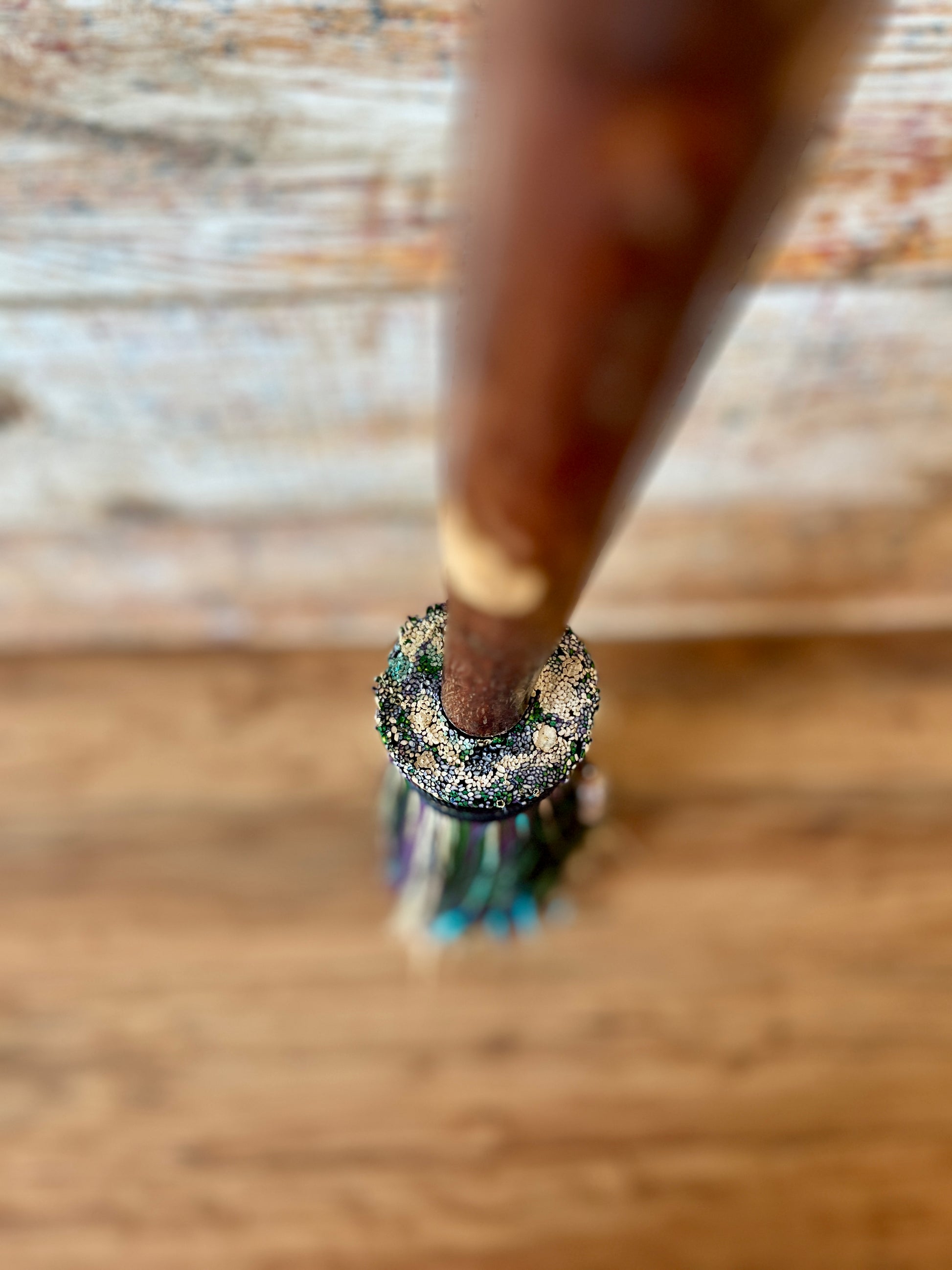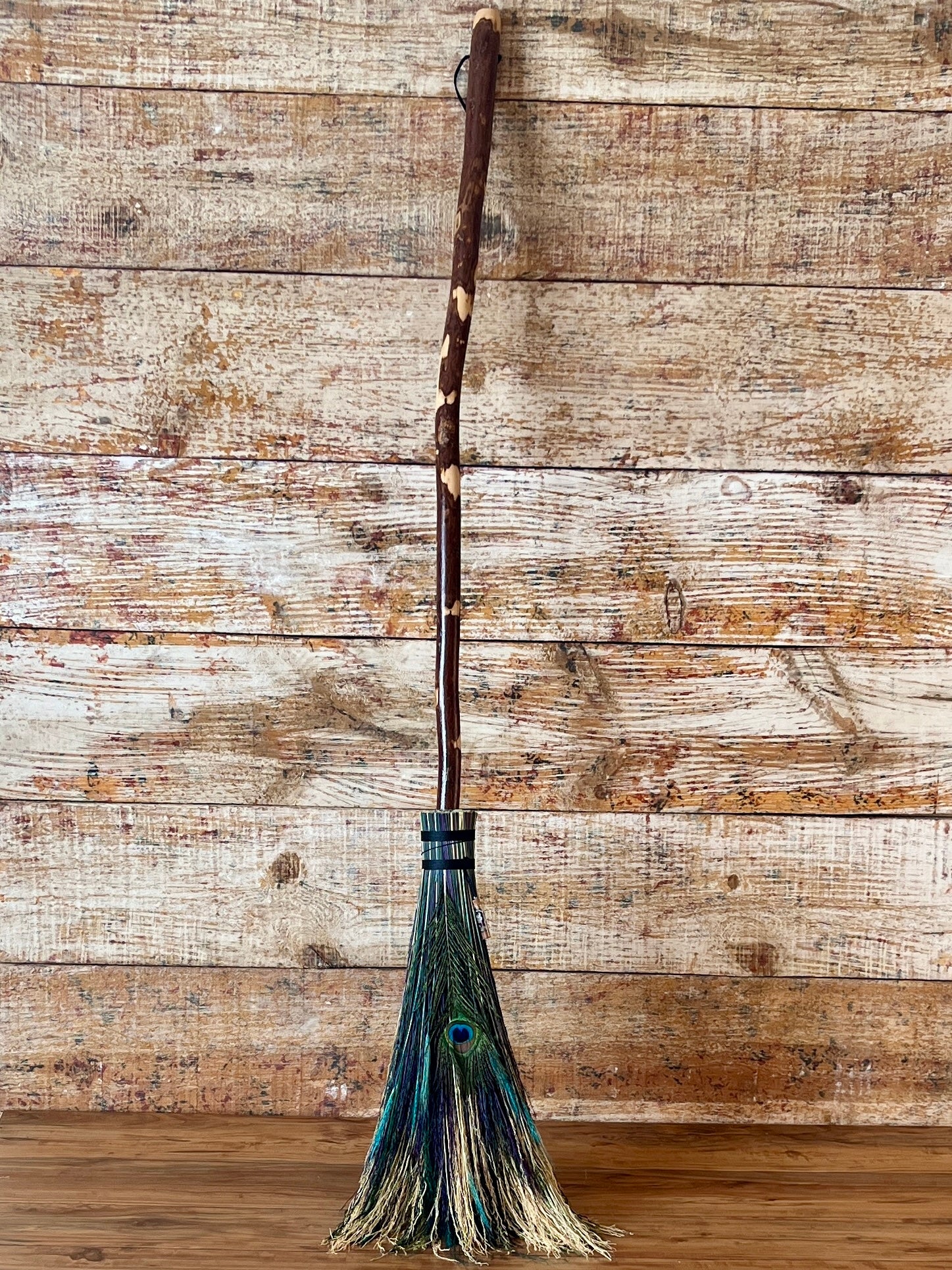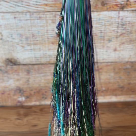 This handcrafted full-size besom features natural broomcorn interwoven with strokes of green, purple, and blue, creating a luminous palette that feels both mystical and grounded. Vibrant turquoise wheatgrass is tucked among the bristles, adding a bright, otherworldly shimmer. The neck is wrapped in black thread and accented with a striking peacock feather, bringing movement, color, and a watchful, intuitive presence. A small glass vial rests at the neck, offering a quiet touch of intention without overpowering the piece. Standing at approximately 57 inches tall, Oracle’s Flight carries the energy of vision, insight, and guidance from realms just beyond sight.