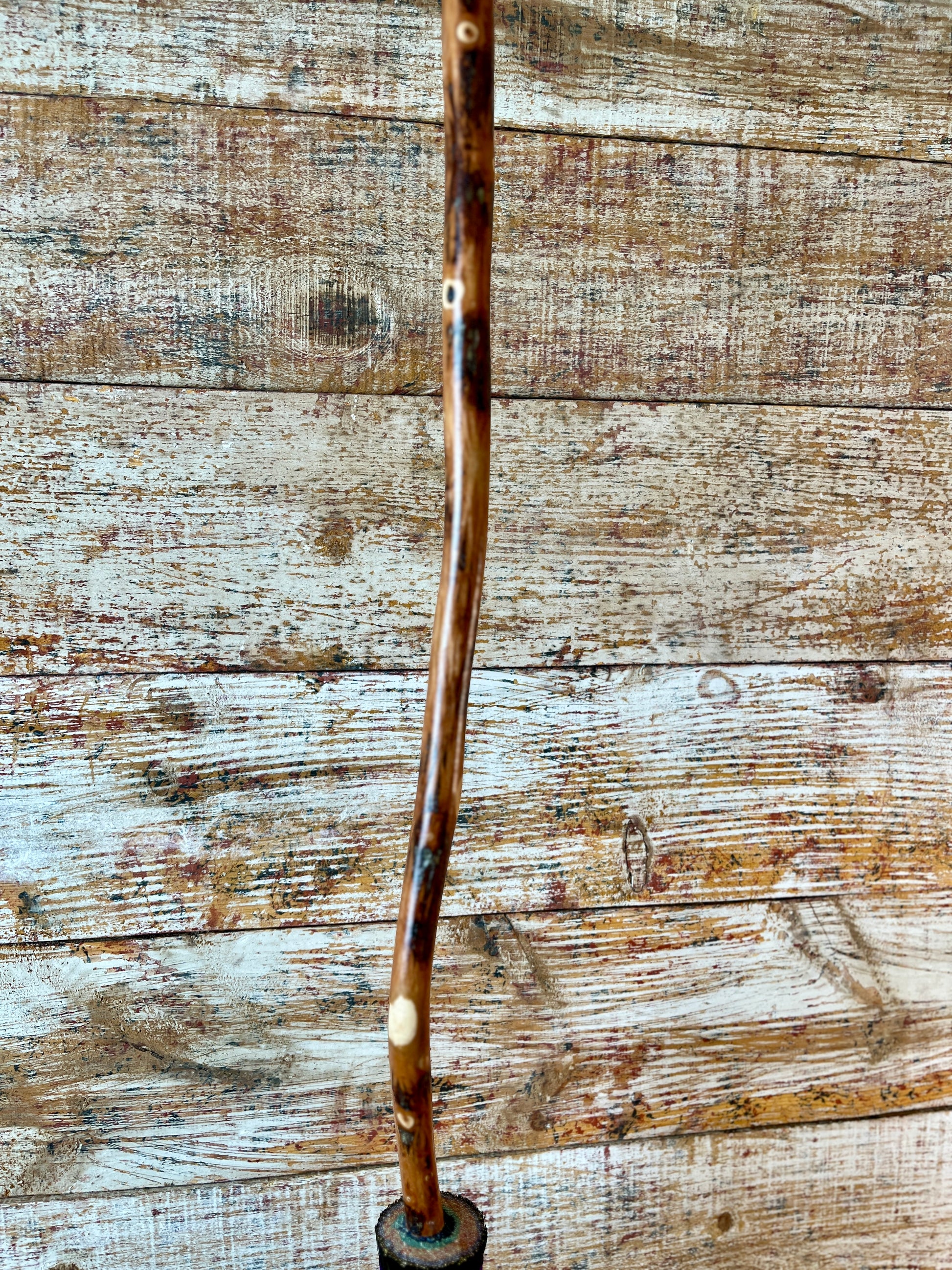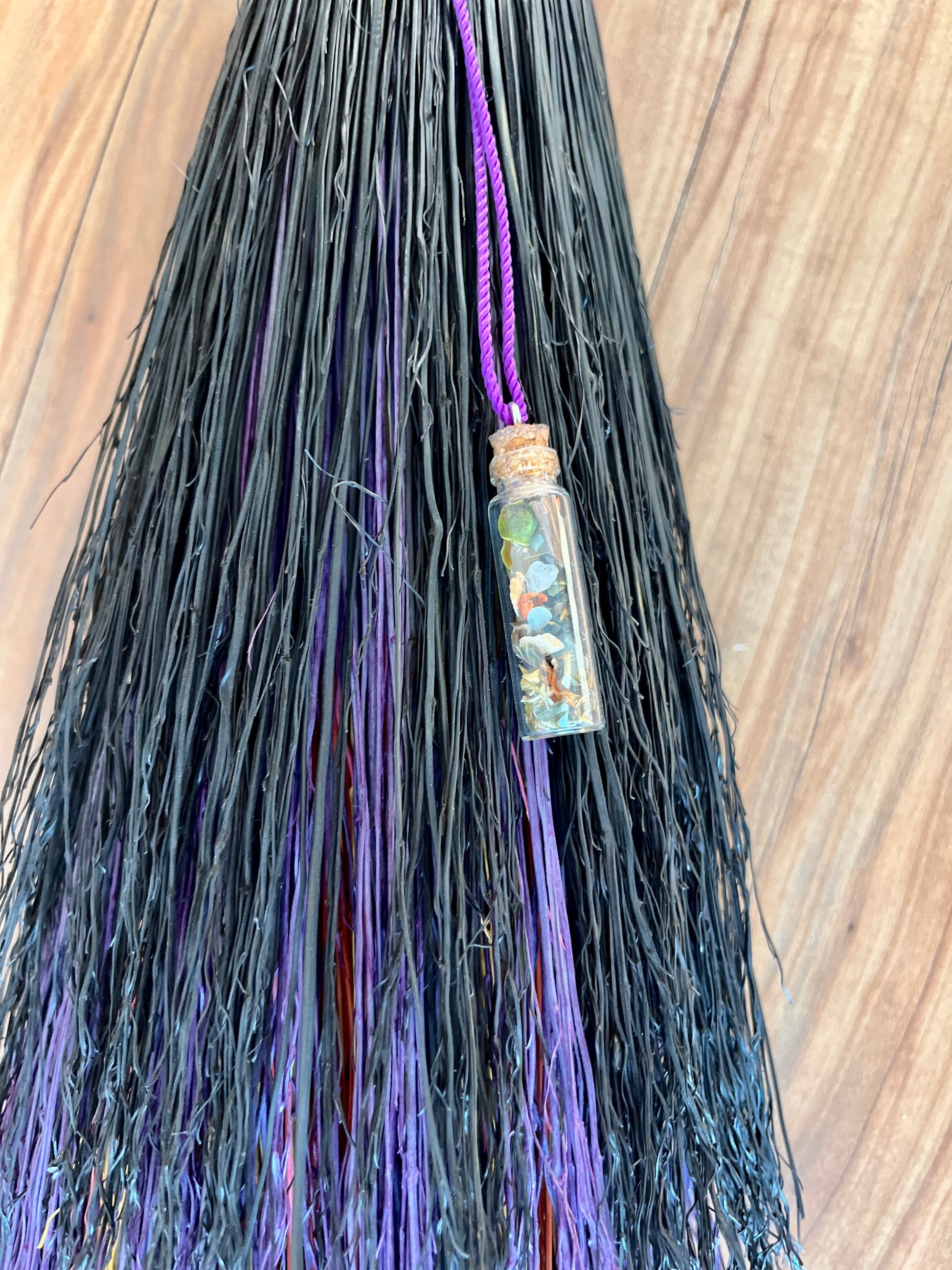 The neck is wrapped in vivid purple thread, and a small glass vial hangs beside it, filled with a blend of herbs, botanicals, and crystal chips chosen to support transformation, upliftment, and forward movement. The handle is naturally curved and hand-finished, adding organic character and grounding presence. Standing at approximately 56 inches, Prism Bloom carries the energy of blooming into one’s full, unfiltered spirit.