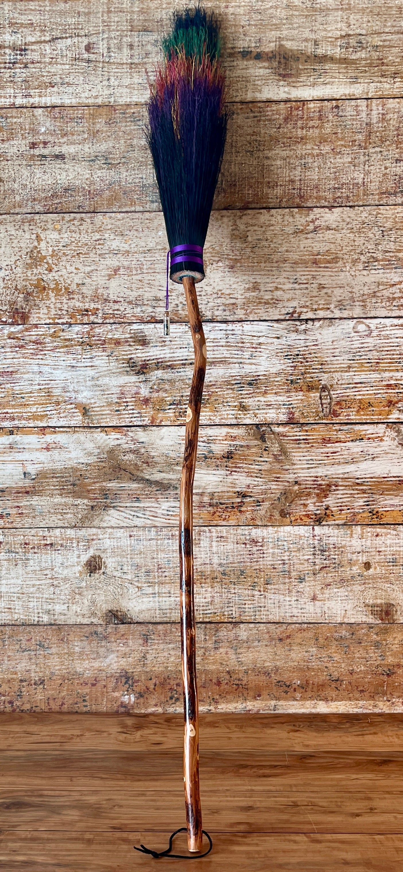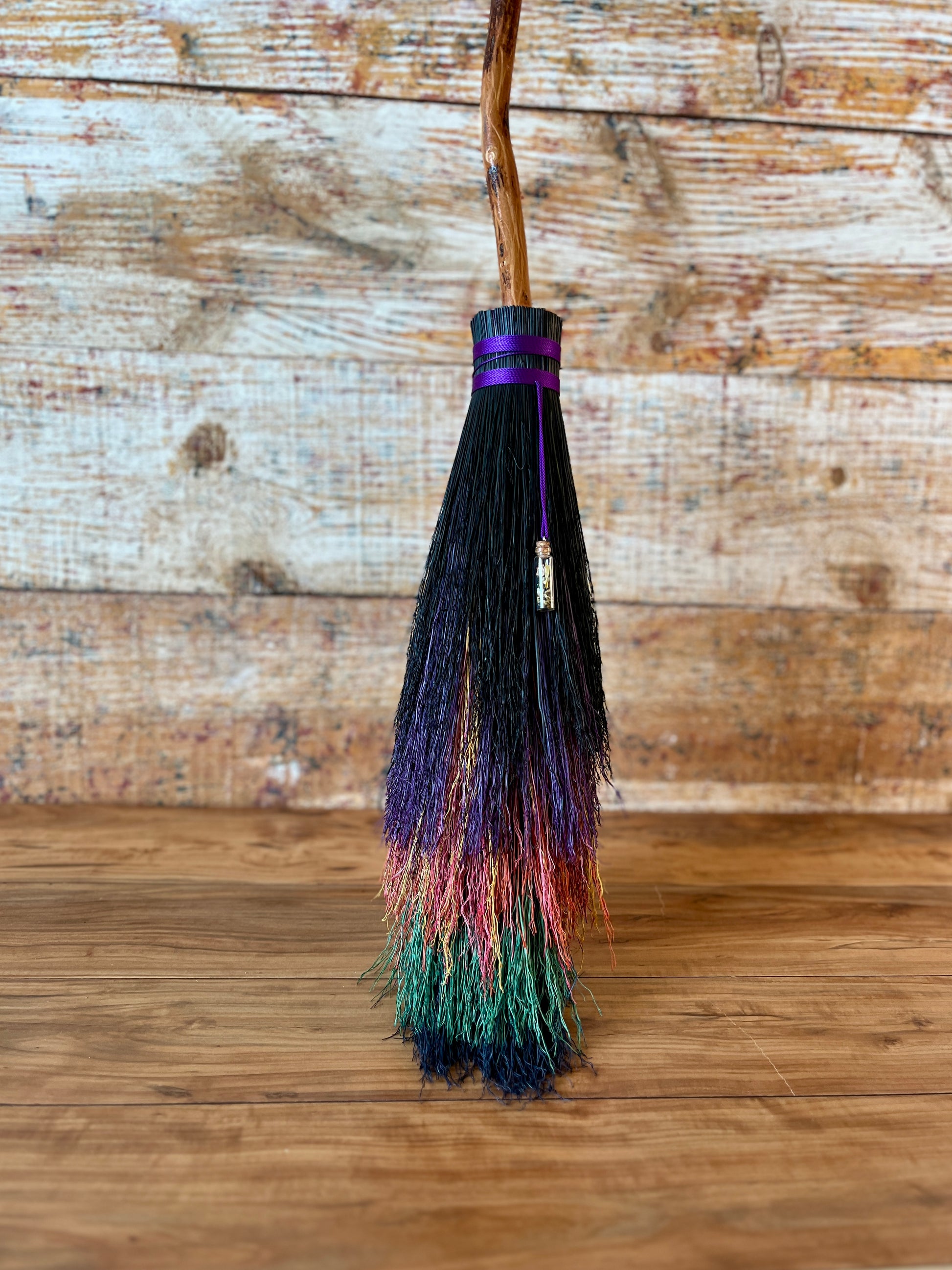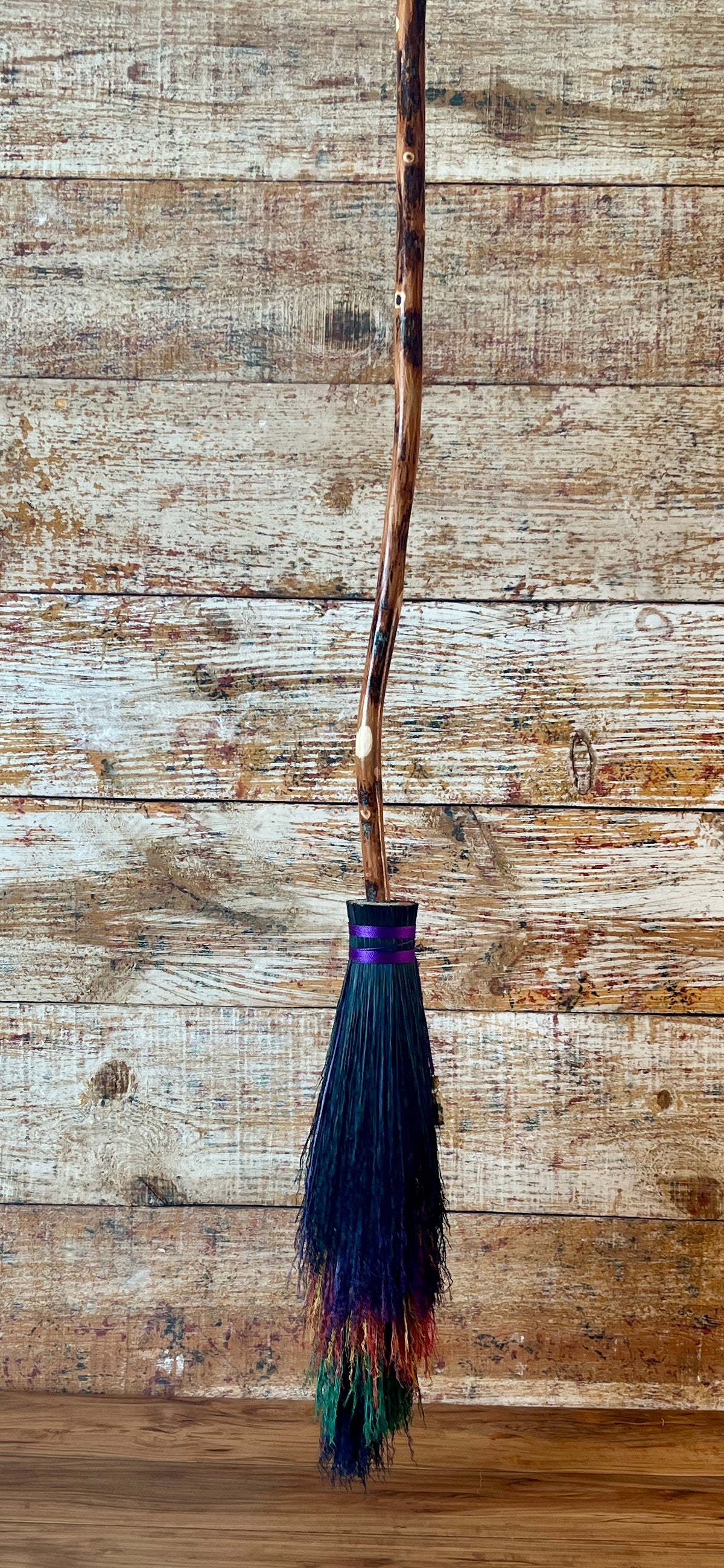 Prism Bloom is a full-size handcrafted besom designed to embody renewal, vibrance, and the courage to step into a brighter chapter. Its broomcorn transitions in layered color, midnight navy, kelly green, warm yellow-orange-pink tones, violet, and deep black. Creating a radiant cascade that feels alive and expressive.