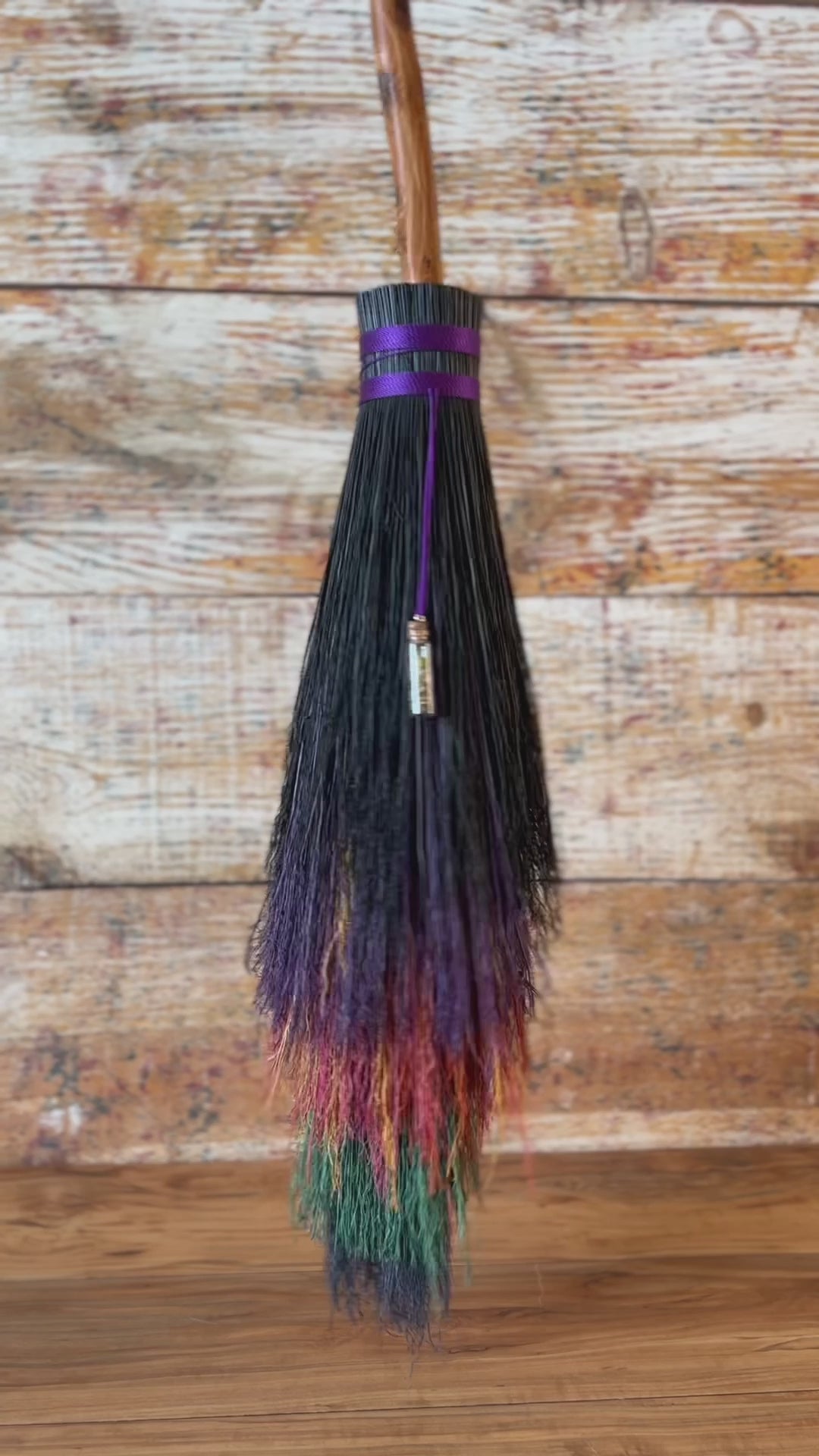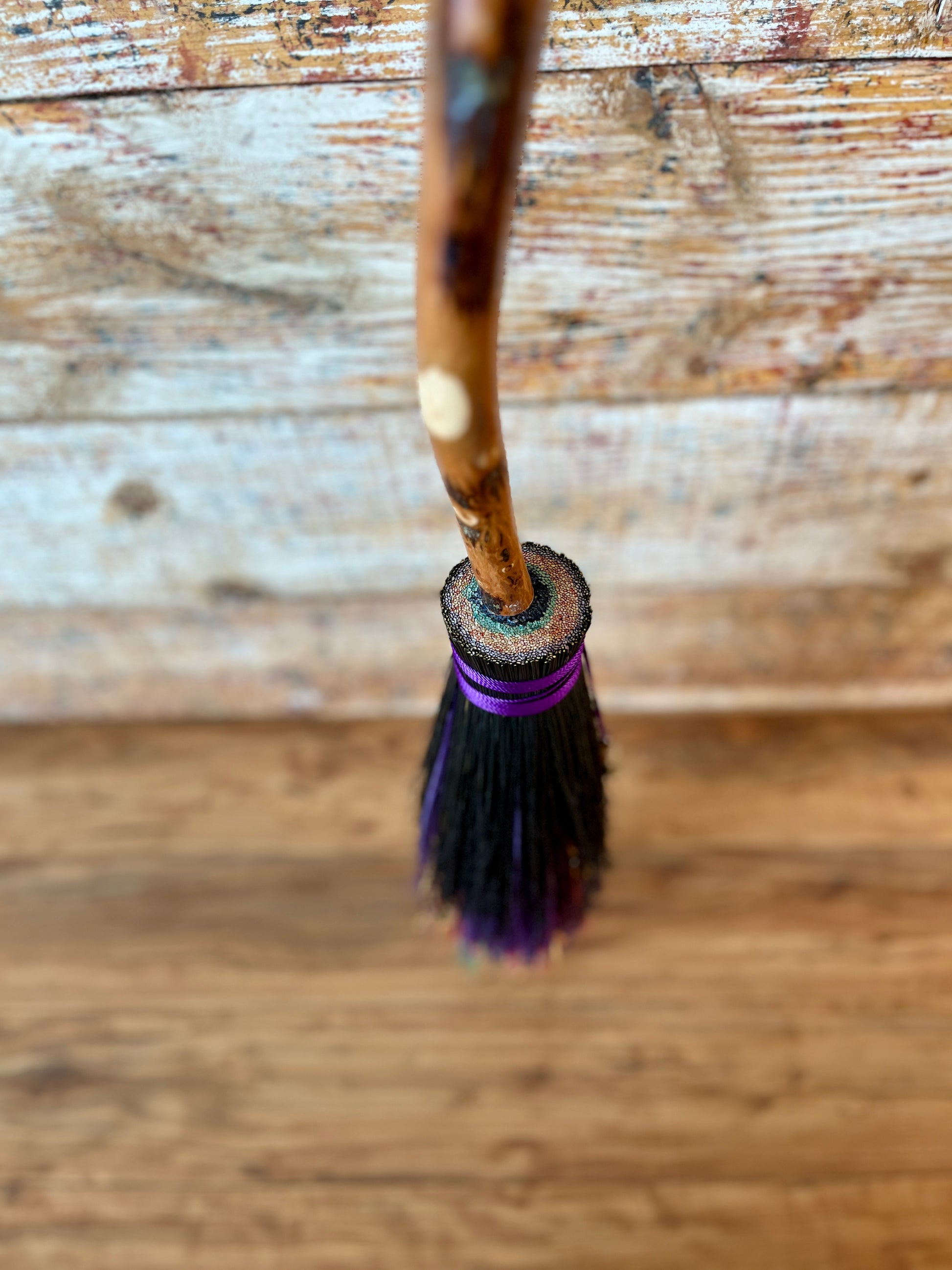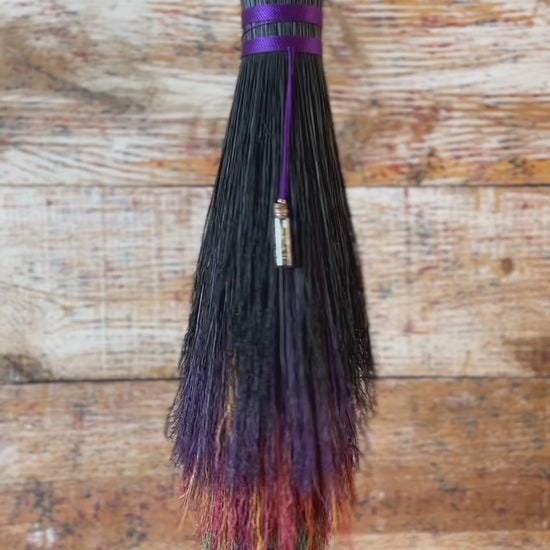 Prism Bloom is a full-size handcrafted besom designed to embody renewal, vibrance, and the courage to step into a brighter chapter. Its broomcorn transitions in layered color, midnight navy, kelly green, warm yellow-orange-pink tones, violet, and deep black. Creating a radiant cascade that feels alive and expressive.
