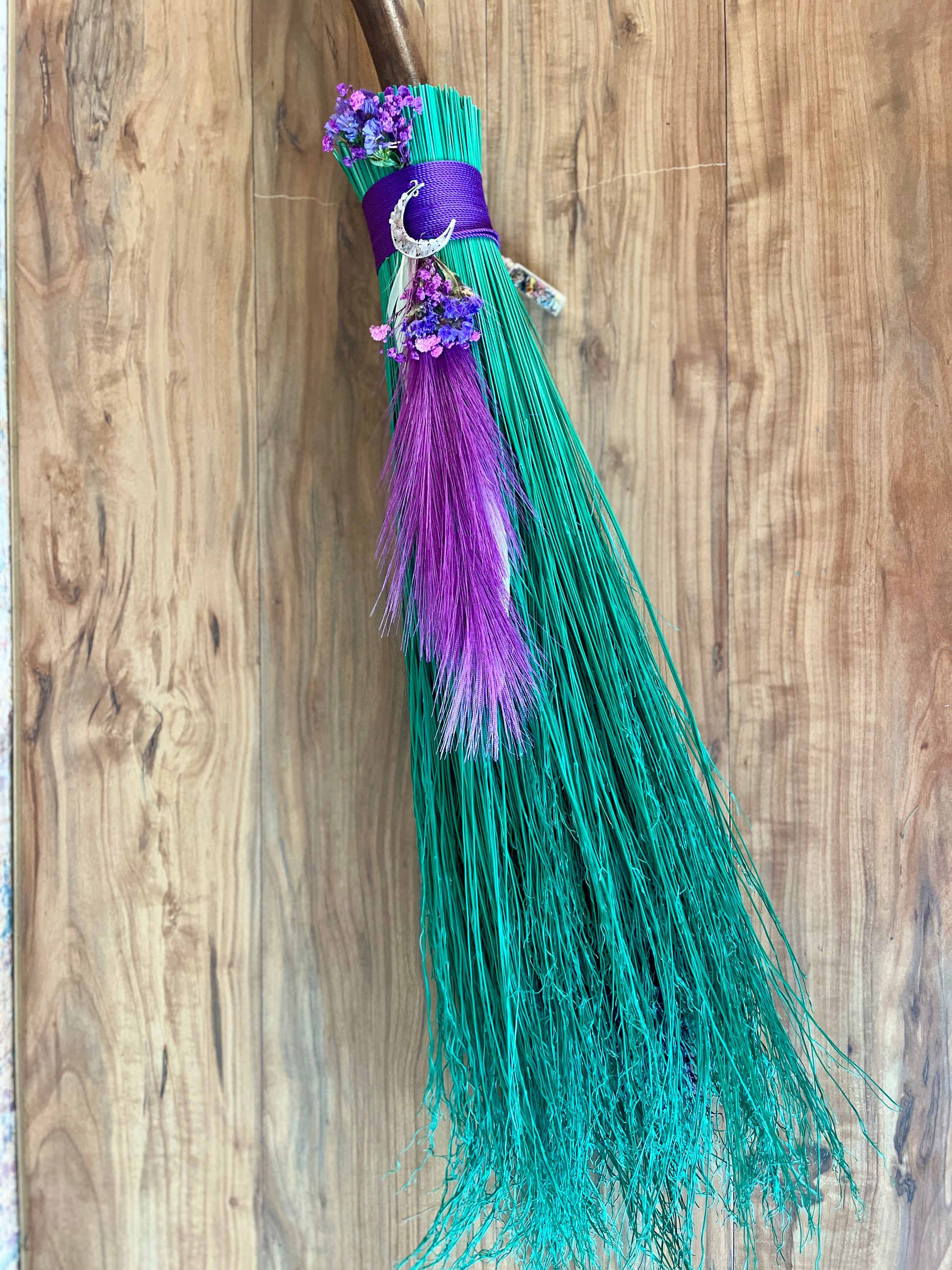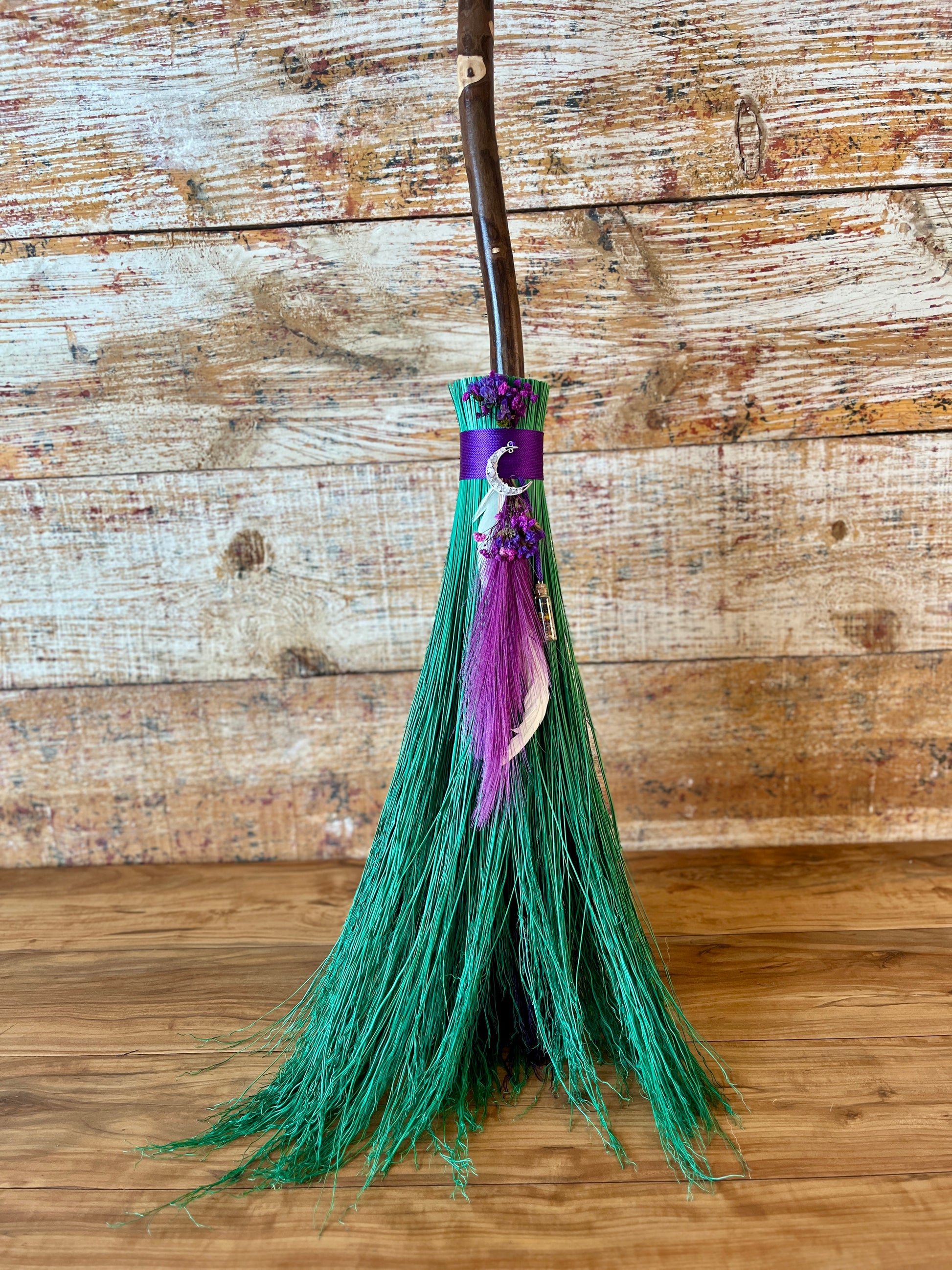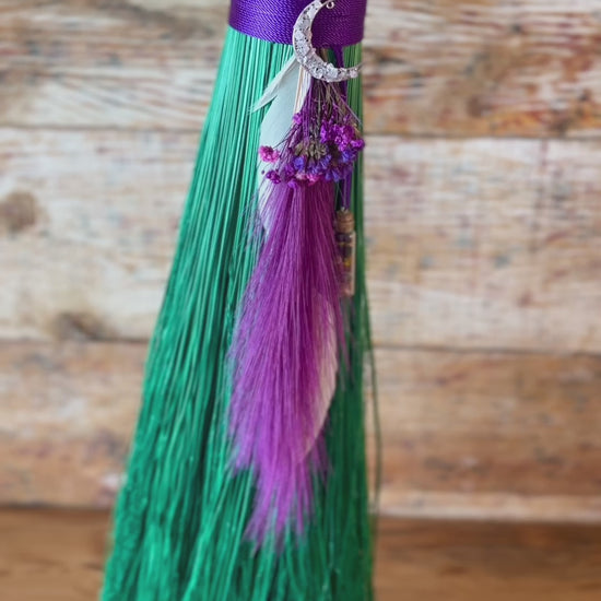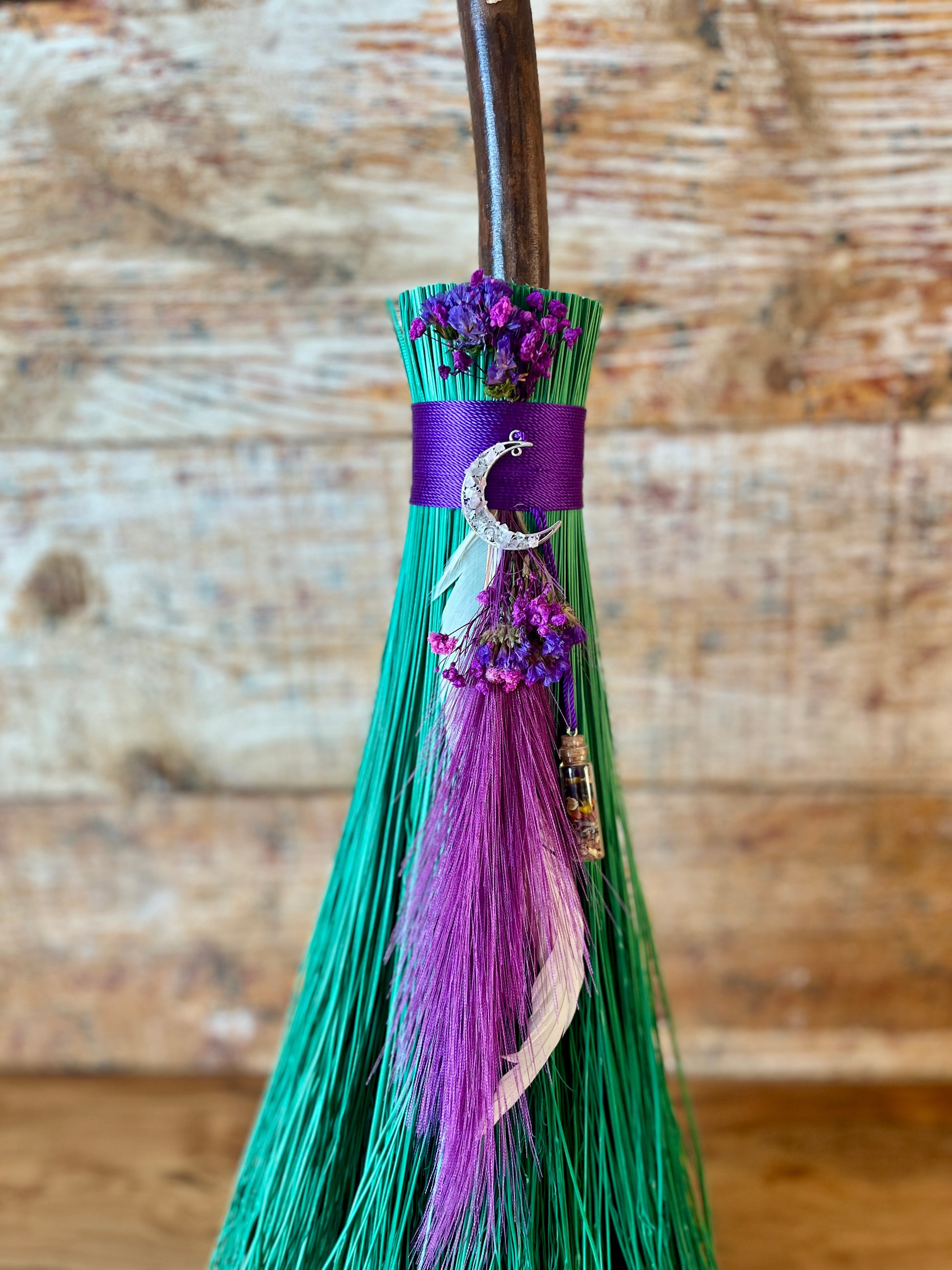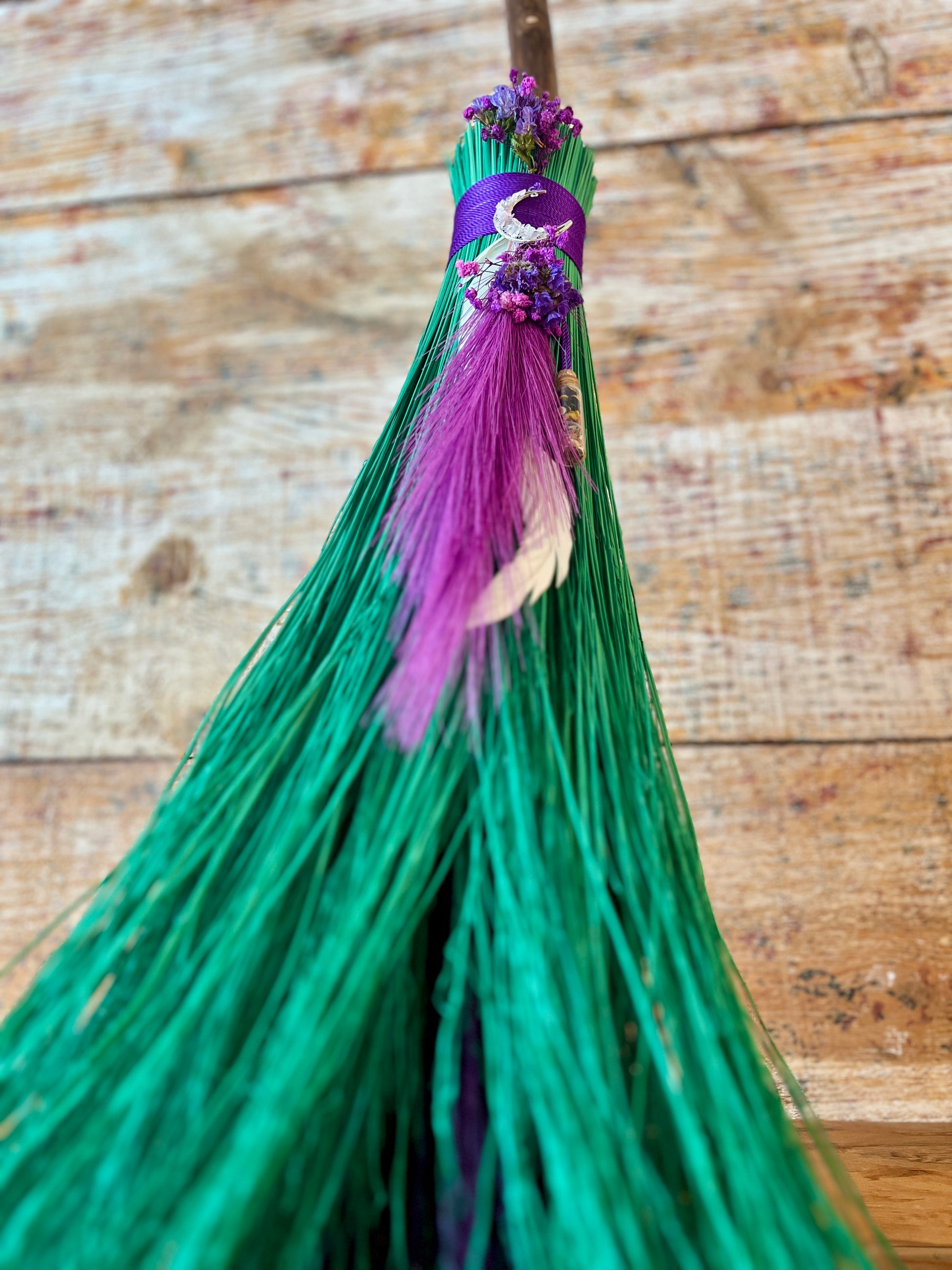 This handcrafted full-size besom stands at approximately 58 inches tall. The bristles are a luminous mint-green broomcorn, accented by soft dried botanicals and a vivid purple decorative plume that adds movement and a sense of fresh, blooming energy. A subtle pop of purple is hidden at the center, adding a quiet spark of intuitive renewal to the design. The neck is wrapped in rich purple thread and adorned with a rose-quartz crescent moon, bringing gentle warmth and emotional renewal to the piece. A glass vial rests at the neck, filled with herbs, flowers, berries, and crystal chips chosen to support healing, release, and new beginnings.
