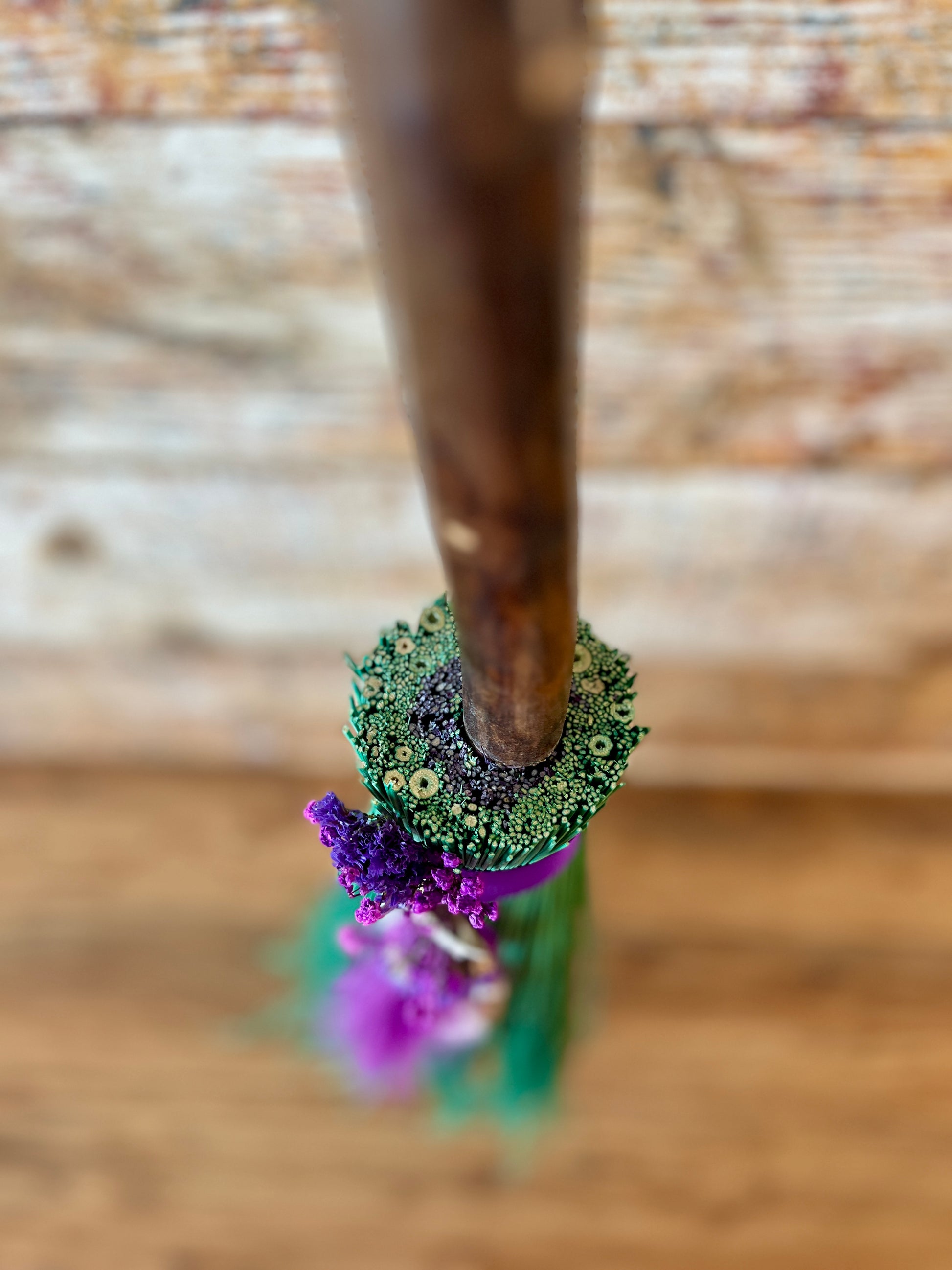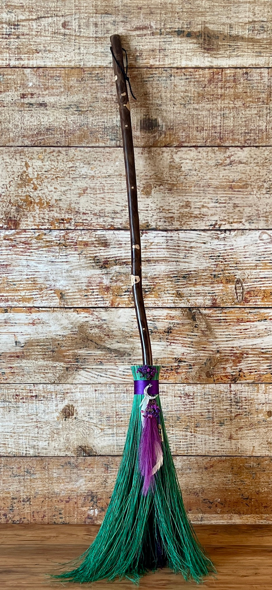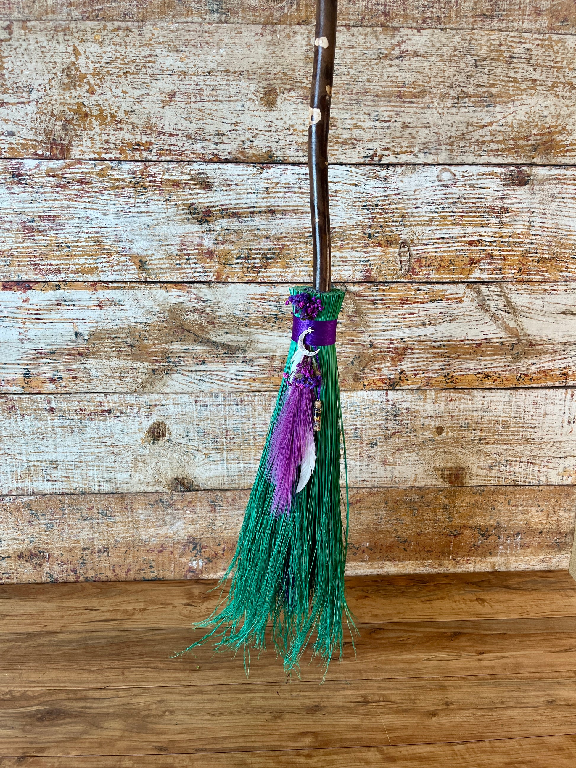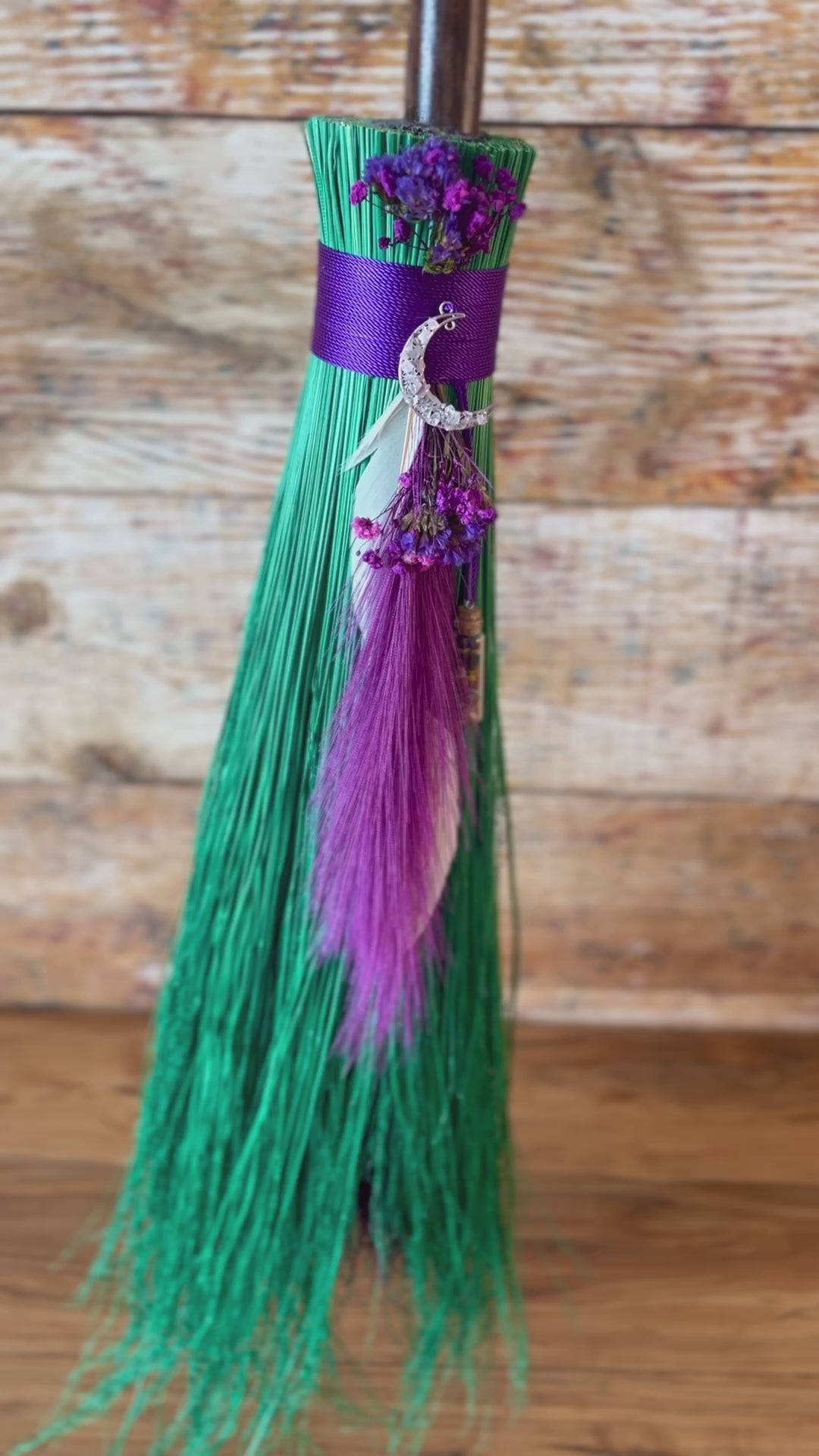 This handcrafted full-size besom stands at approximately 58 inches tall. The bristles are a luminous mint-green broomcorn, accented by soft dried botanicals and a vivid purple decorative plume that adds movement and a sense of fresh, blooming energy. A subtle pop of purple is hidden at the center, adding a quiet spark of intuitive renewal to the design. The neck is wrapped in rich purple thread and adorned with a rose-quartz crescent moon, bringing gentle warmth and emotional renewal to the piece. A glass vial rests at the neck, filled with herbs, flowers, berries, and crystal chips chosen to support healing, release, and new beginnings.