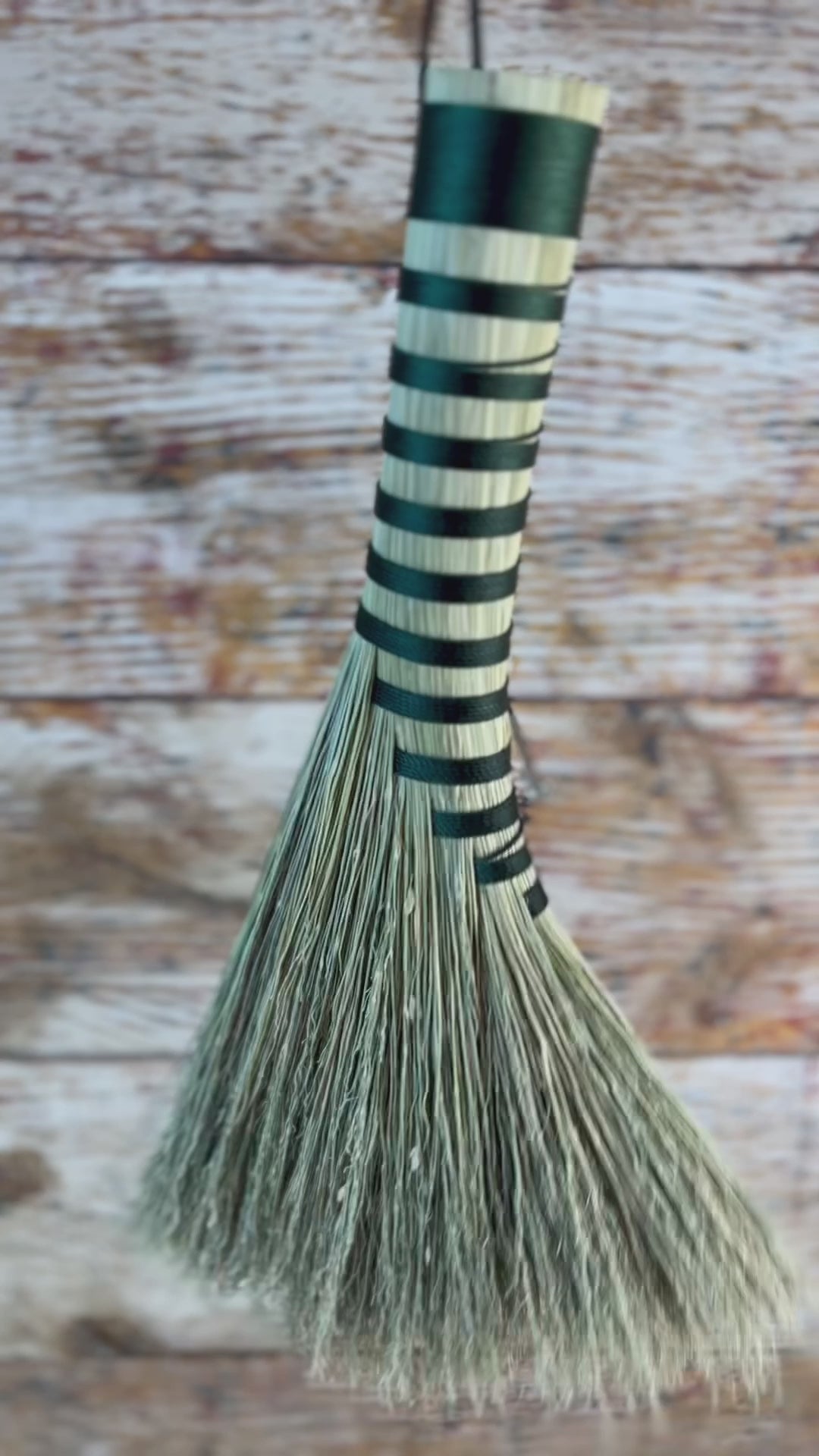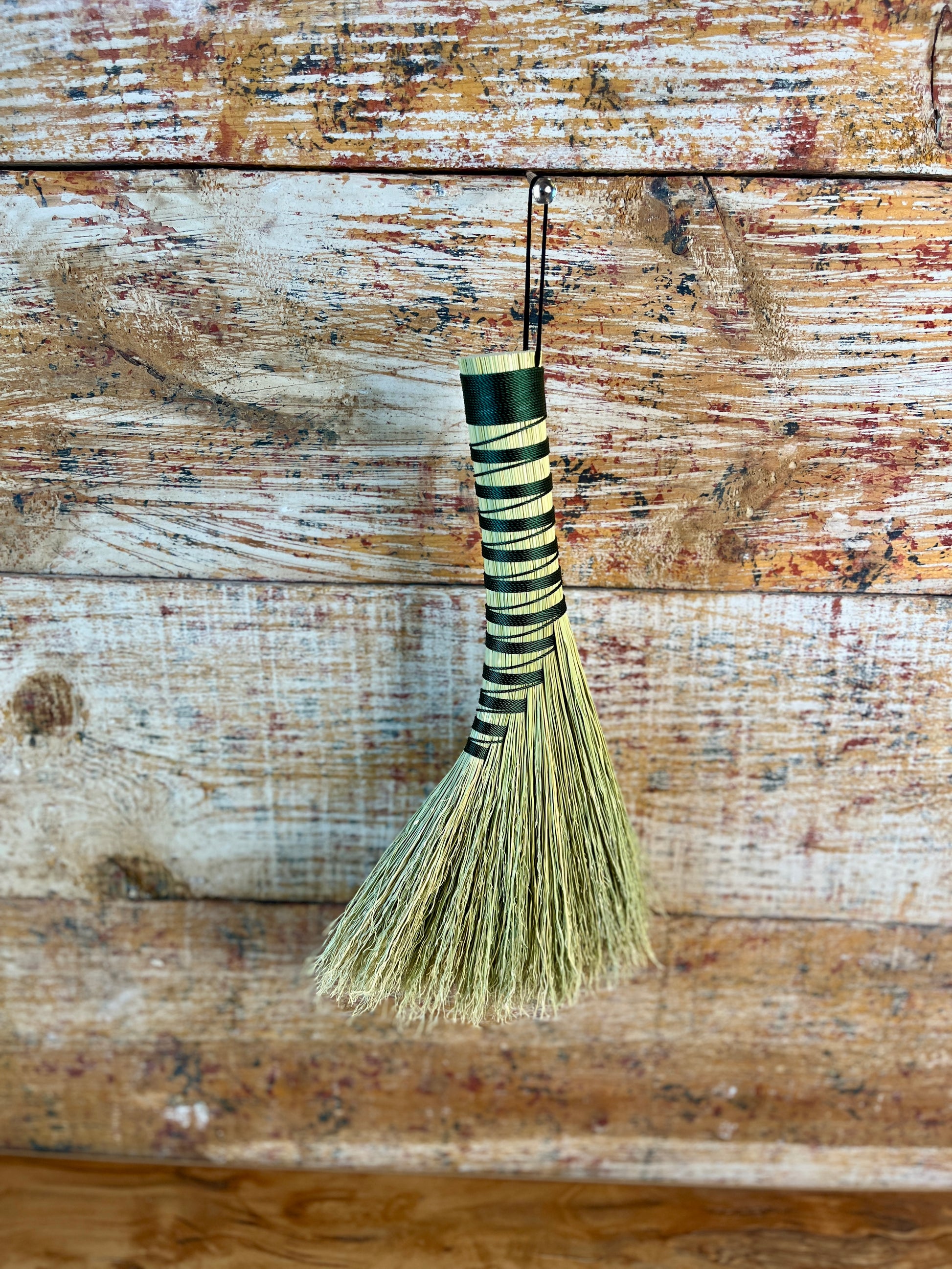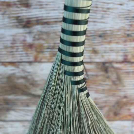 This handcrafted whisk stands at approximately 14 inches tall, shaped in the classic turkey wing style with a soft, natural fan. The bristles are all-natural broomcorn, left undyed for an earthy, timeless look. The handle is wrapped in a deep forest-green thread that adds a grounded, understated contrast without overpowering the simplicity of the design. This whisk is created for those who appreciate clean lines, quiet energy, and old-world craftsmanship.