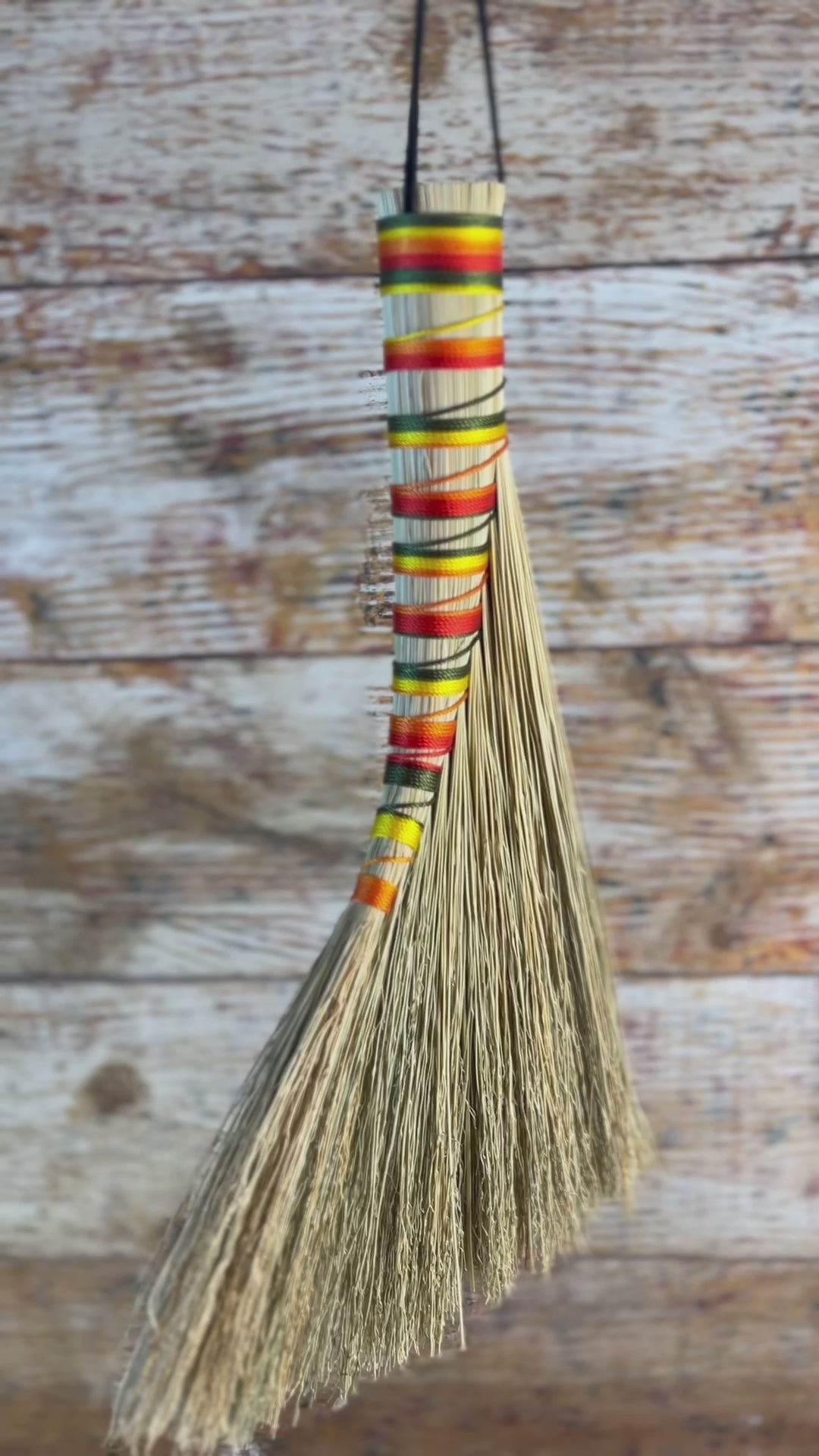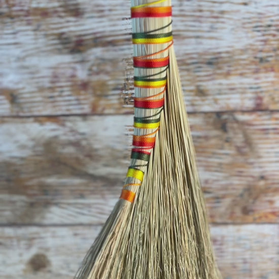 This handcrafted whisk stands at approximately 15 inches tall in the classic turkey wing style, offering a full, sweeping fan. The bristles are natural, rustic broomcorn with soft golden and straw tones that give the piece an old-world, grounded feel. It is wrapped in an ombre Sunrise Harvest thread that shifts through warm yellows, oranges, greens, and reds, adding a bright, seasonal accent without overpowering the simplicity of the broom. This whisk blends warmth and tradition, creating a piece that feels both earthy and quietly uplifting.