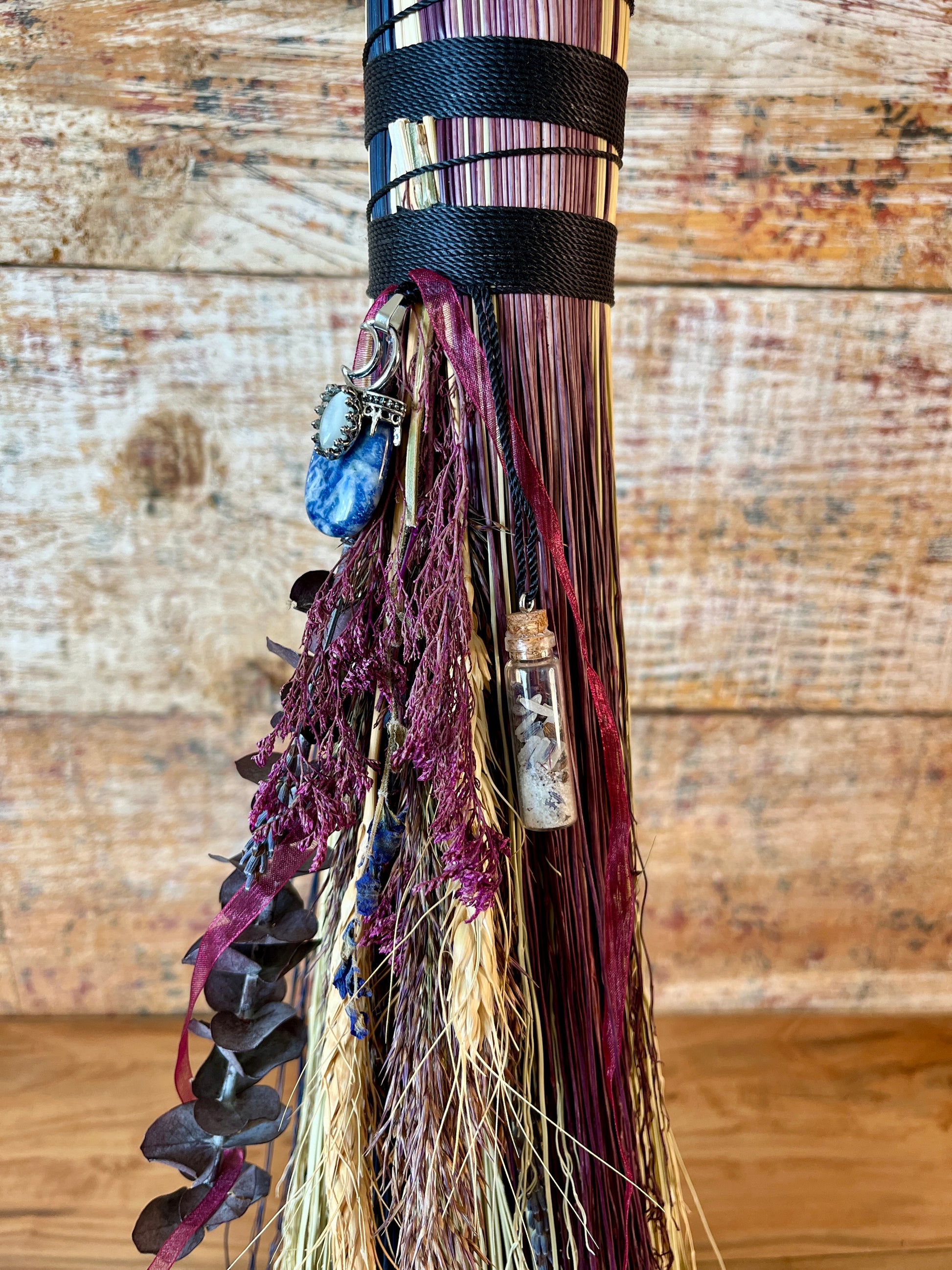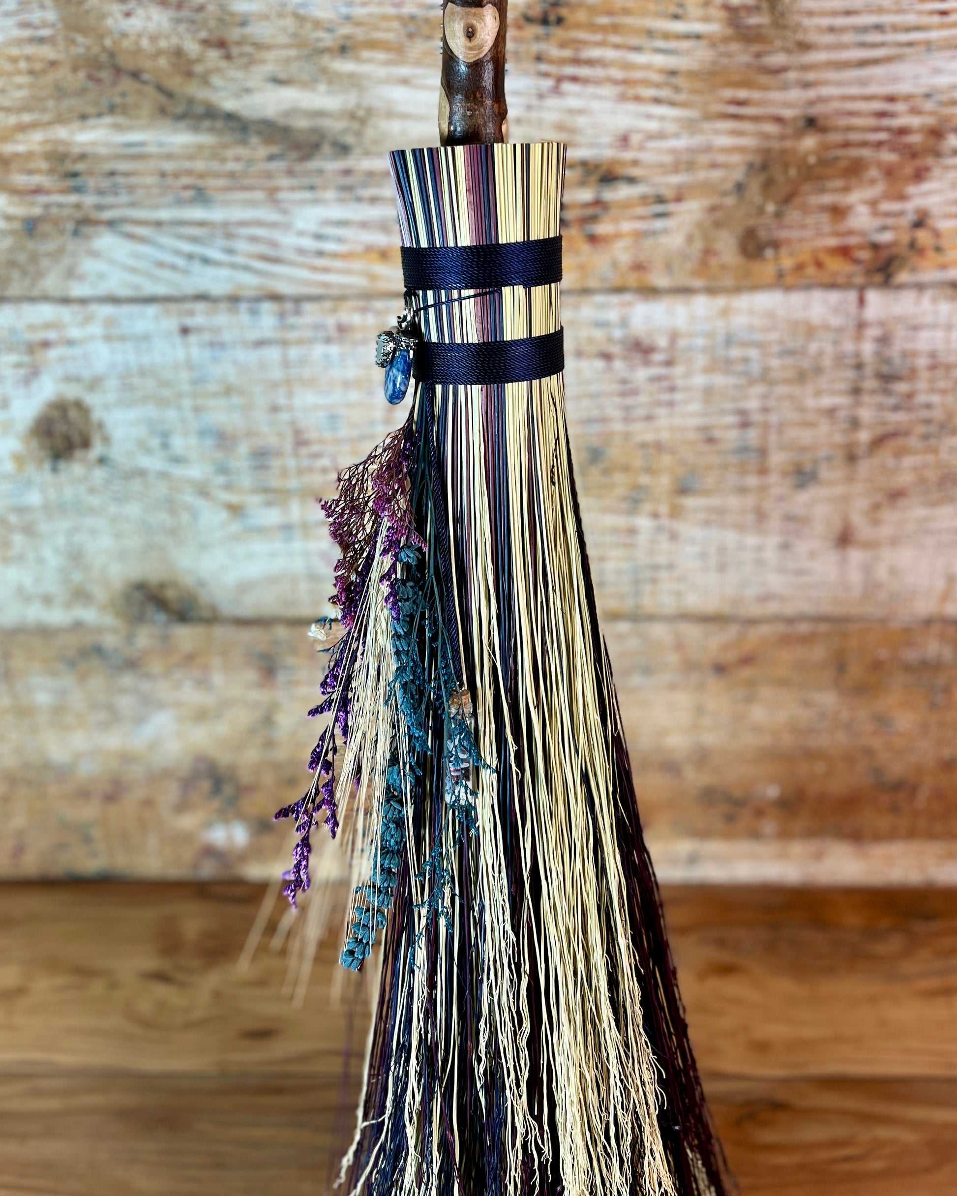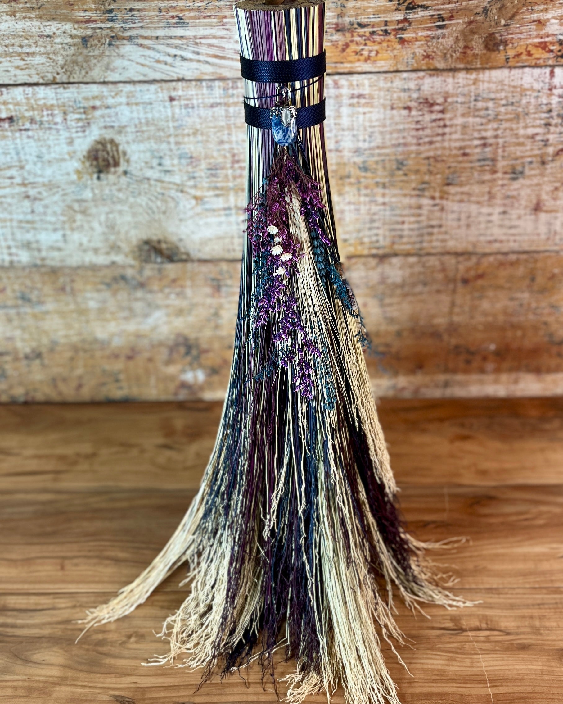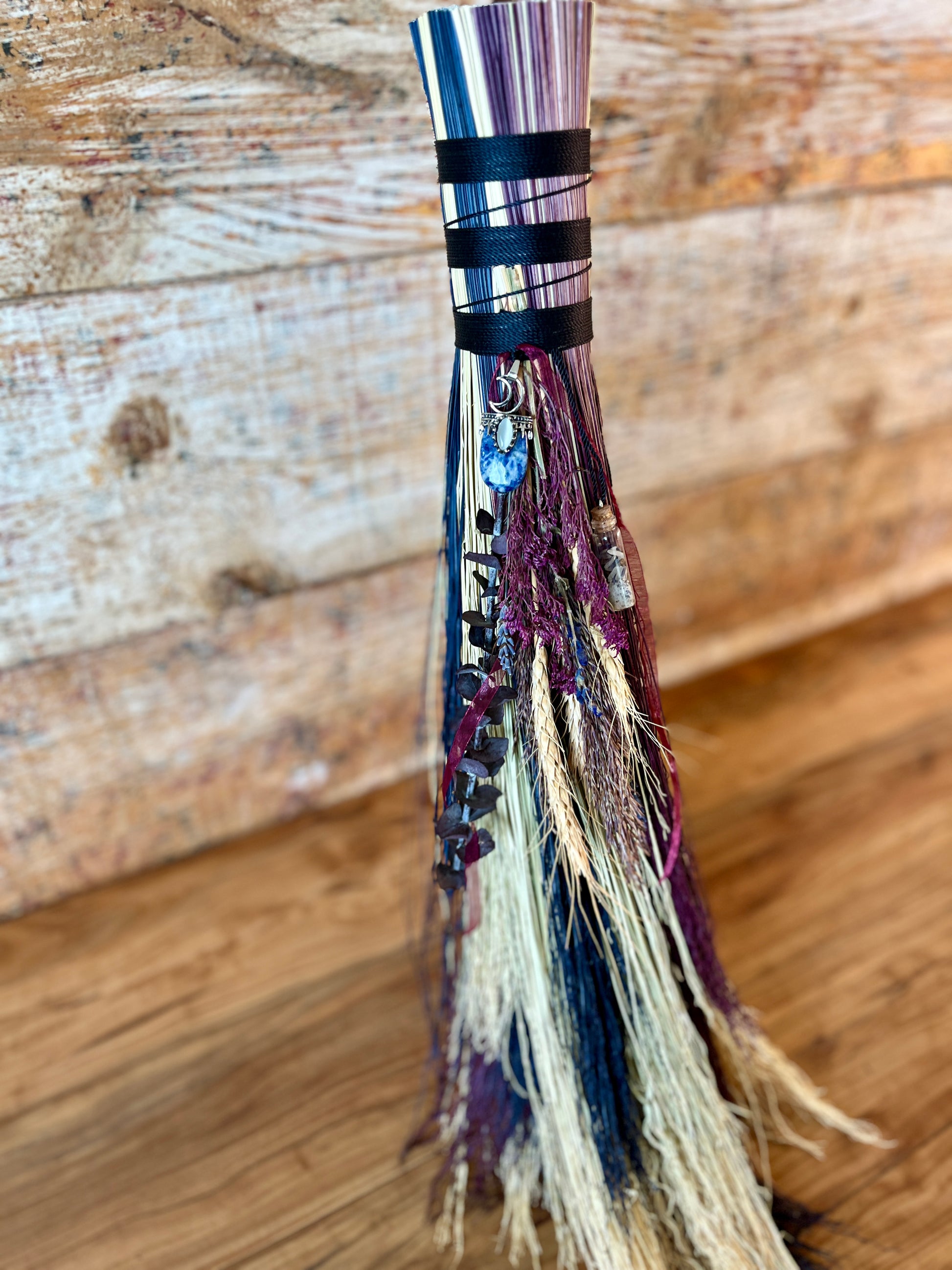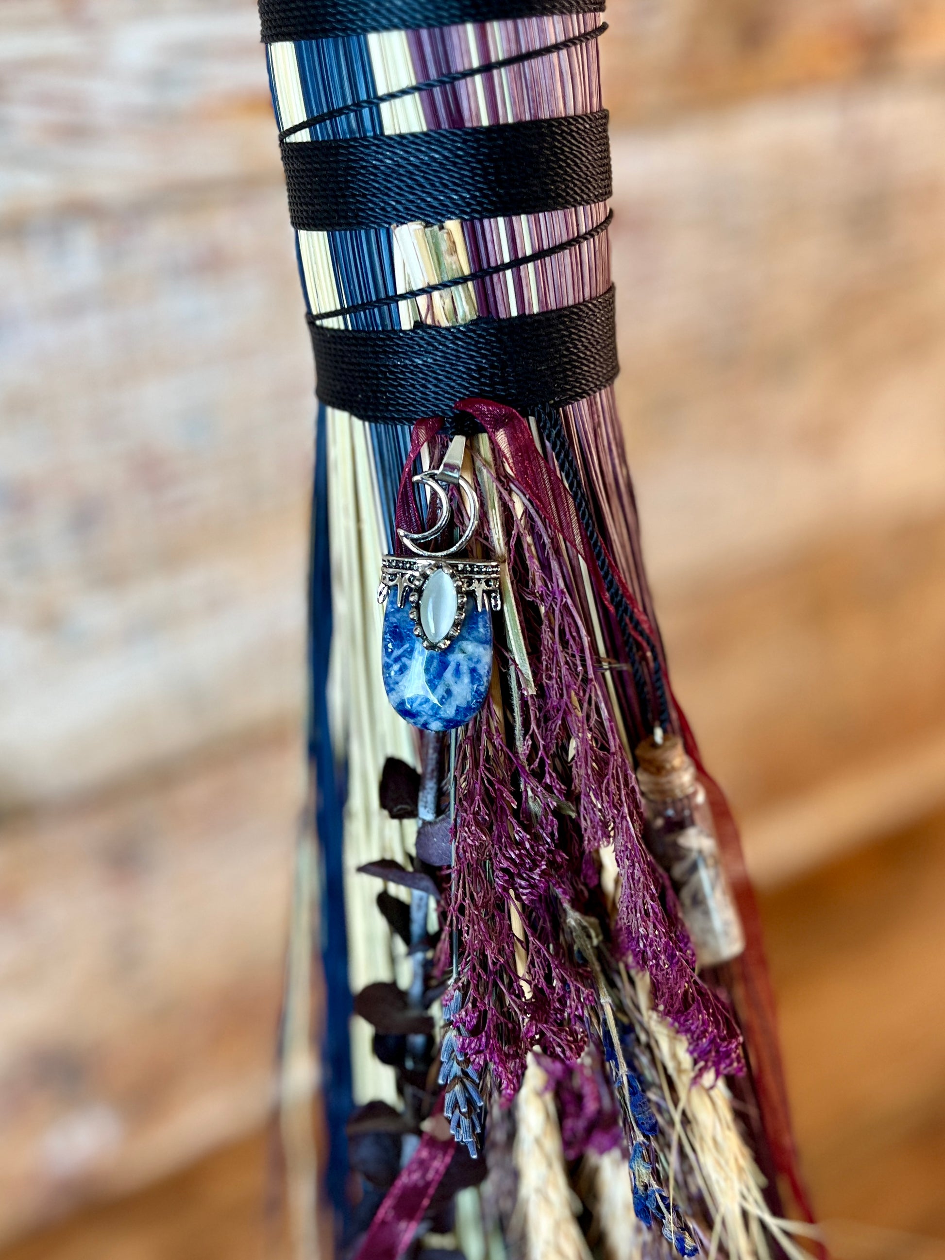 This handcrafted full-size besom stands at approximately 59 inches tall. The bristles blend natural, navy, and plum broomcorn, giving the piece a deep, steady, intentional feel. The neck is wrapped in black thread and adorned with a sodalite stone, offering a quiet, grounded presence without overwhelming the design. A small dried botanical bundle sits at the neck, adding gentle texture. A glass vial is tucked beside it, filled with herbs, spices, and crystal chips chosen to support devotion, courage, and the honoring of inner promises.