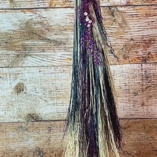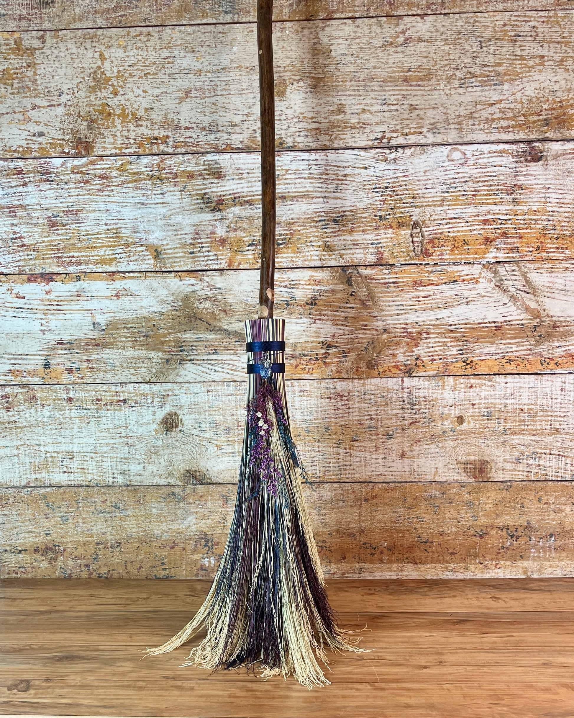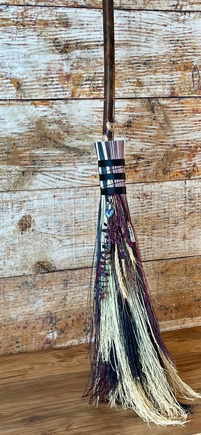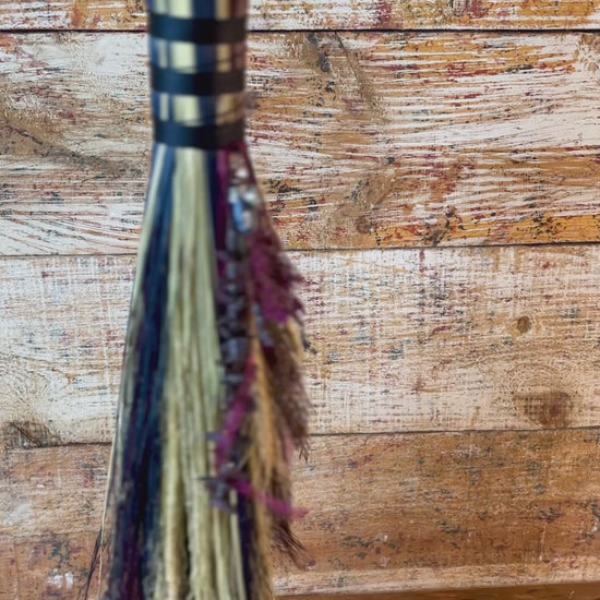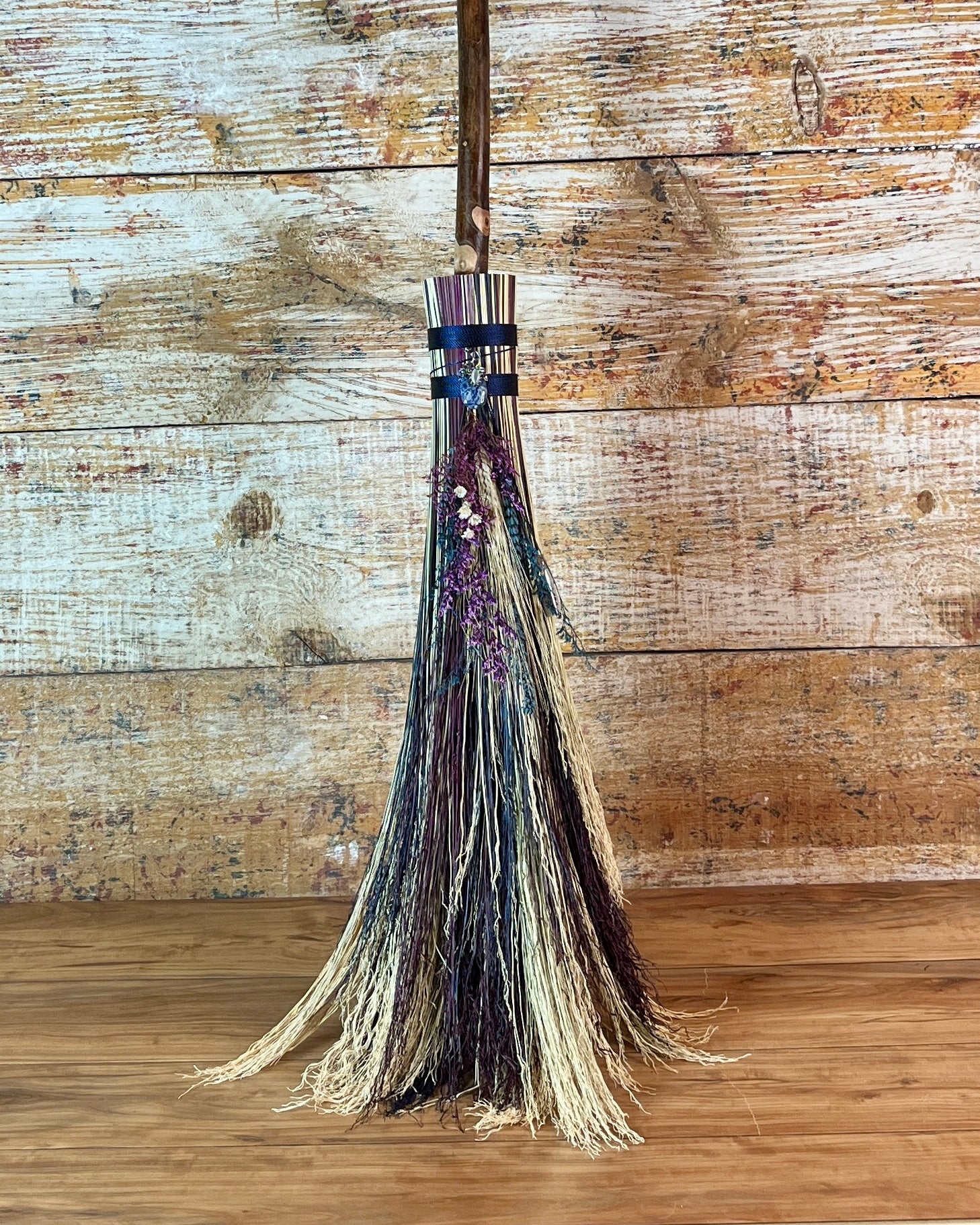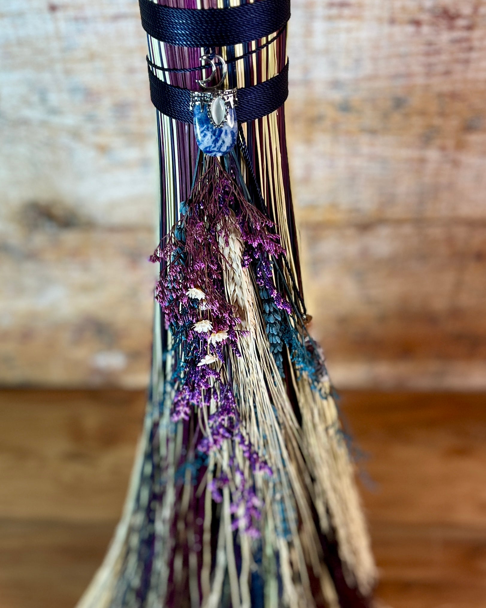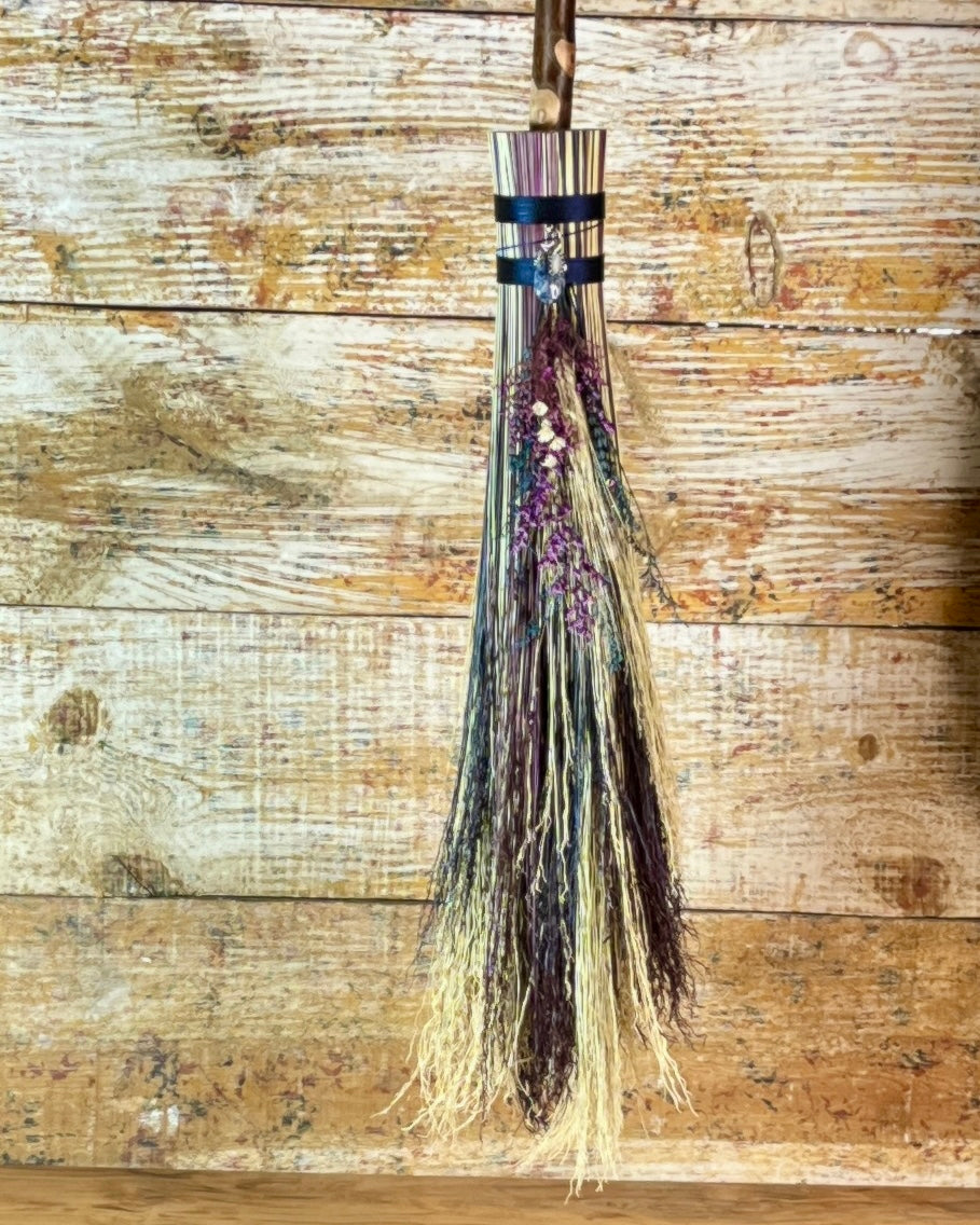 This handcrafted full-size besom stands at approximately 59 inches tall. The bristles blend natural, navy, and plum broomcorn, giving the piece a deep, steady, intentional feel. The neck is wrapped in black thread and adorned with a sodalite stone, offering a quiet, grounded presence without overwhelming the design. A small dried botanical bundle sits at the neck, adding gentle texture. A glass vial is tucked beside it, filled with herbs, spices, and crystal chips chosen to support devotion, courage, and the honoring of inner promises.