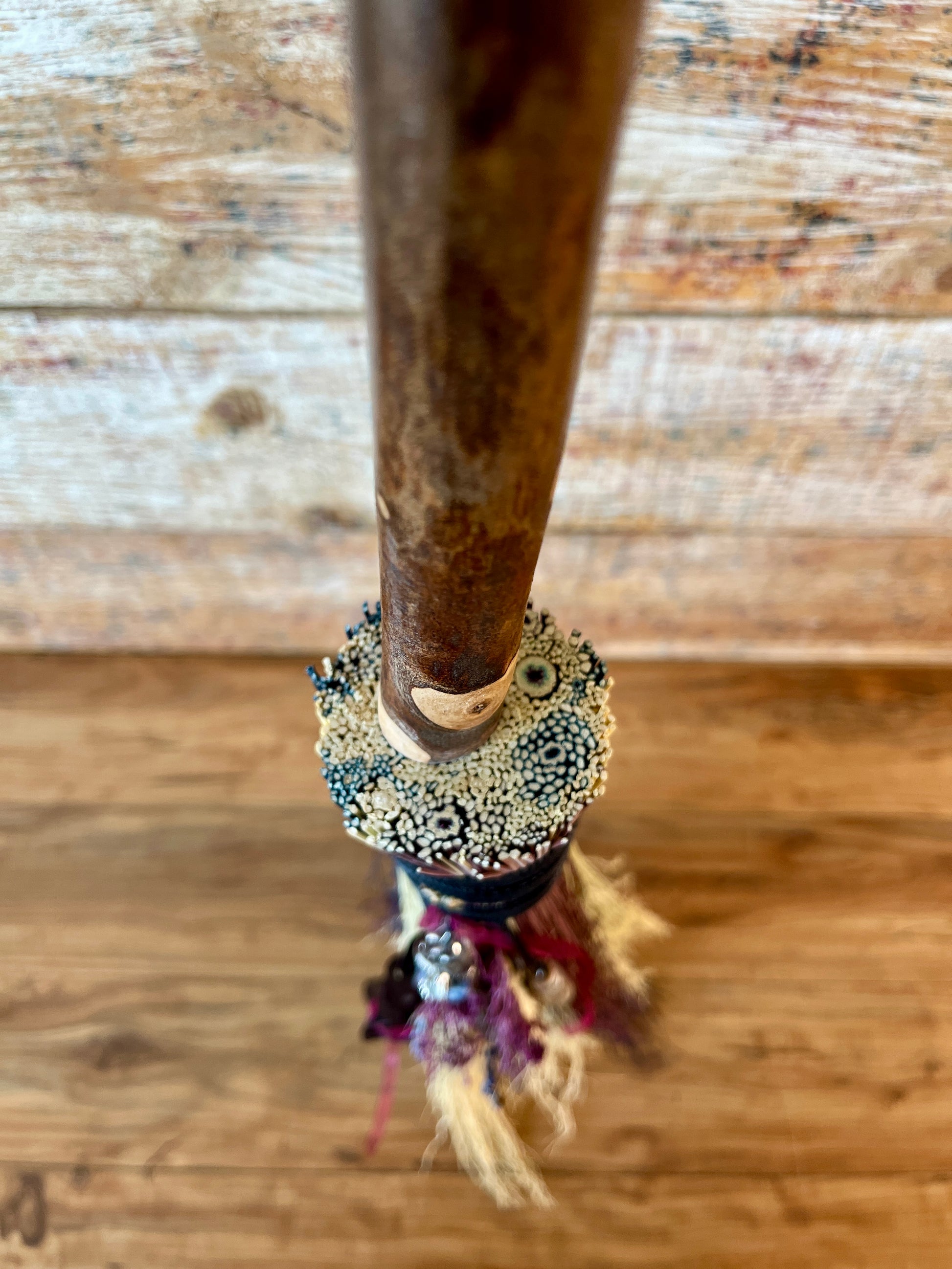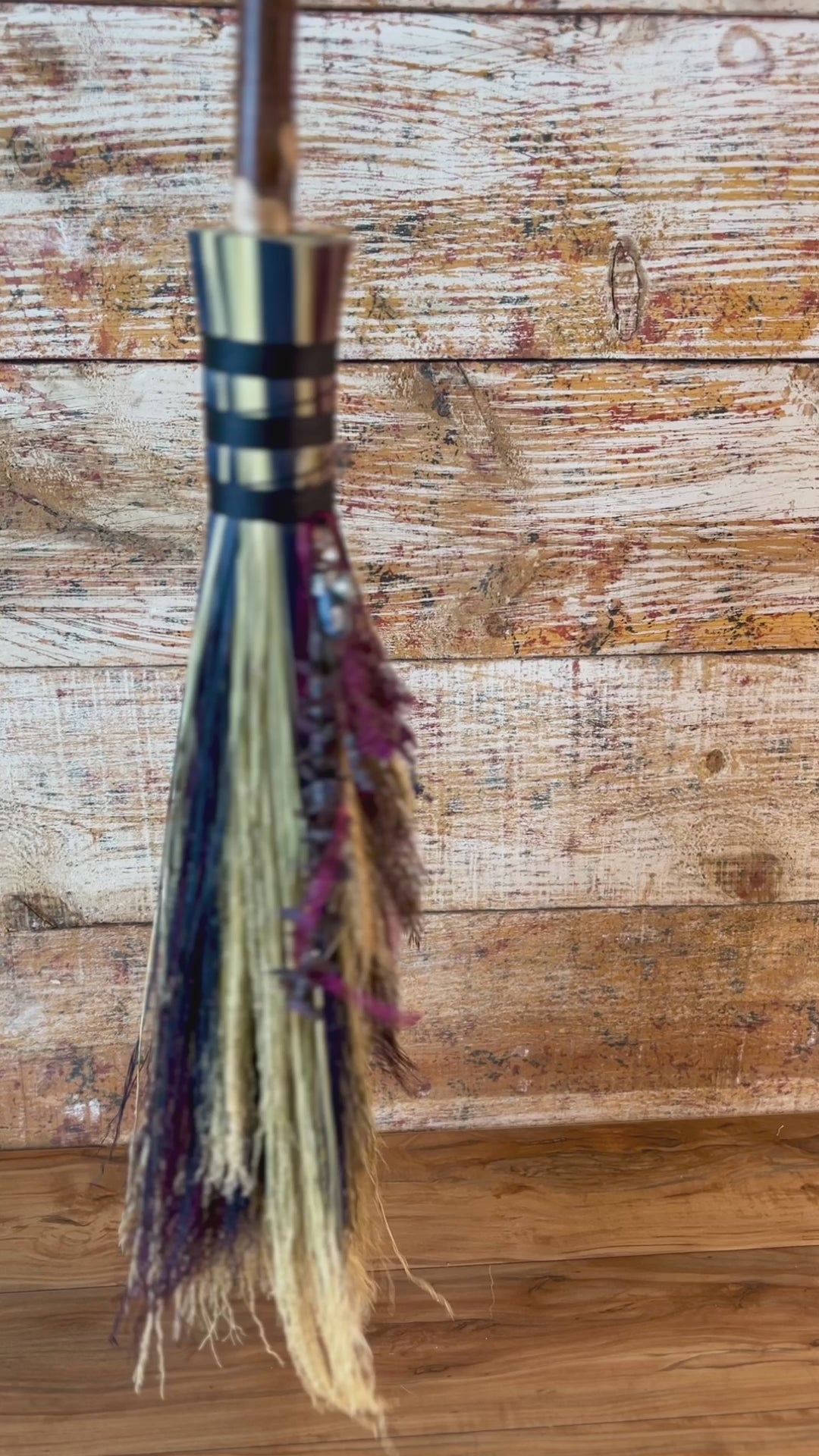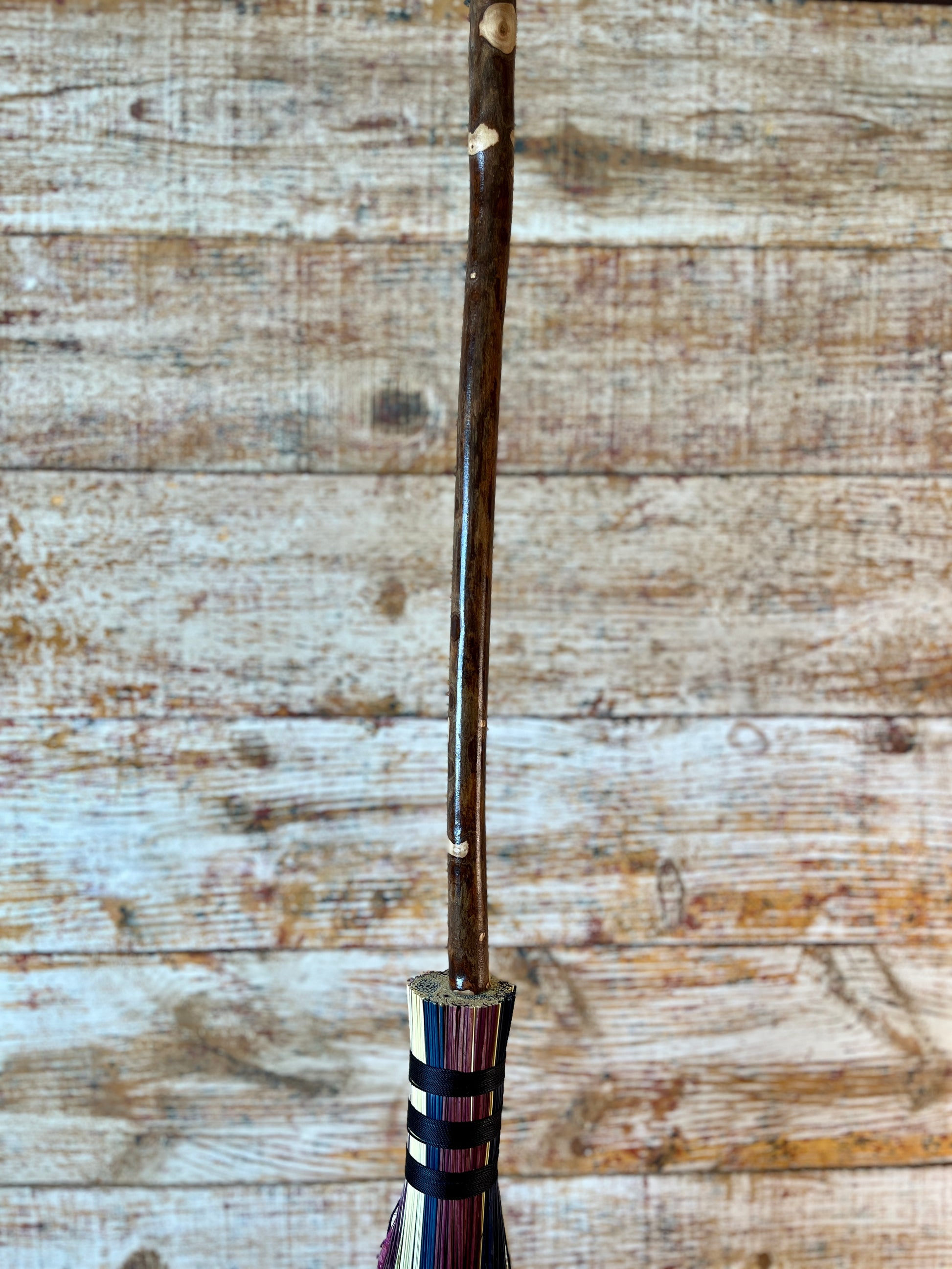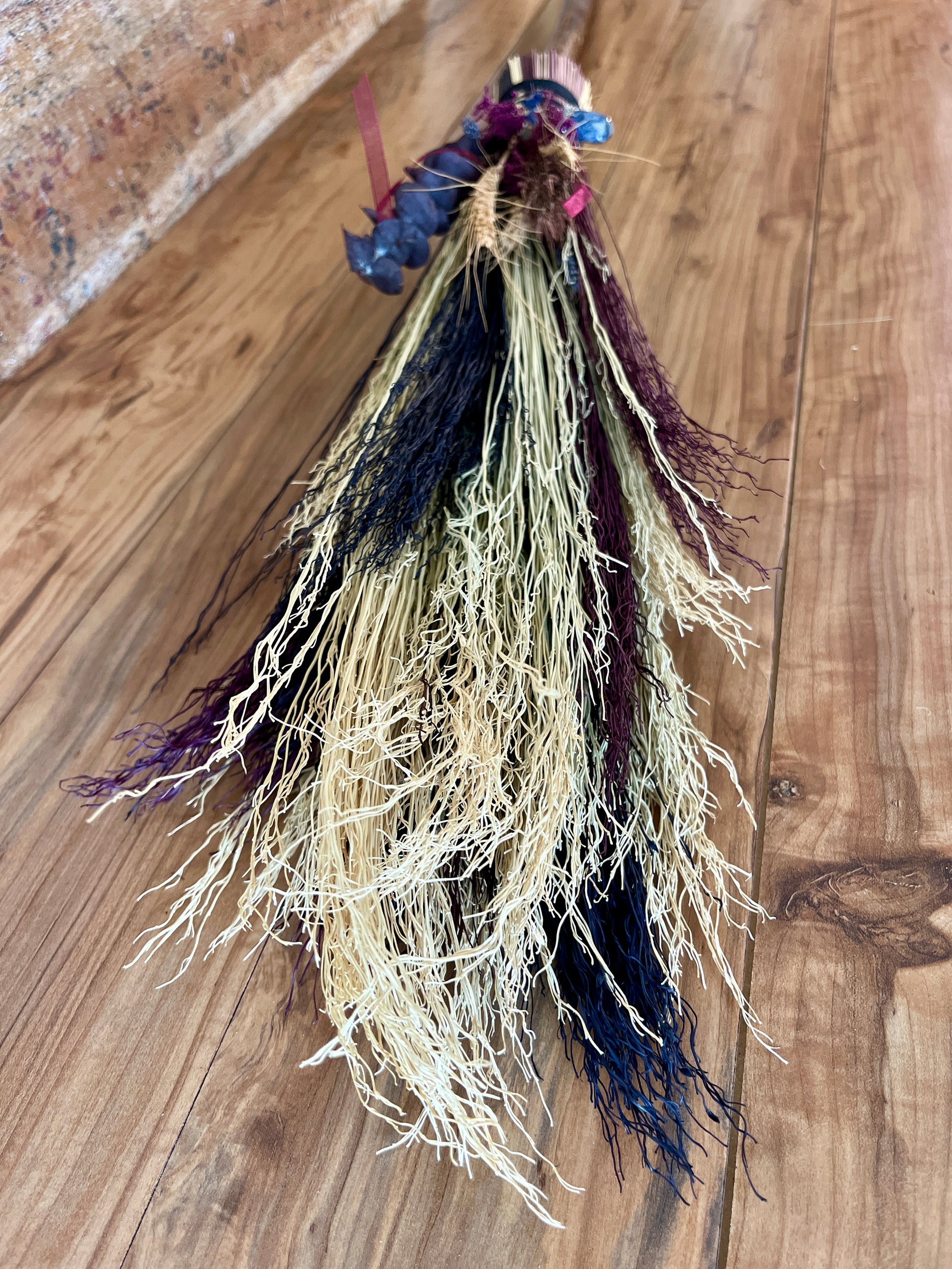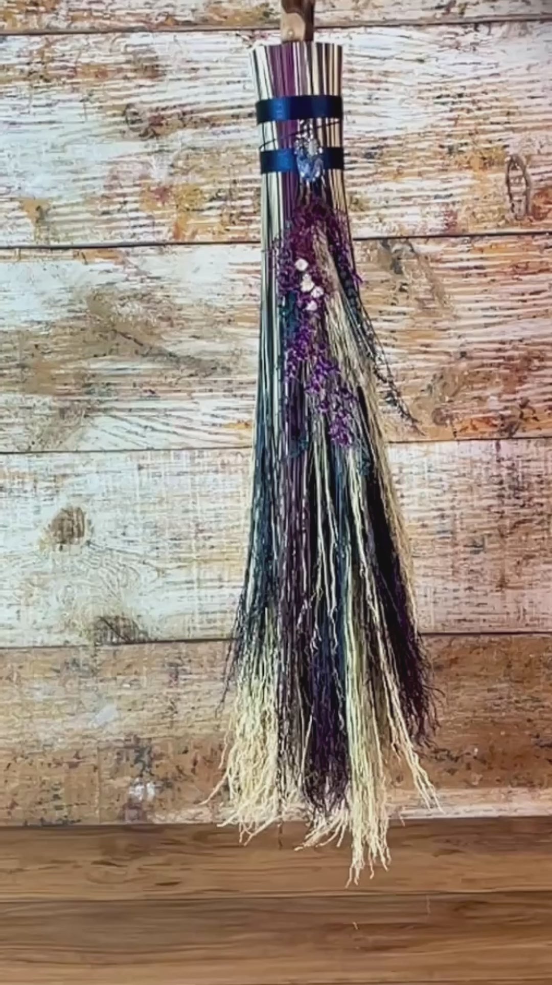 This handcrafted full-size besom stands at approximately 59 inches tall. The bristles blend natural, navy, and plum broomcorn, giving the piece a deep, steady, intentional feel. The neck is wrapped in black thread and adorned with a sodalite stone, offering a quiet, grounded presence without overwhelming the design. A small dried botanical bundle sits at the neck, adding gentle texture. A glass vial is tucked beside it, filled with herbs, spices, and crystal chips chosen to support devotion, courage, and the honoring of inner promises.