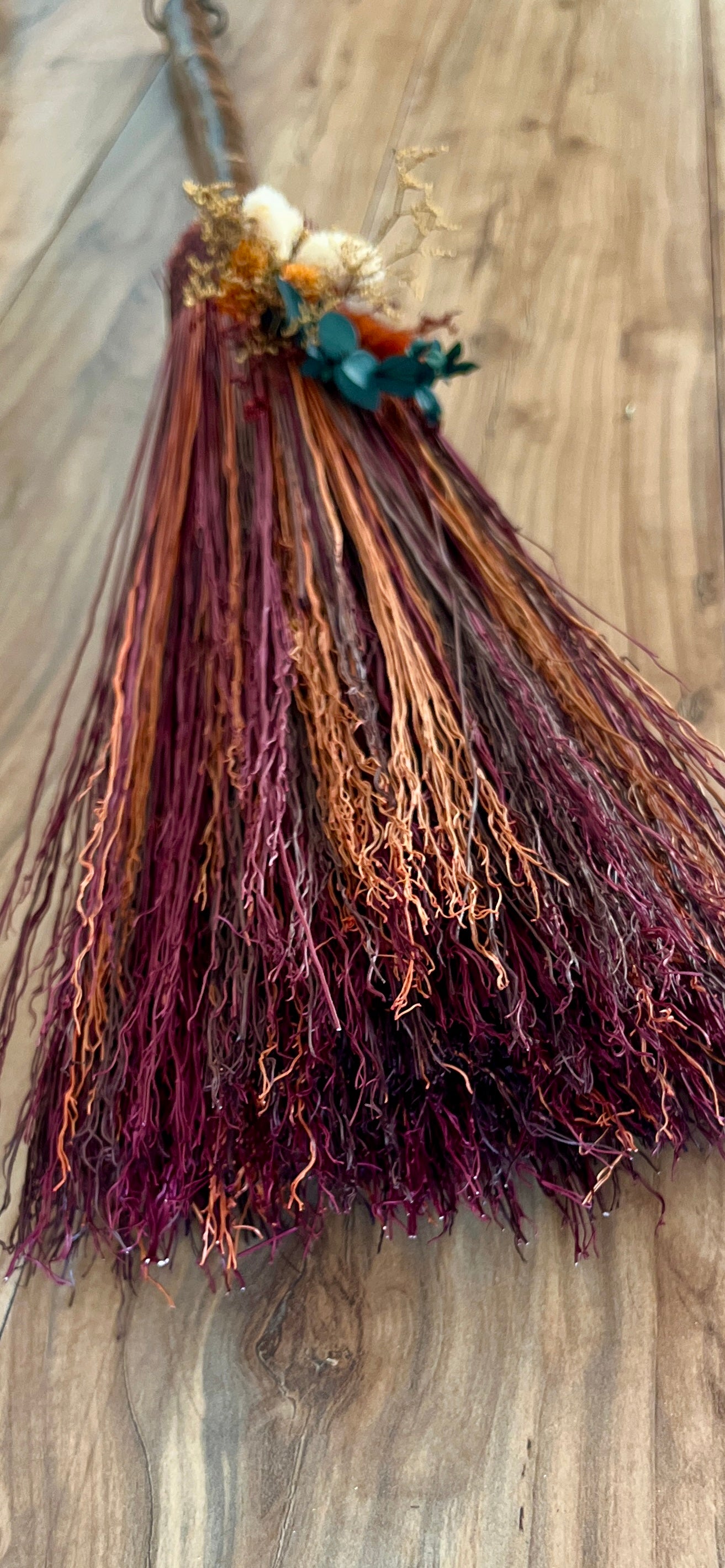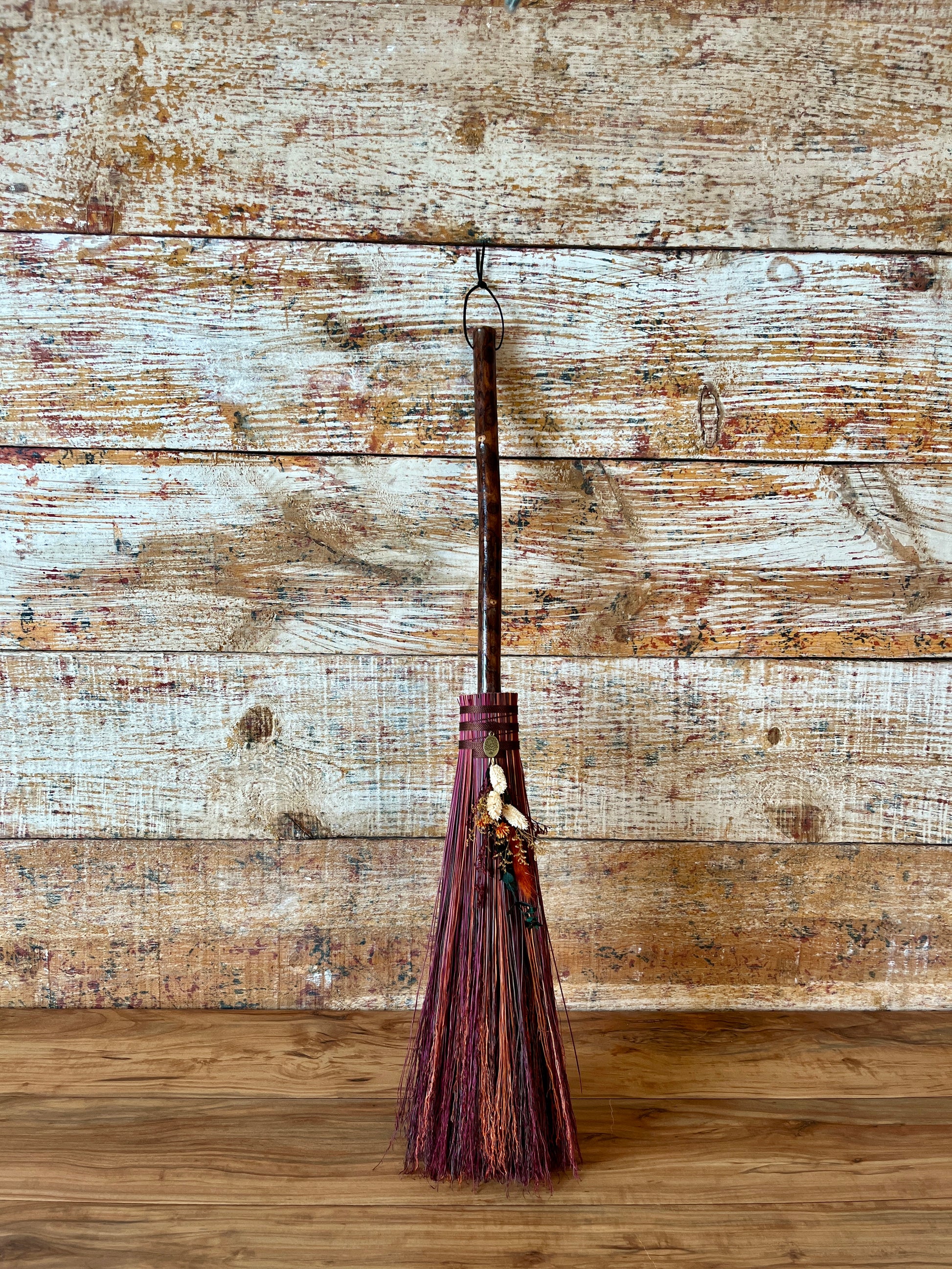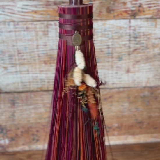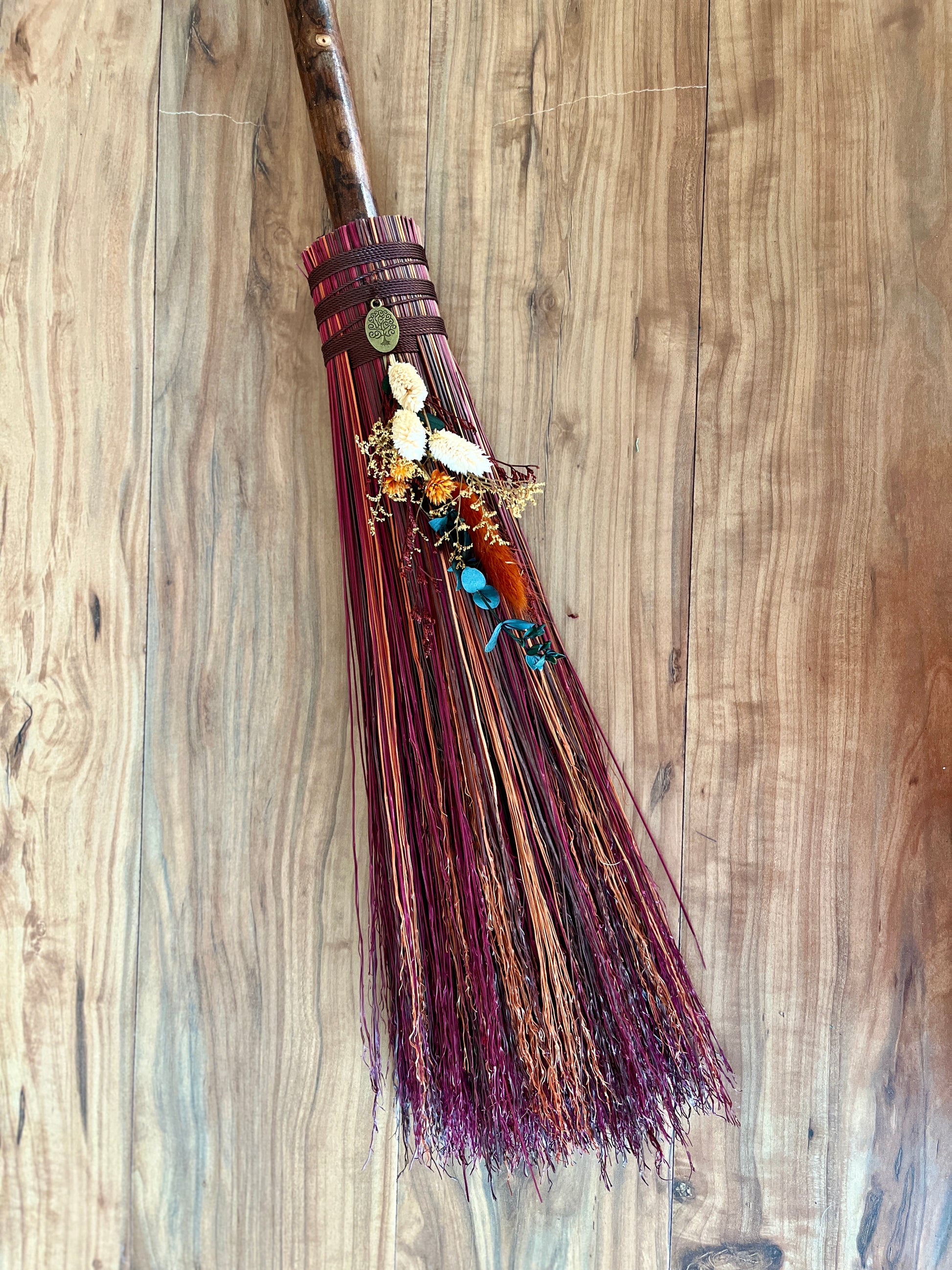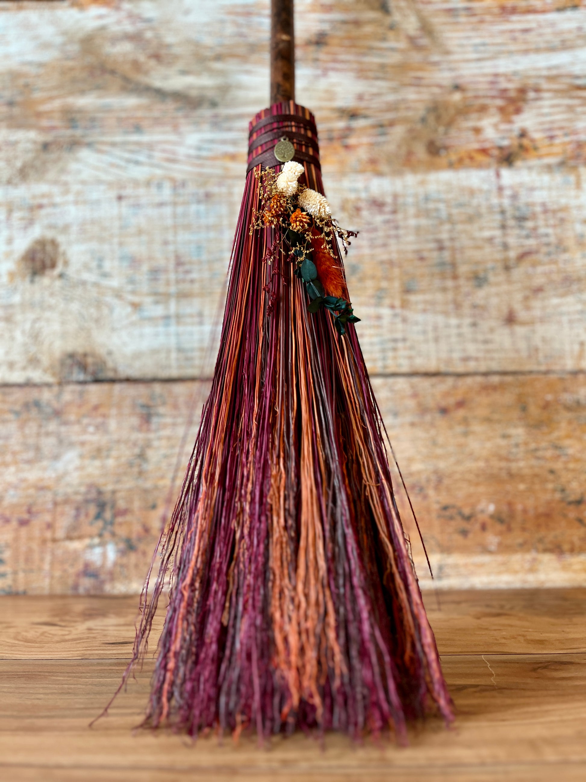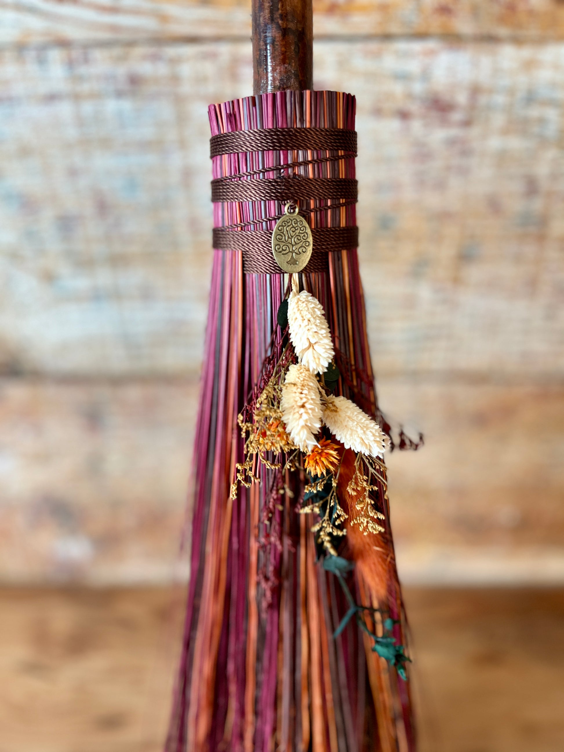 This handcrafted mini besom stands at approximately 31 inches tall. Its bristles blend deep wine, warm brown, and vivid orange, creating a rich sweep of autumn tones reminiscent of forest paths and ember-lit leaves. Wrapped in earthy brown thread, the neck features a small antique-gold Tree of Life medallion that adds a touch of rooted symbolism. The dried botanical cluster in soft creams, sunset orange, and golden brown adds texture and warmth, enhancing the natural, woodland character of the piece.