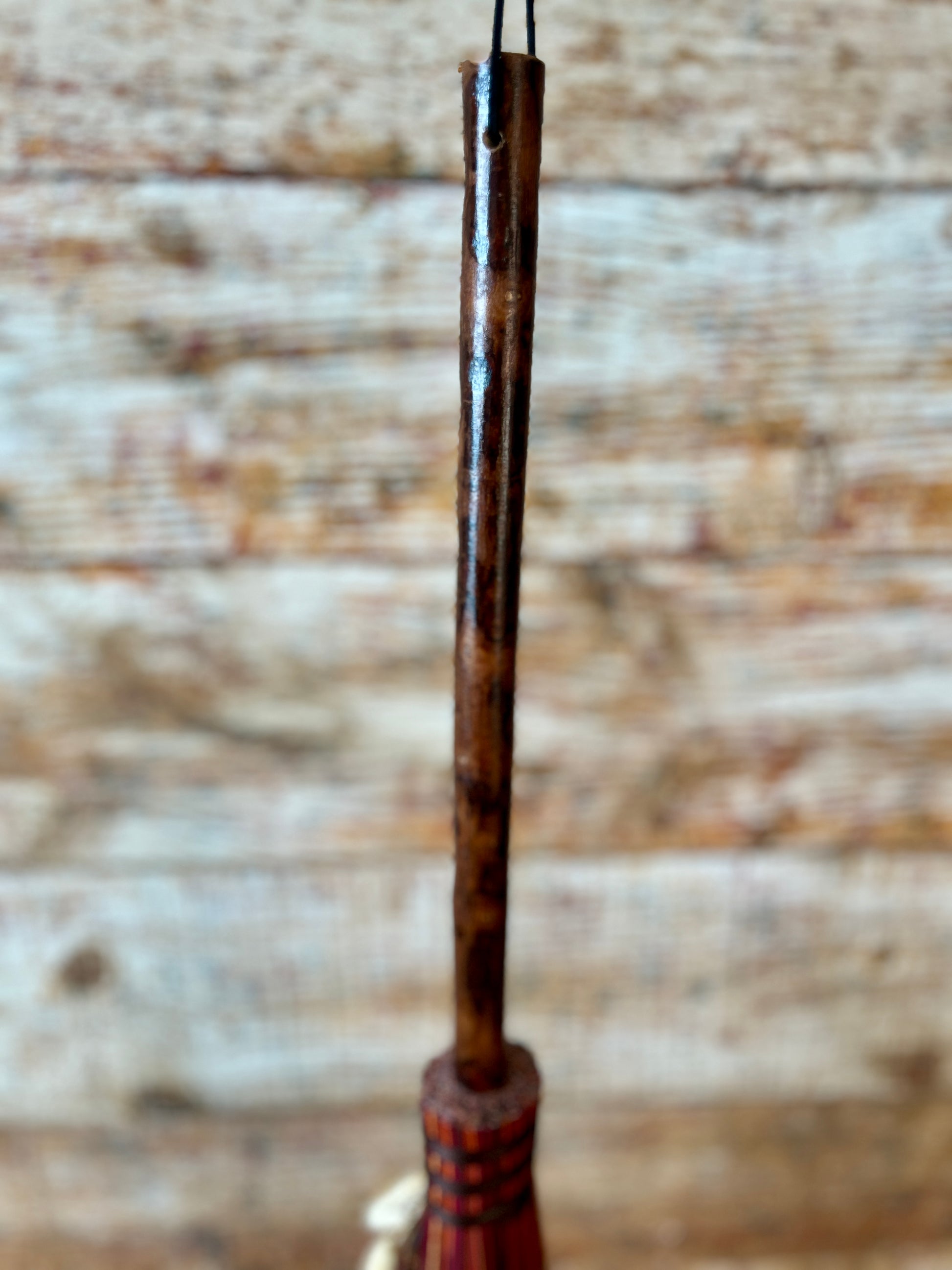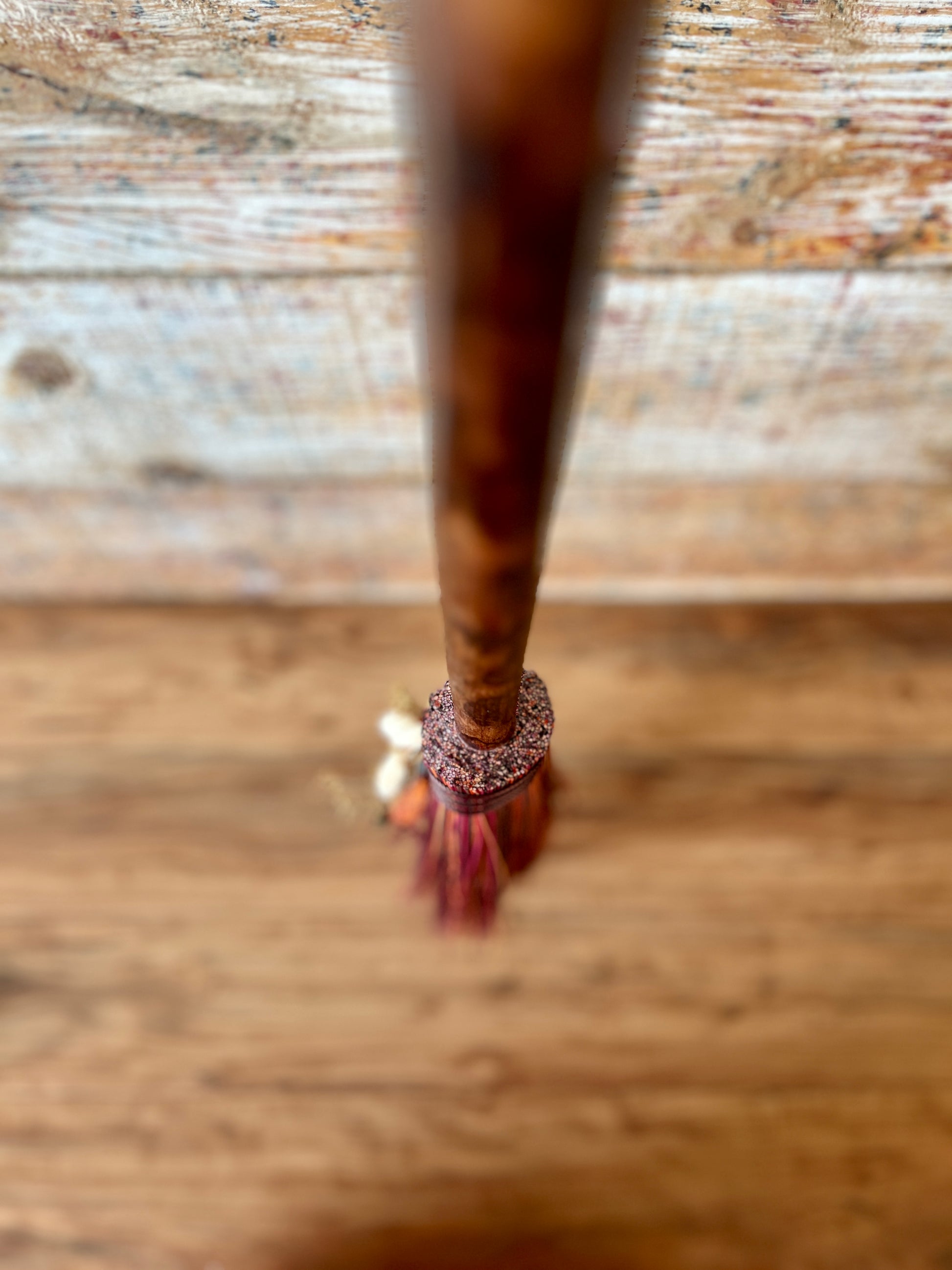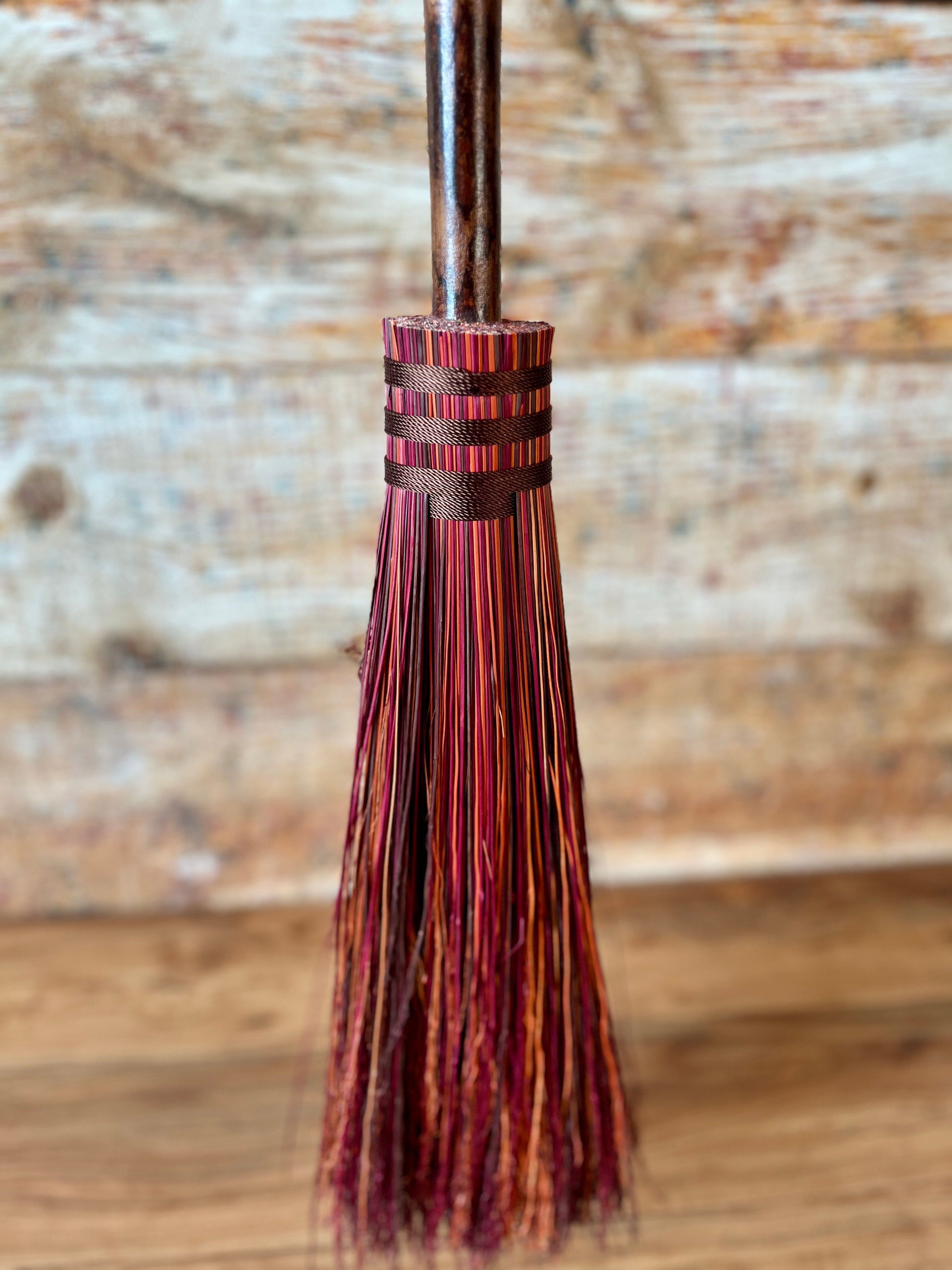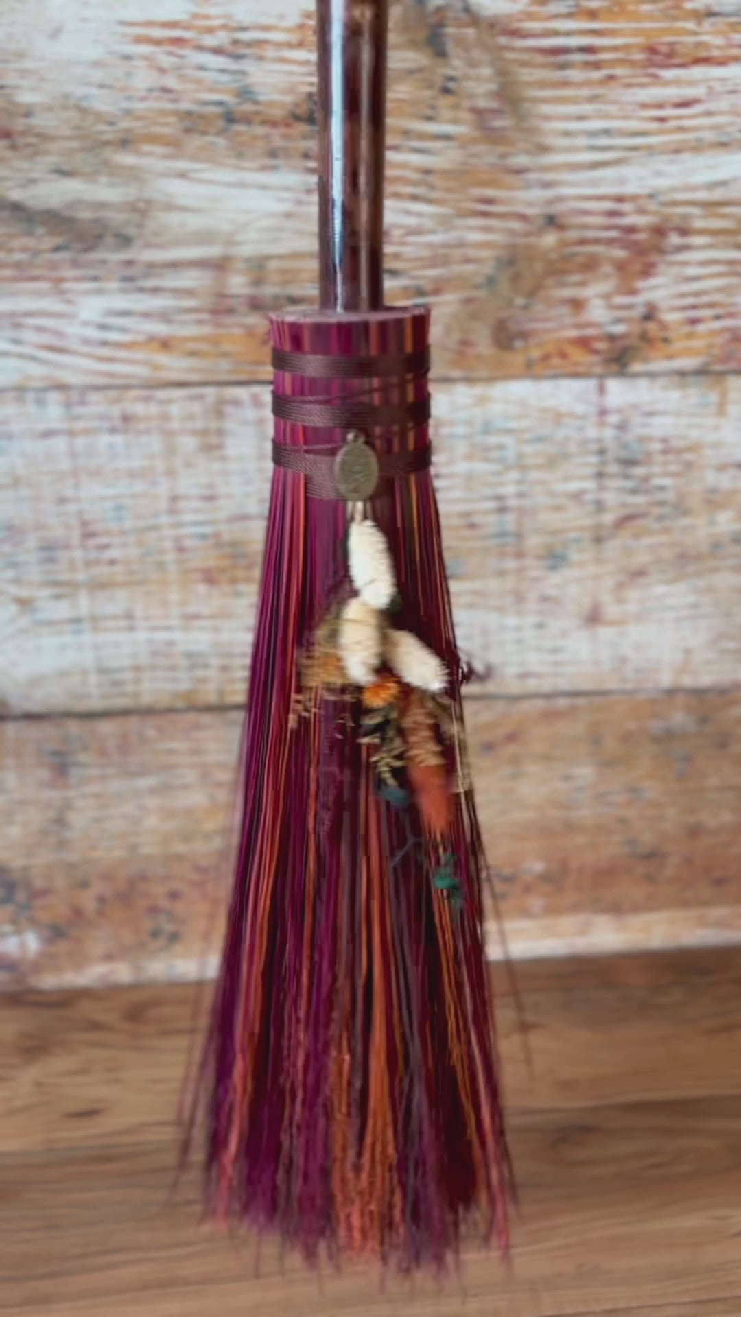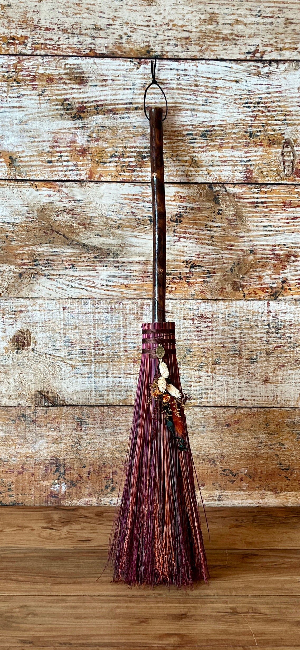 This handcrafted mini besom stands at approximately 31 inches tall. Its bristles blend deep wine, warm brown, and vivid orange, creating a rich sweep of autumn tones reminiscent of forest paths and ember-lit leaves. Wrapped in earthy brown thread, the neck features a small antique-gold Tree of Life medallion that adds a touch of rooted symbolism. The dried botanical cluster in soft creams, sunset orange, and golden brown adds texture and warmth, enhancing the natural, woodland character of the piece.
